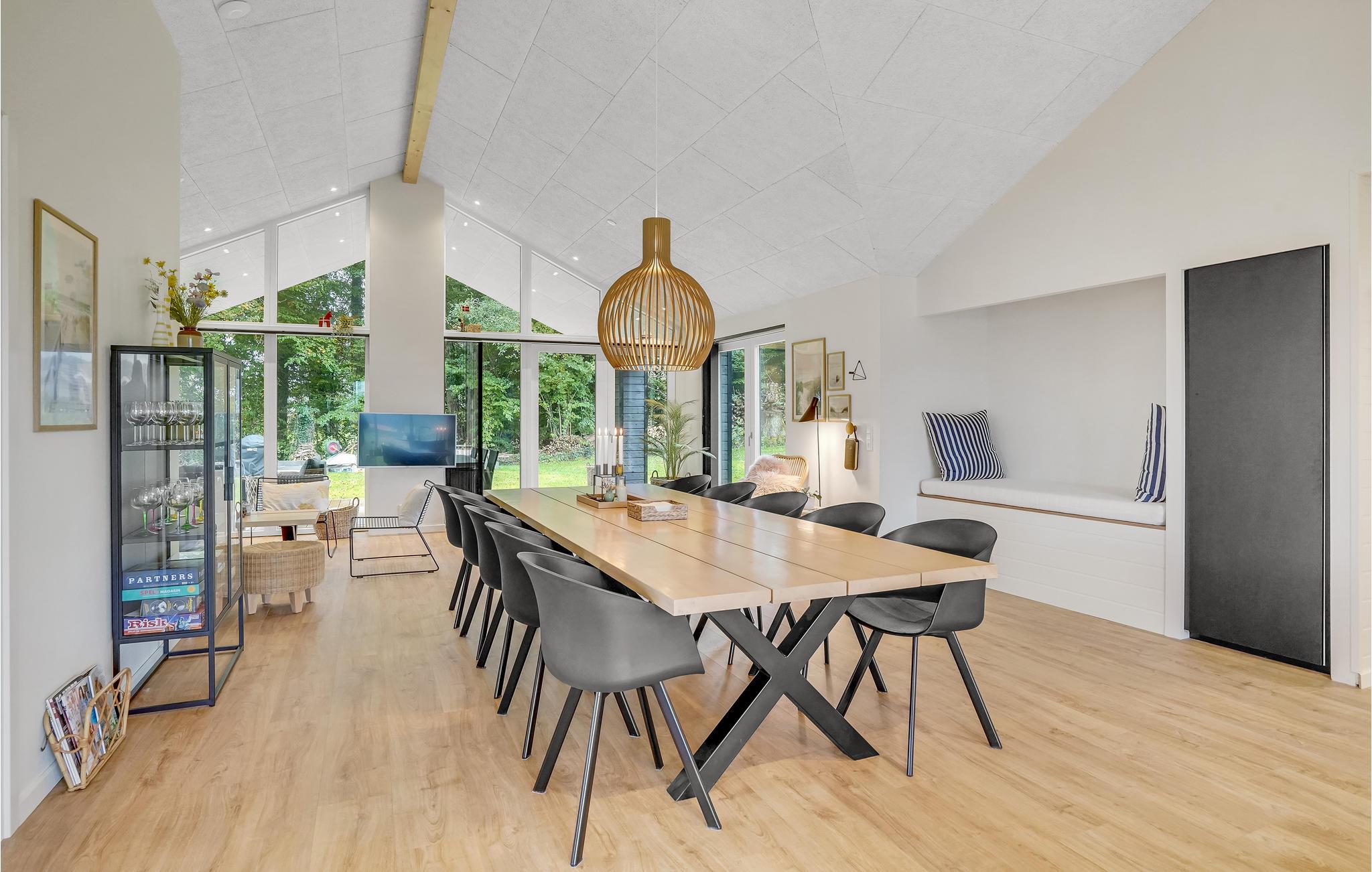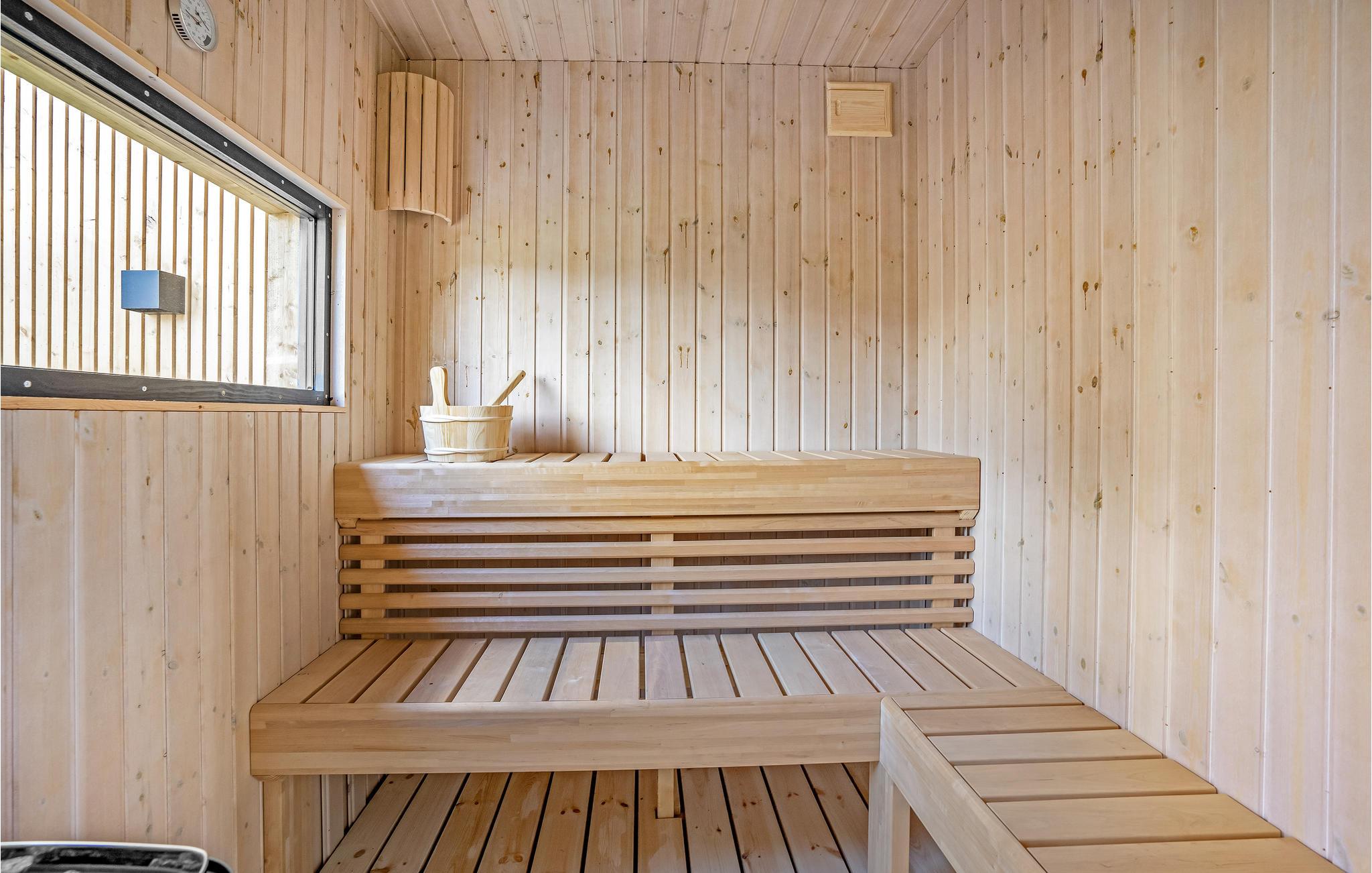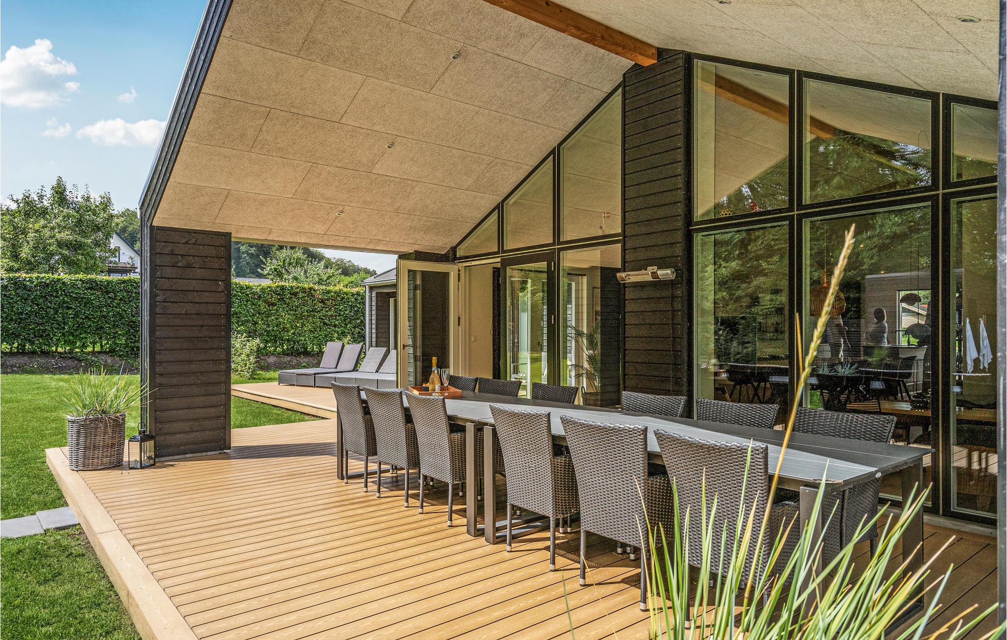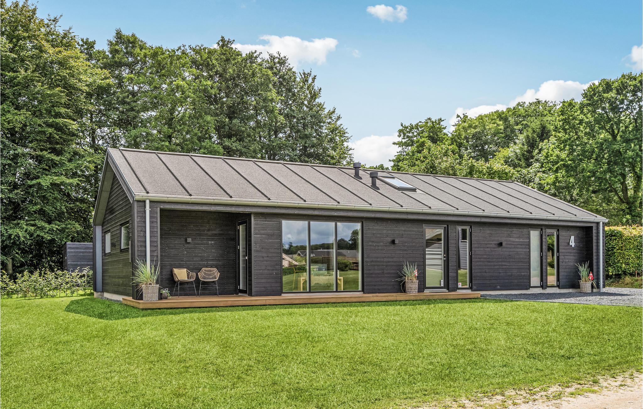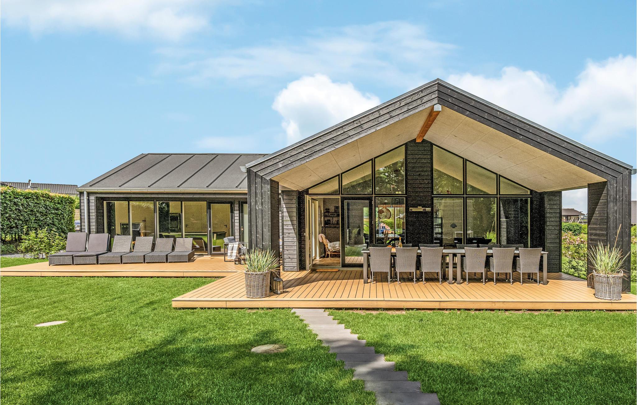 Dit lichte en moderne vakantiehuis verwelkomt maximaal twaalf volwassenen en een extra peuter met zijn vier slaapkamers, open loft, twee badkamers, woonkamer met eetkeuken en activiteitenruimte. U kunt heerlijk ontspannen in de sauna of het Finse houten bad. Op het terras kunt u 's ochtends ontbijten of de dag afsluiten met een glas wijn. Een barbecue voor gezellige barbecue-avonden staat ook tot uw beschikking. In de tuin vindt u volop ruimte om te ontspannen en te spelen.