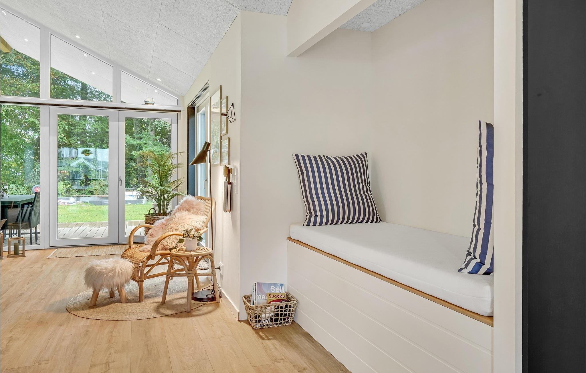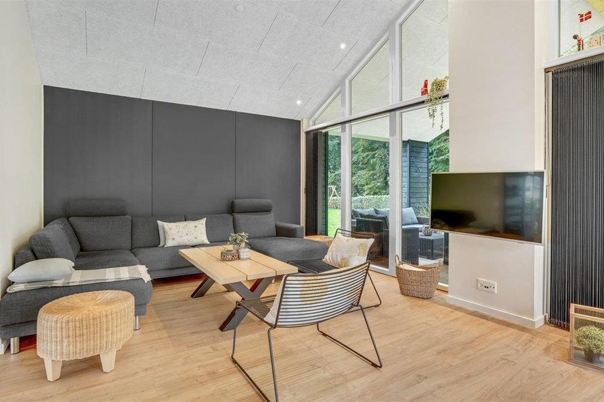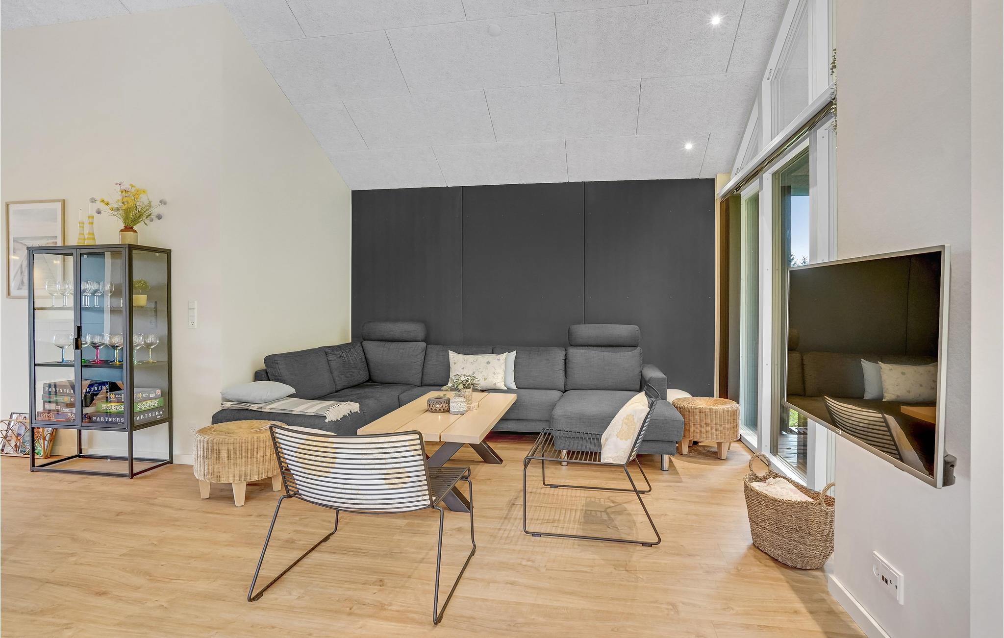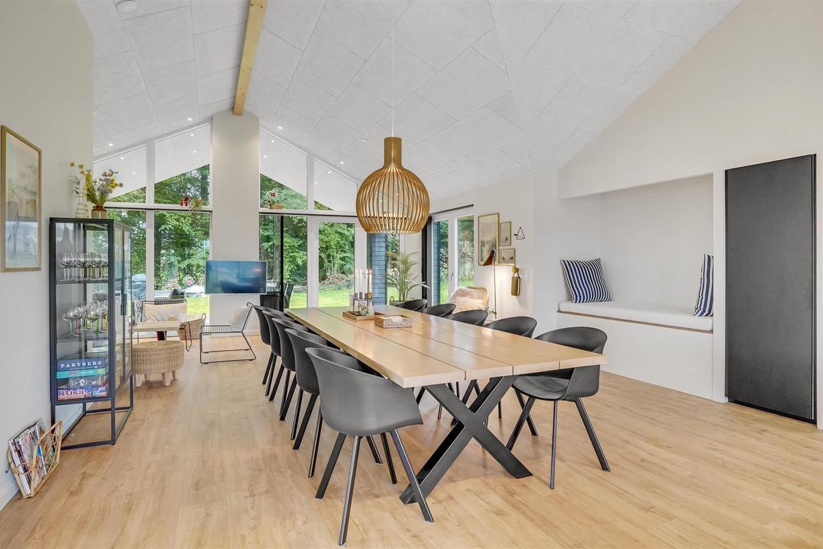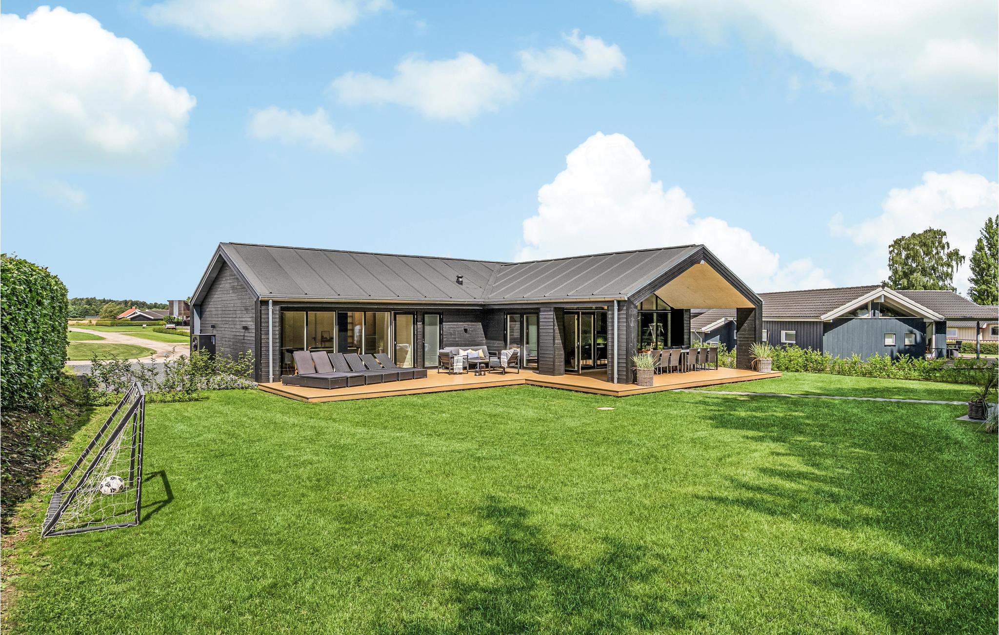 Dit lichte en moderne vakantiehuis verwelkomt maximaal twaalf volwassenen en een extra peuter met zijn vier slaapkamers, open loft, twee badkamers, woonkamer met eetkeuken en activiteitenruimte. U kunt heerlijk ontspannen in de sauna of het Finse houten bad. Op het terras kunt u 's ochtends ontbijten of de dag afsluiten met een glas wijn. Een barbecue voor gezellige barbecue-avonden staat ook tot uw beschikking. In de tuin vindt u volop ruimte om te ontspannen en te spelen.