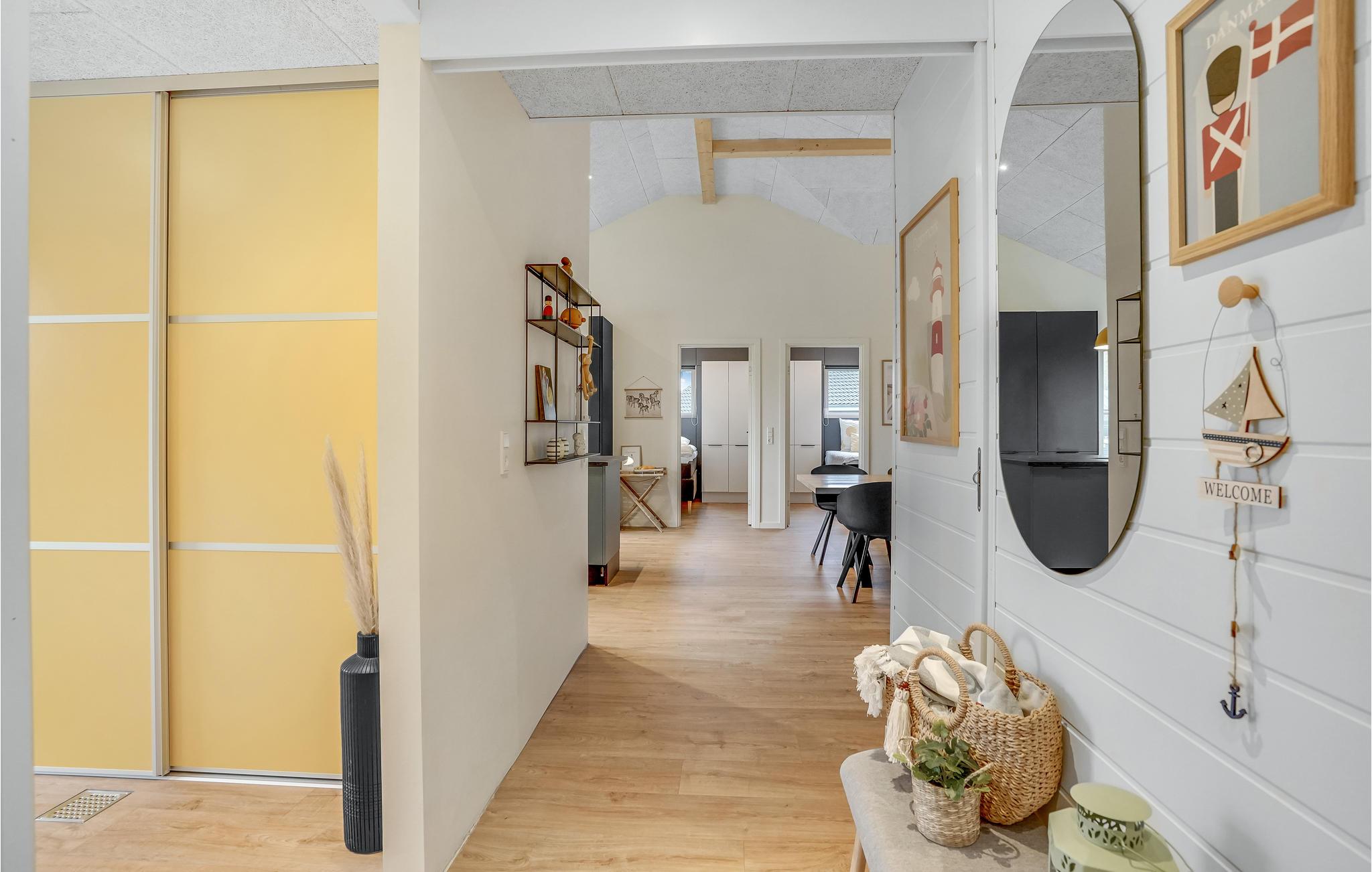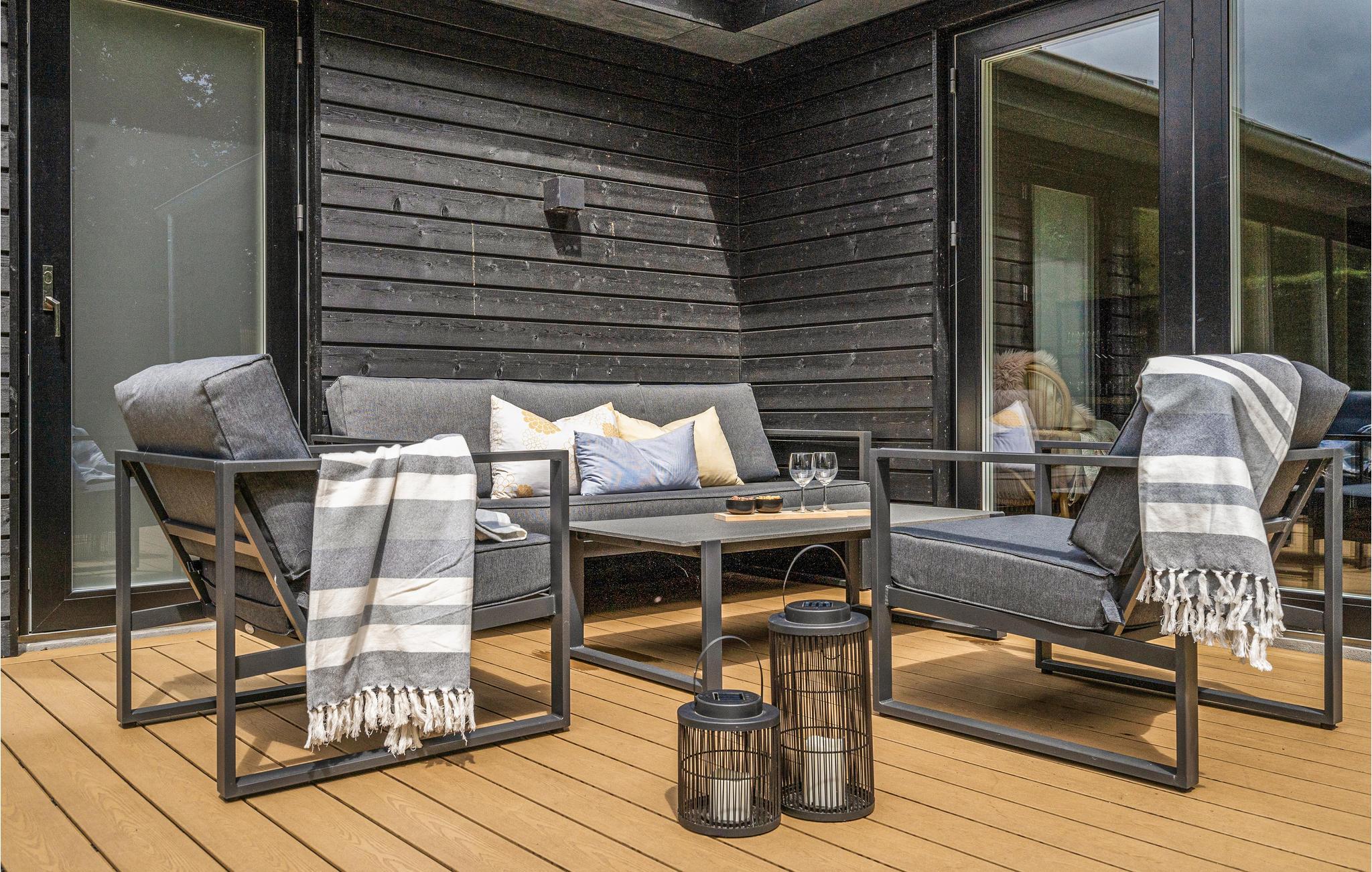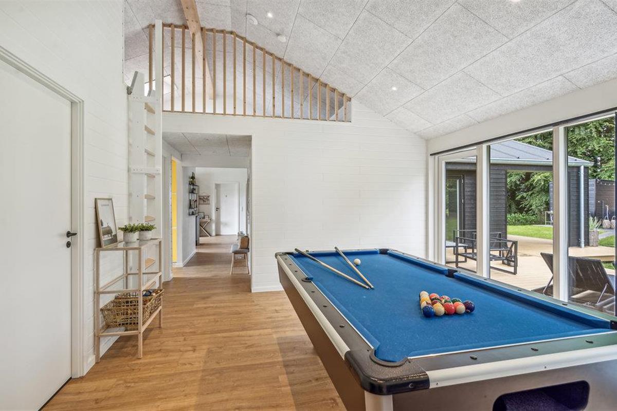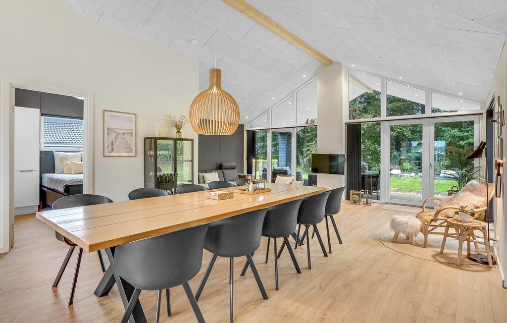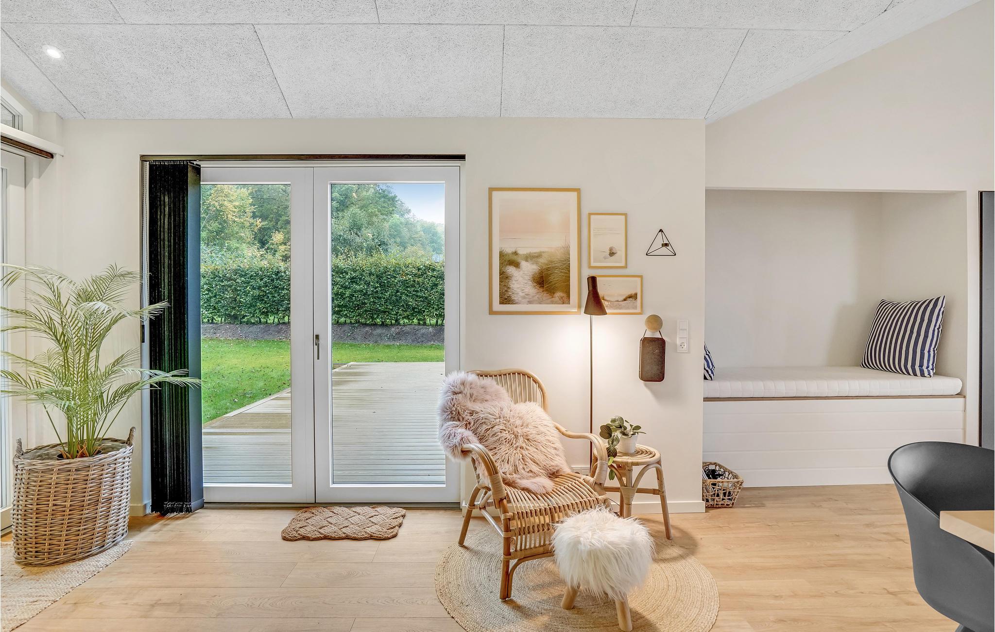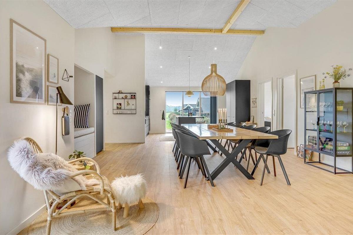 Dit lichte en moderne vakantiehuis verwelkomt maximaal twaalf volwassenen en een extra peuter met zijn vier slaapkamers, open loft, twee badkamers, woonkamer met eetkeuken en activiteitenruimte. U kunt heerlijk ontspannen in de sauna of het Finse houten bad. Op het terras kunt u 's ochtends ontbijten of de dag afsluiten met een glas wijn. Een barbecue voor gezellige barbecue-avonden staat ook tot uw beschikking. In de tuin vindt u volop ruimte om te ontspannen en te spelen.