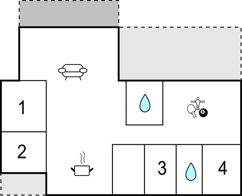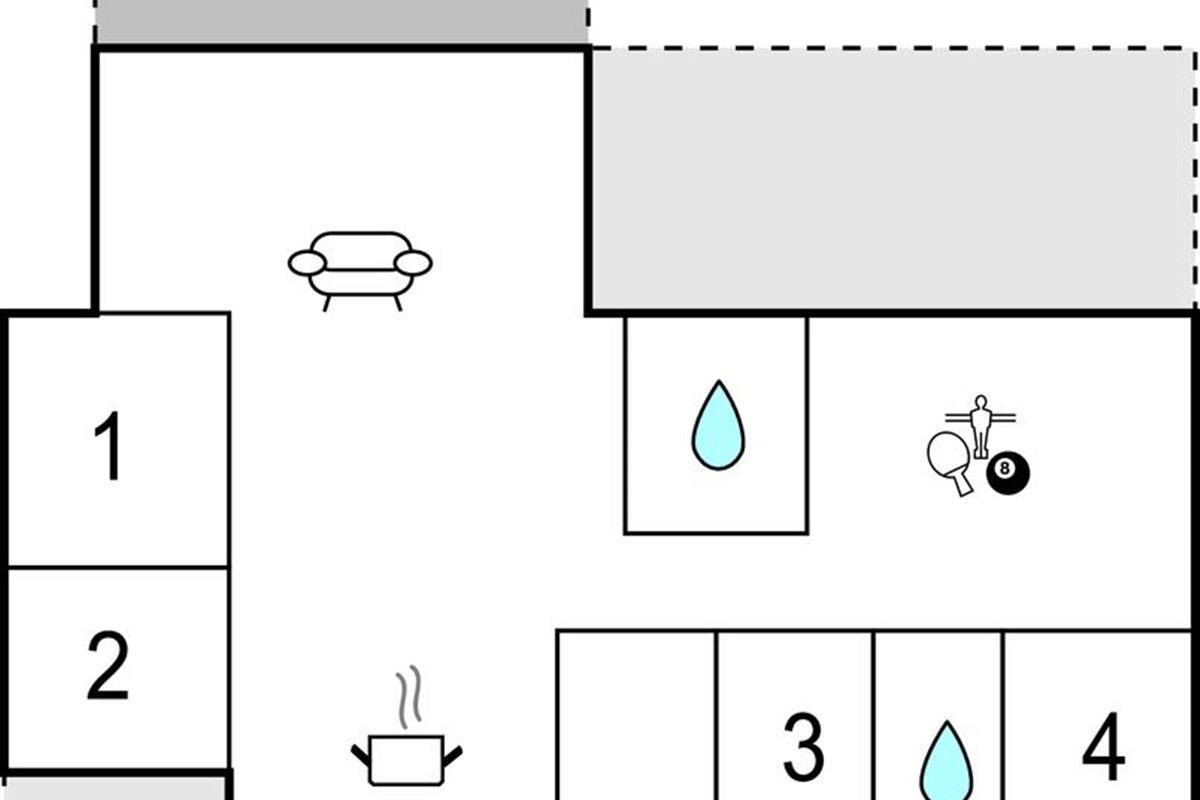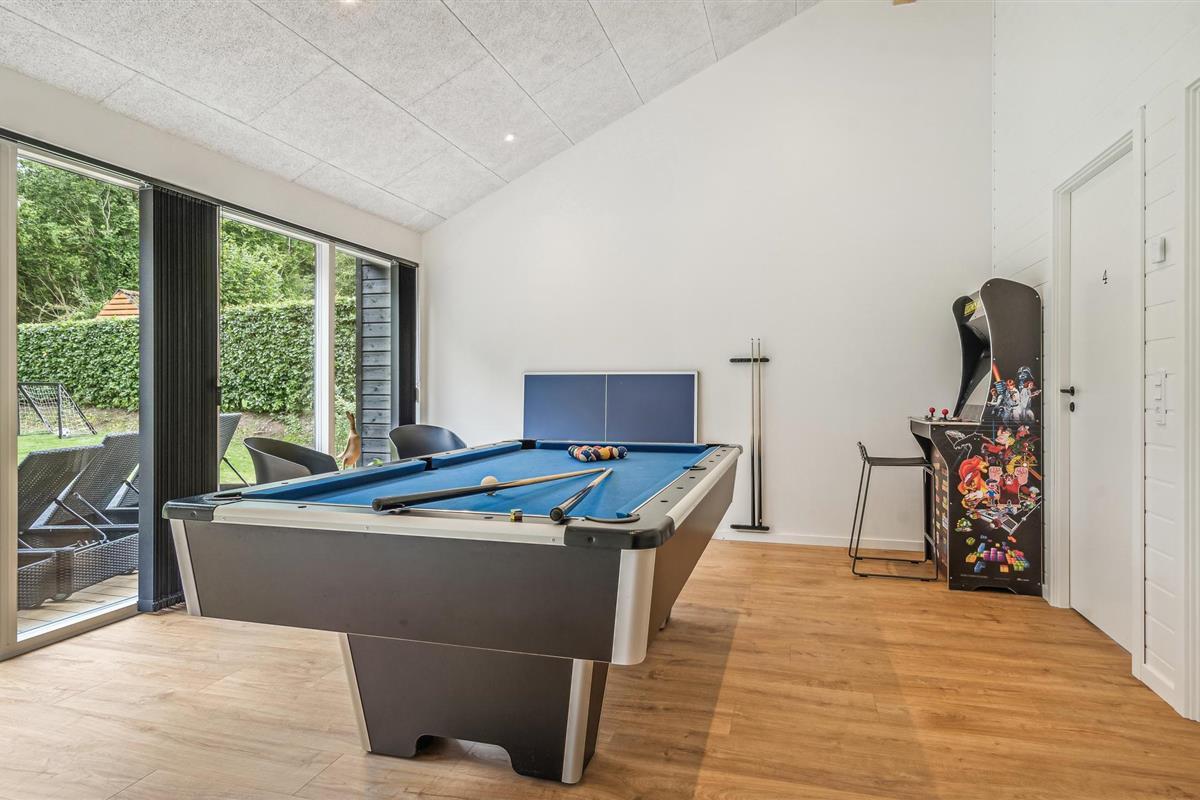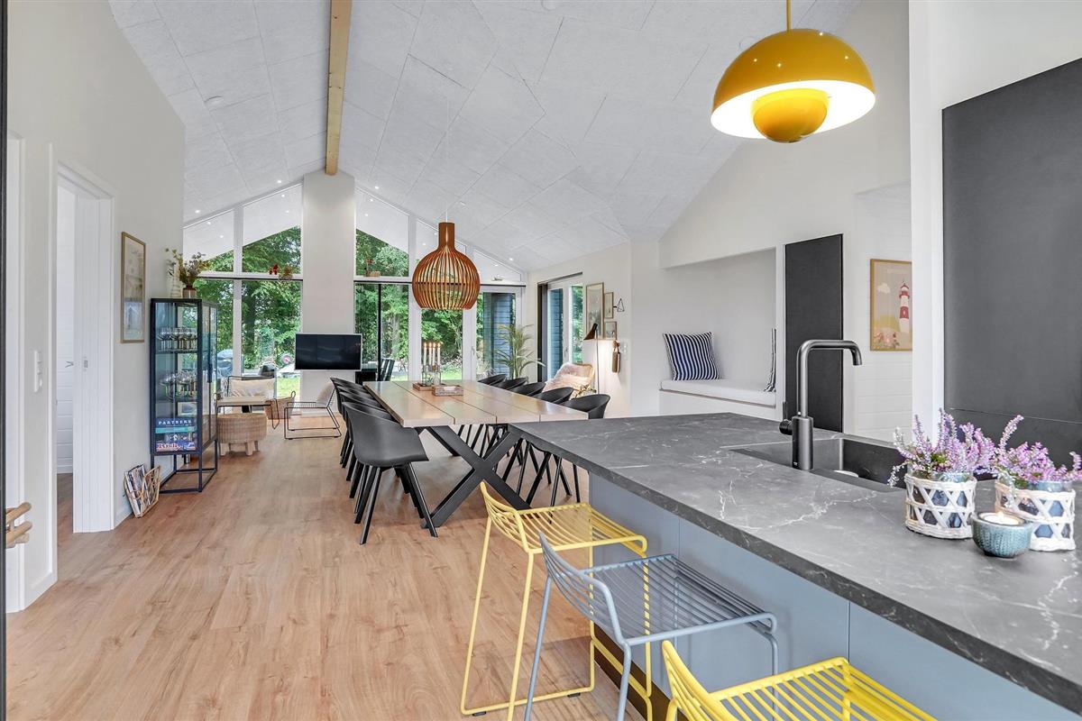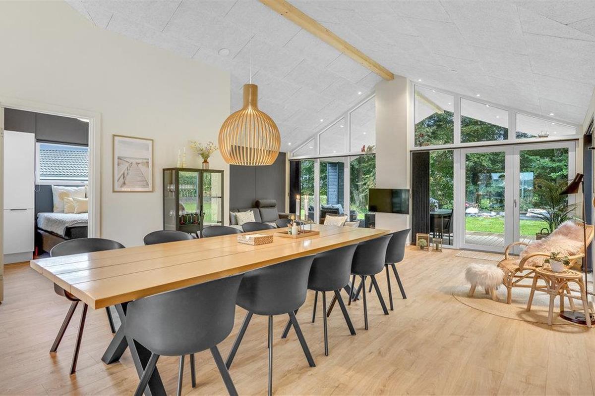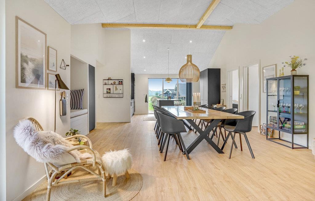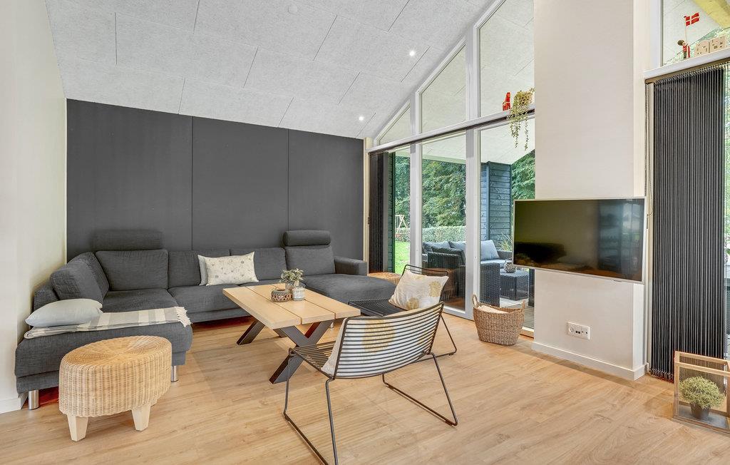 Dit lichte en moderne vakantiehuis verwelkomt maximaal twaalf volwassenen en een extra peuter met zijn vier slaapkamers, open loft, twee badkamers, woonkamer met eetkeuken en activiteitenruimte. U kunt heerlijk ontspannen in de sauna of het Finse houten bad. Op het terras kunt u 's ochtends ontbijten of de dag afsluiten met een glas wijn. Een barbecue voor gezellige barbecue-avonden staat ook tot uw beschikking. In de tuin vindt u volop ruimte om te ontspannen en te spelen.