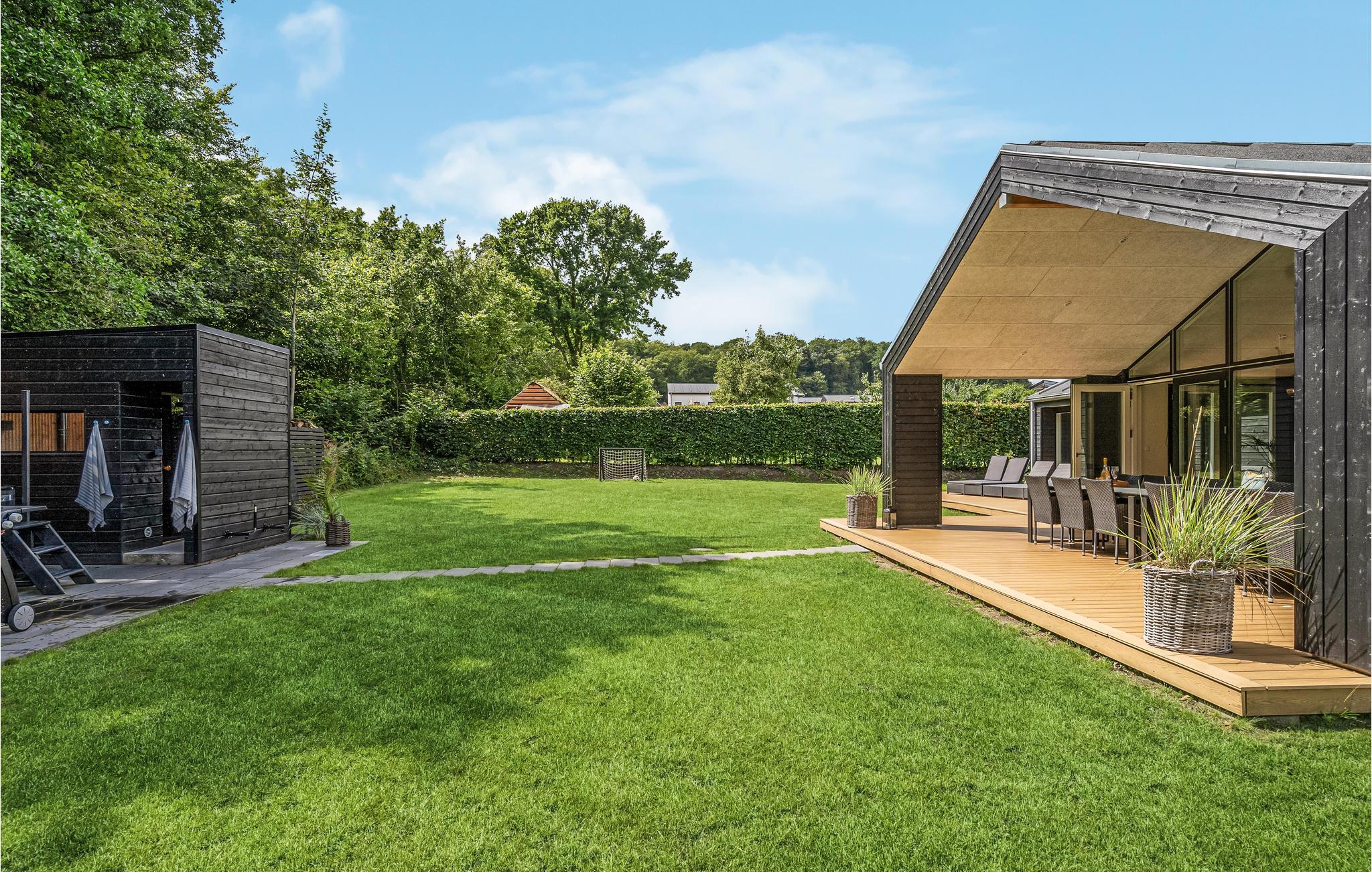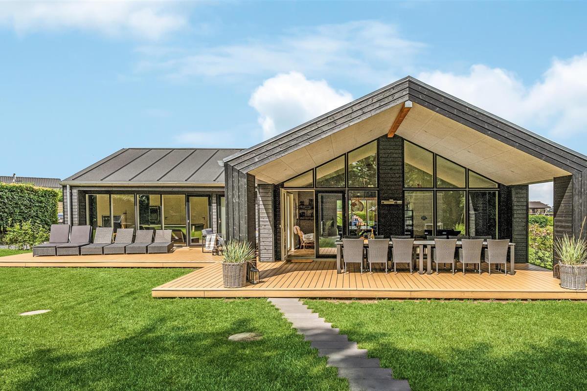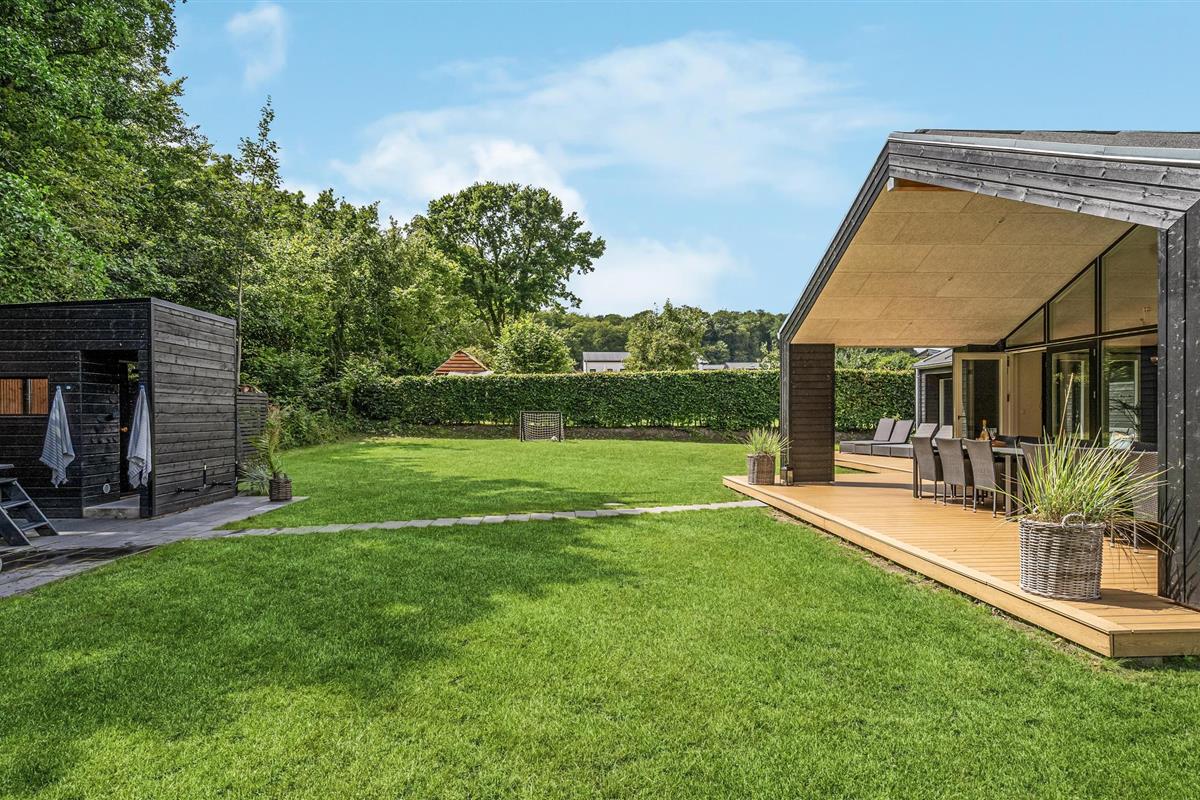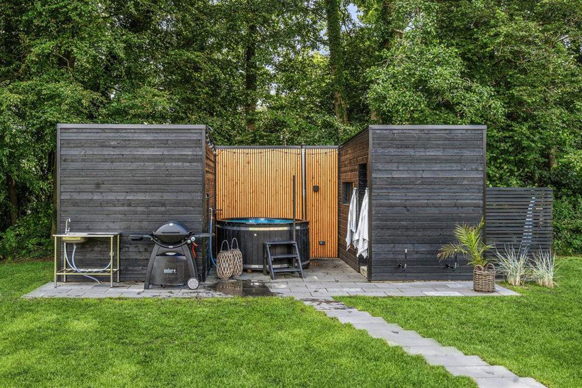 Modern vakantiehuis vlak bij het strand met sauna, hot tub en ruime tuin voor ontspanning.