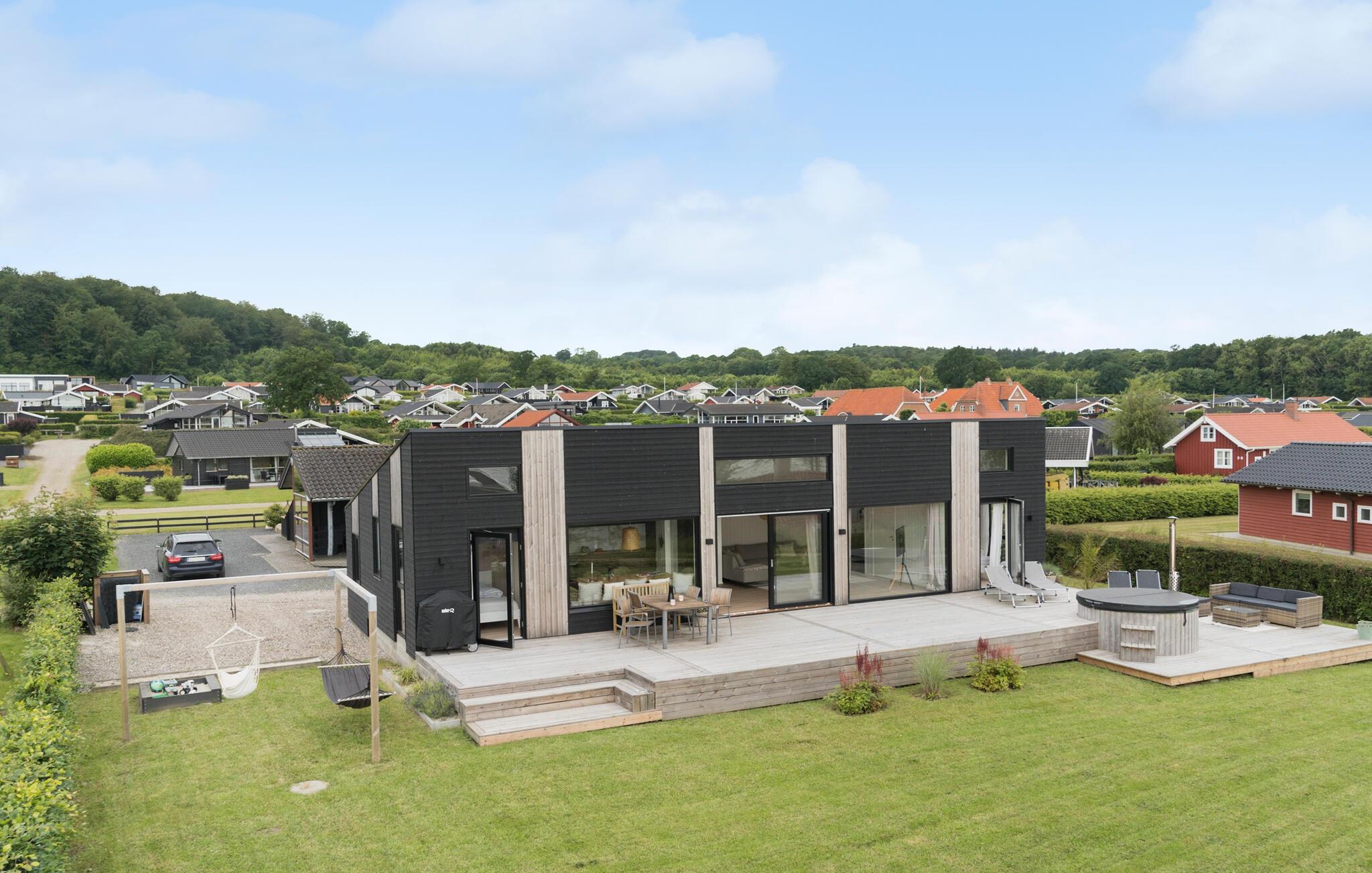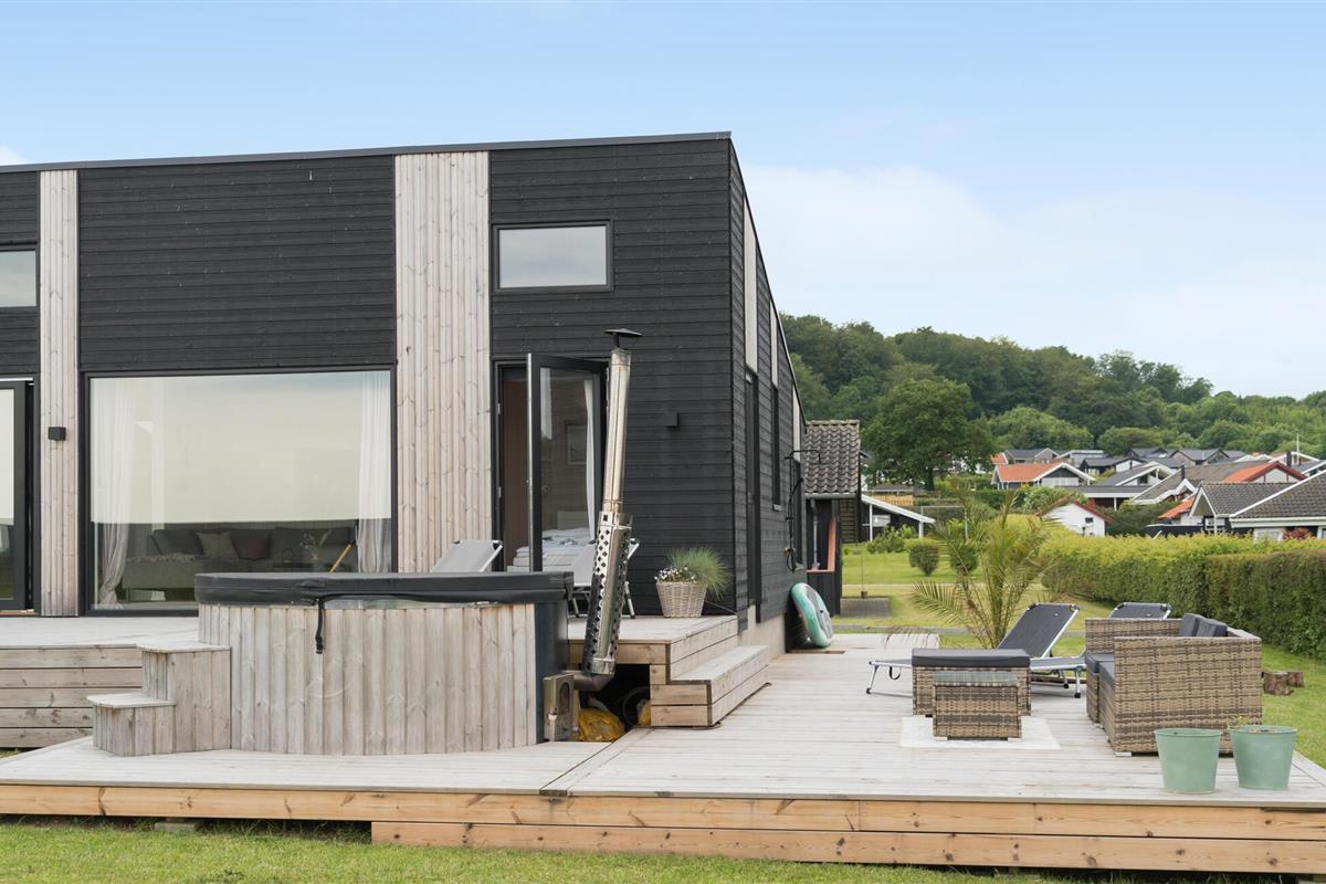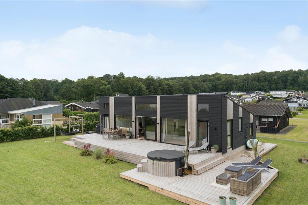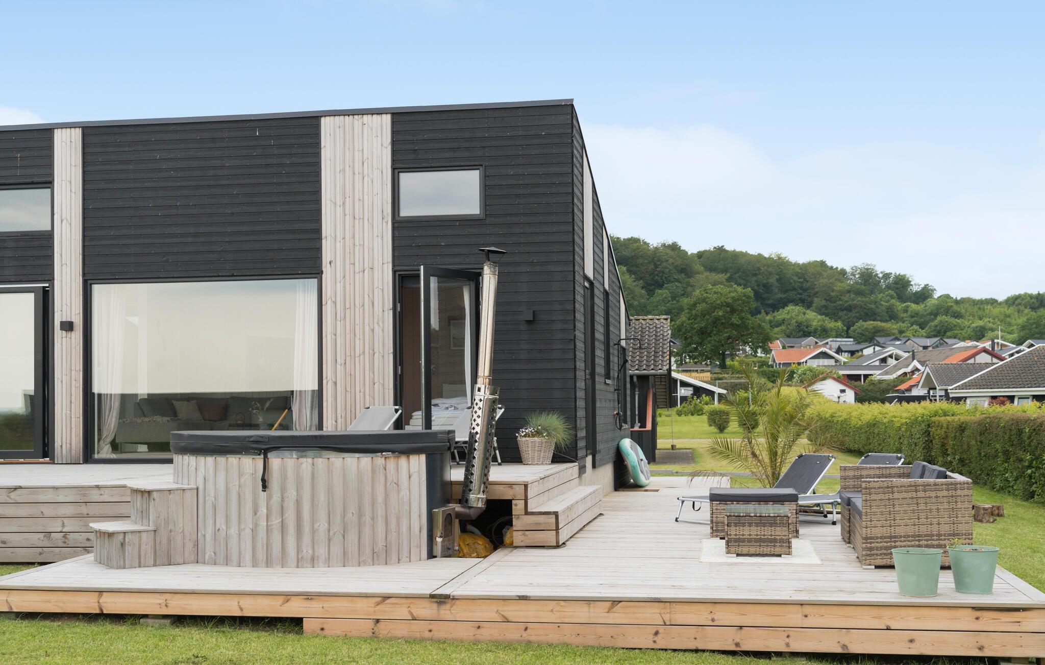 Modern vakantiehuis met zeezicht, terras, hot tub en ruime tuin bij Grønninghoved Strand.