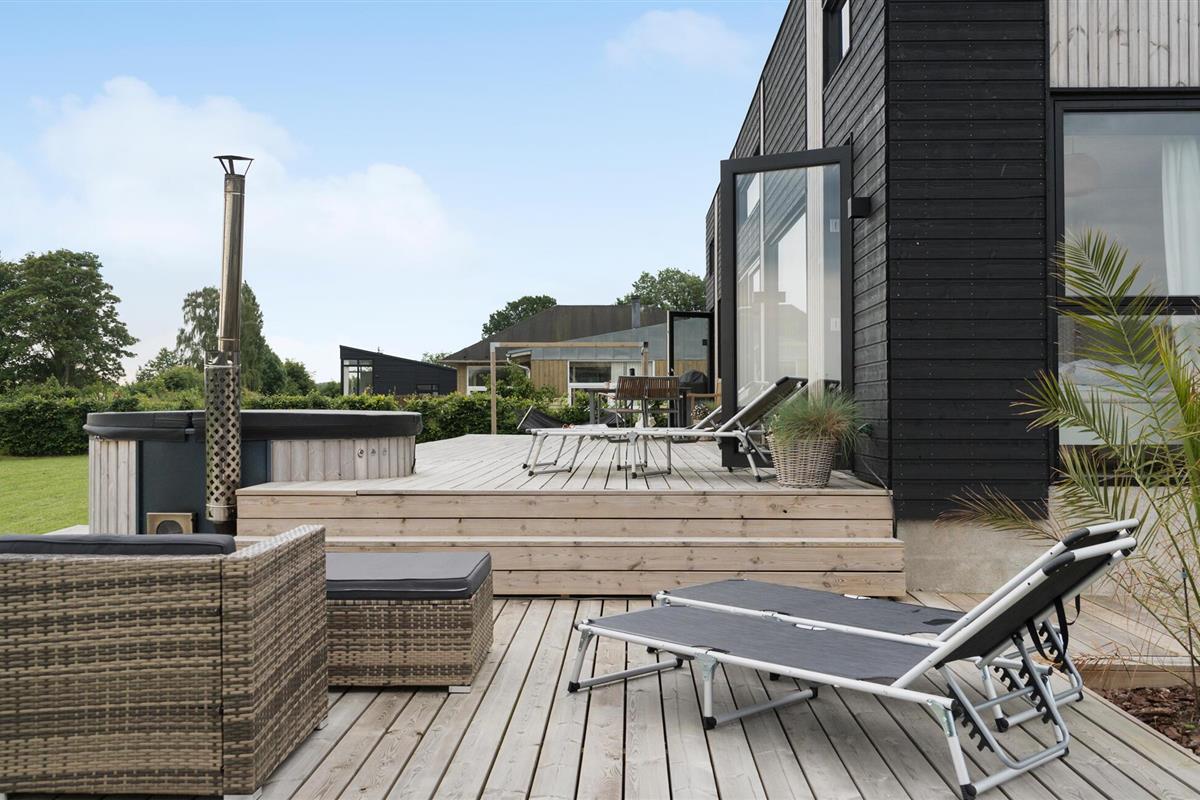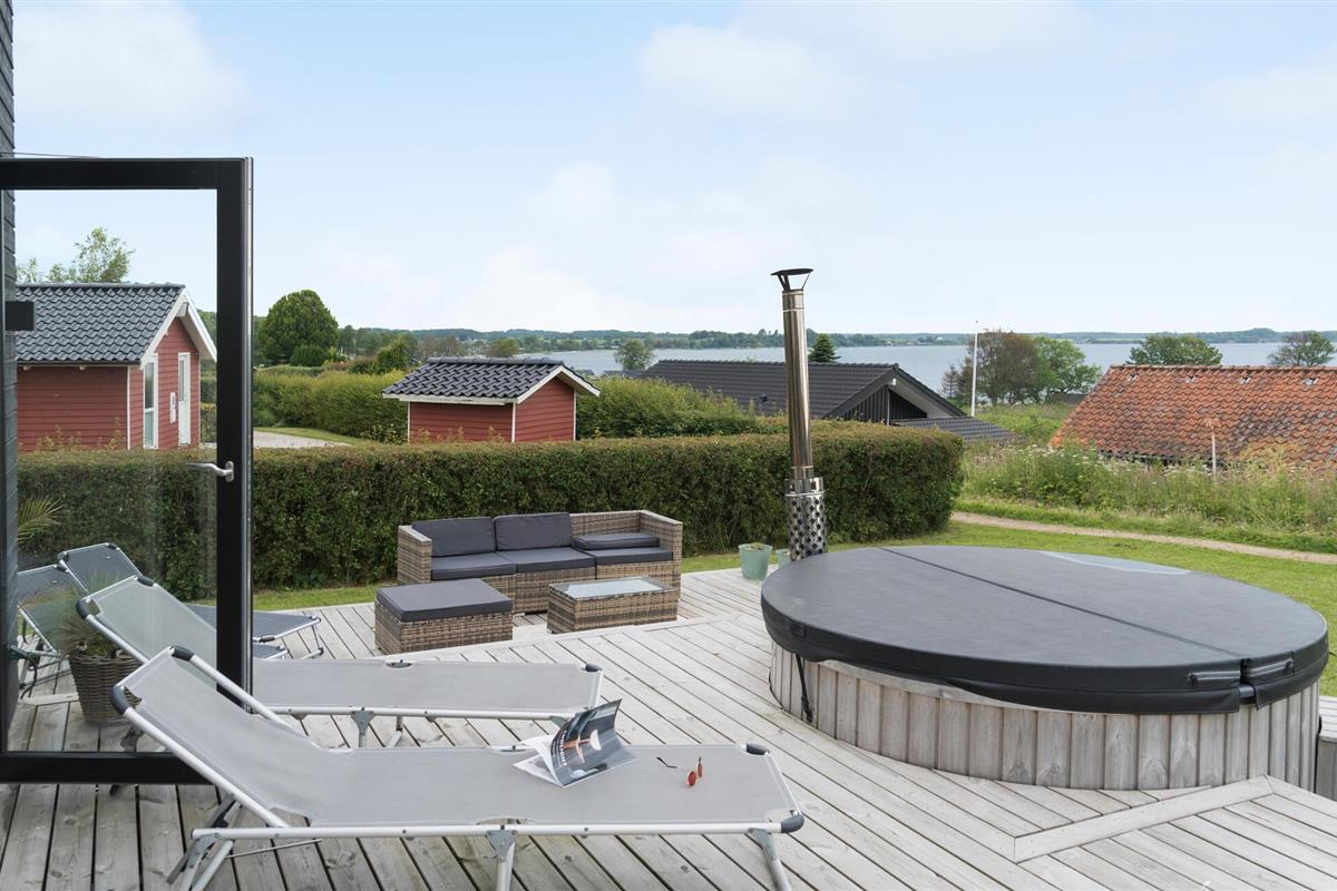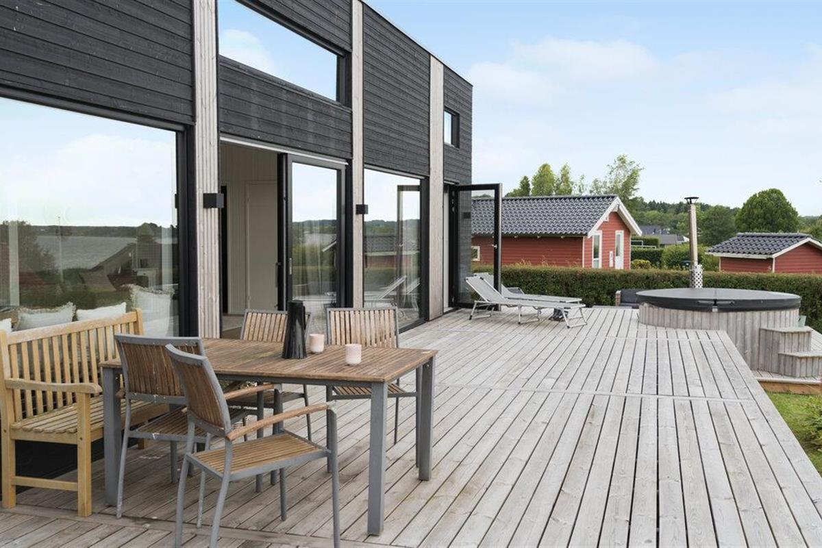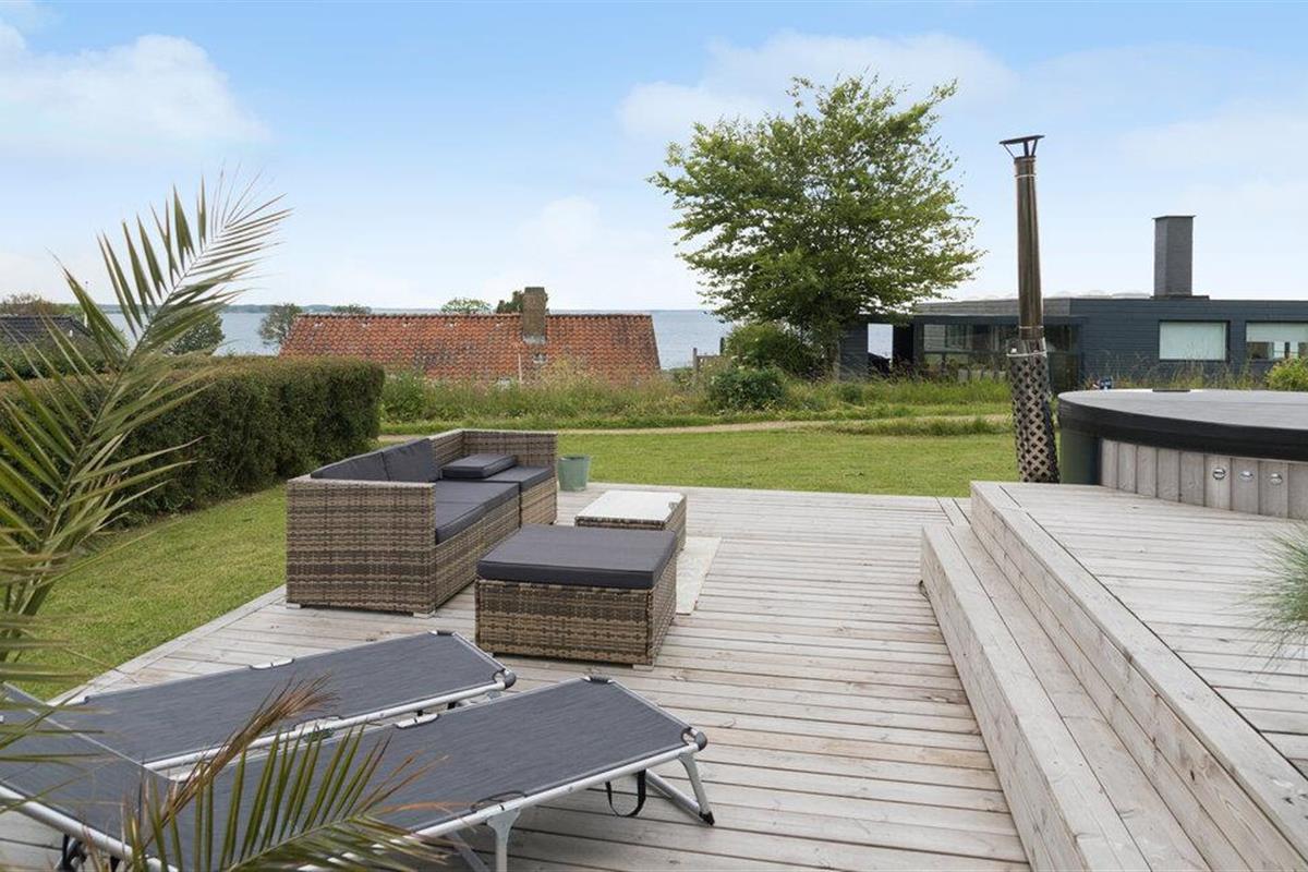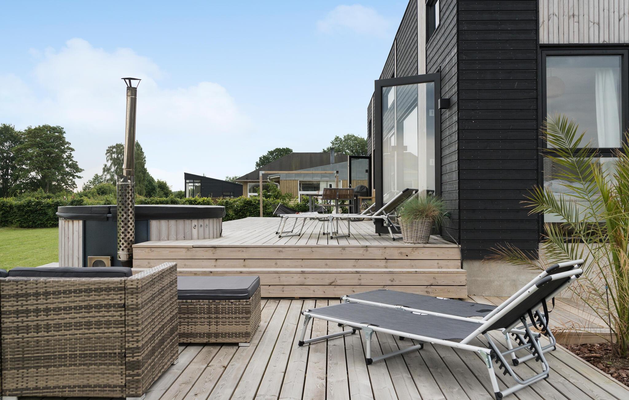 Modern vakantiehuis met zeezicht, terras, hot tub en ruime tuin bij Grønninghoved Strand.
