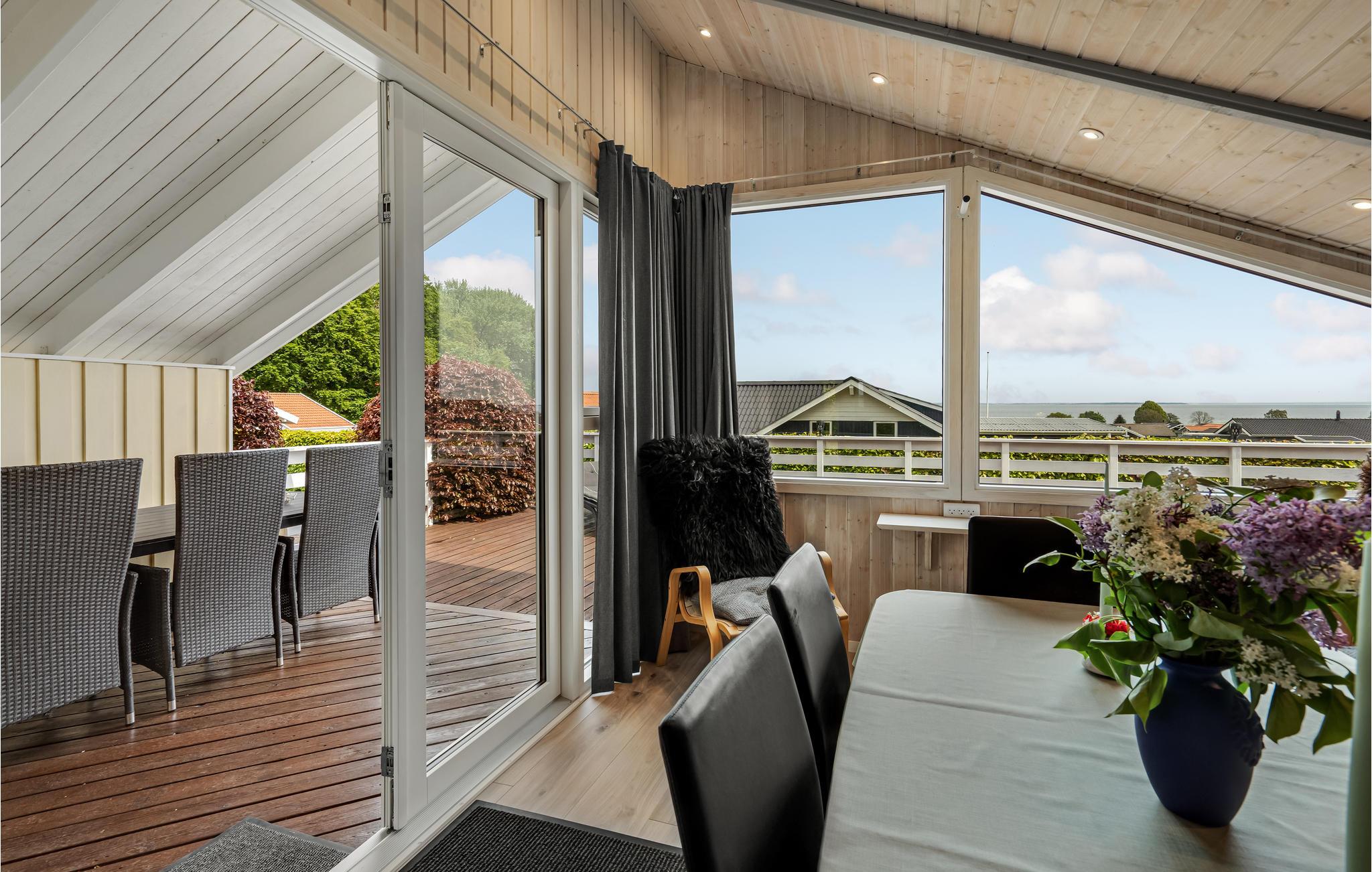 Modern houten vakantiehuis met panoramisch uitzicht op de Kleine Belt en Funen, vlakbij zee, geschikt voor ontspanning.