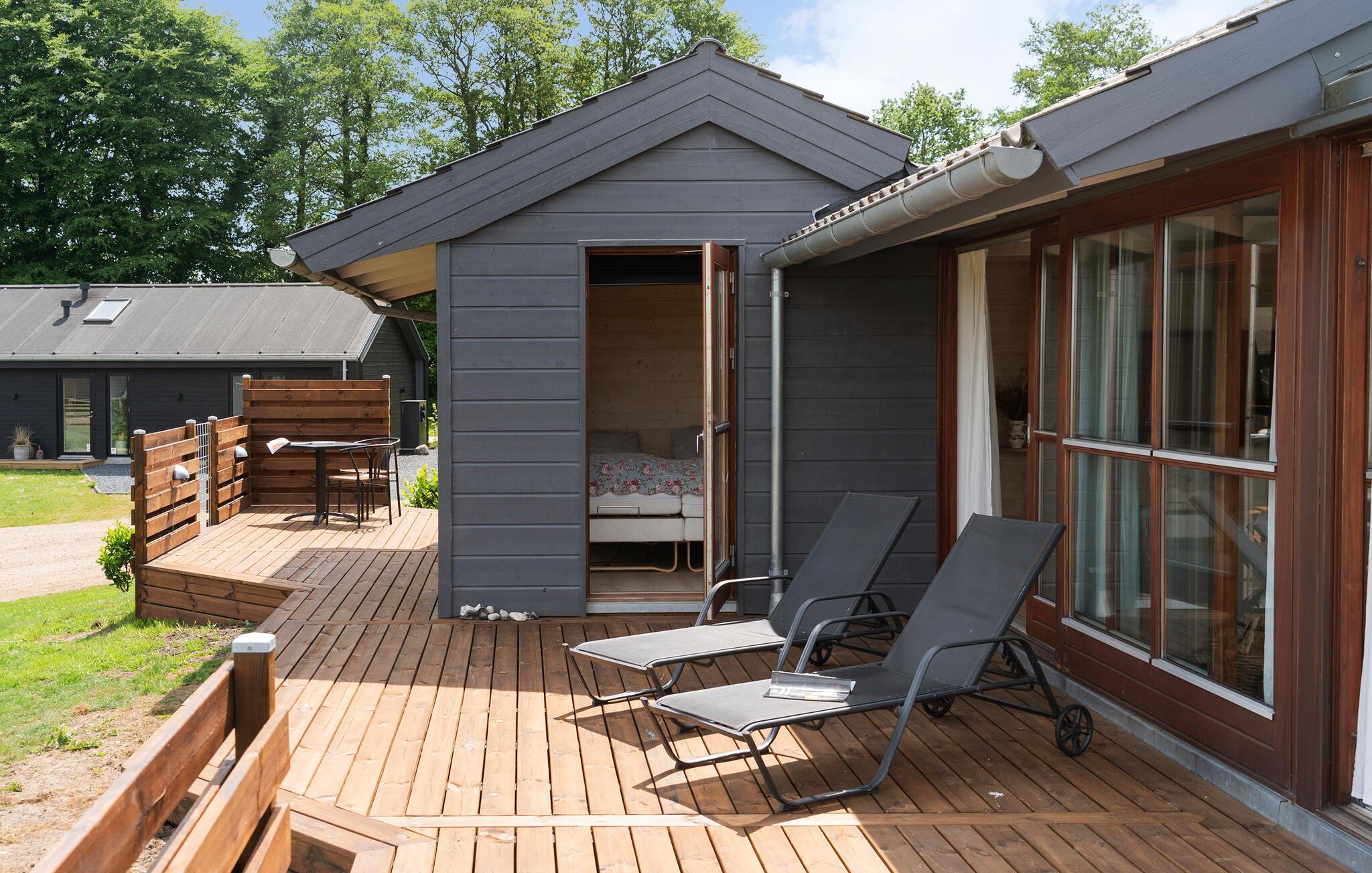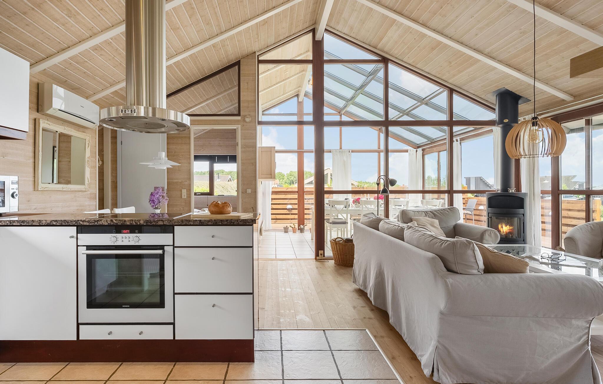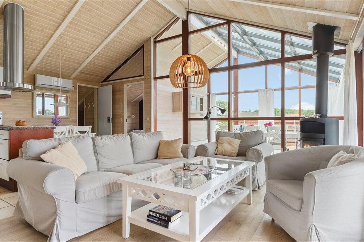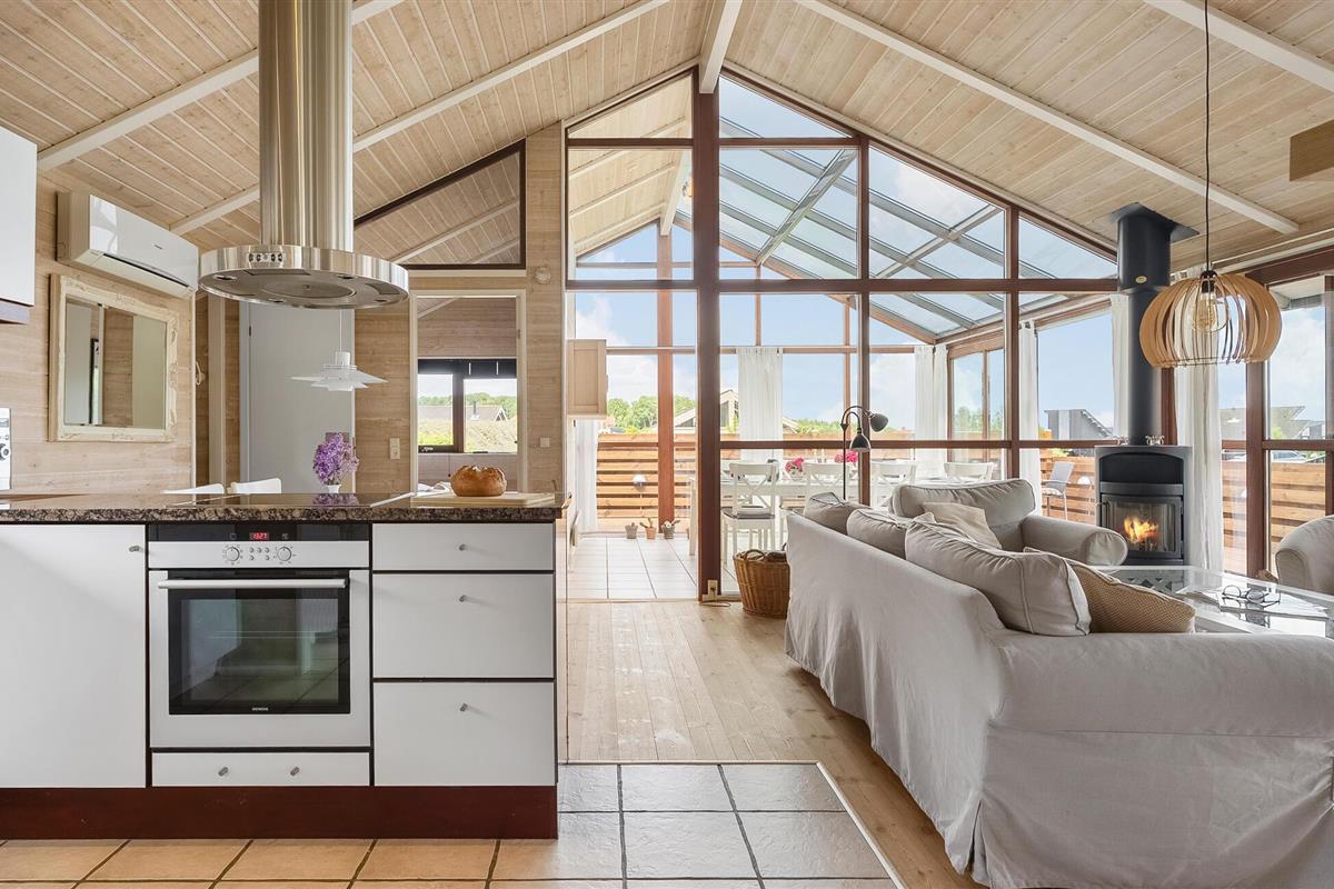 Geniet van een lichte vakantiewoning met sauna, open haard en terras nabij strand en natuur in Denemarken.