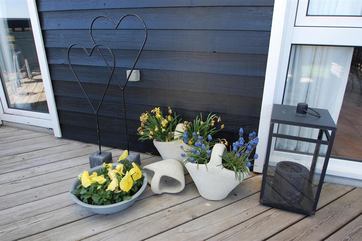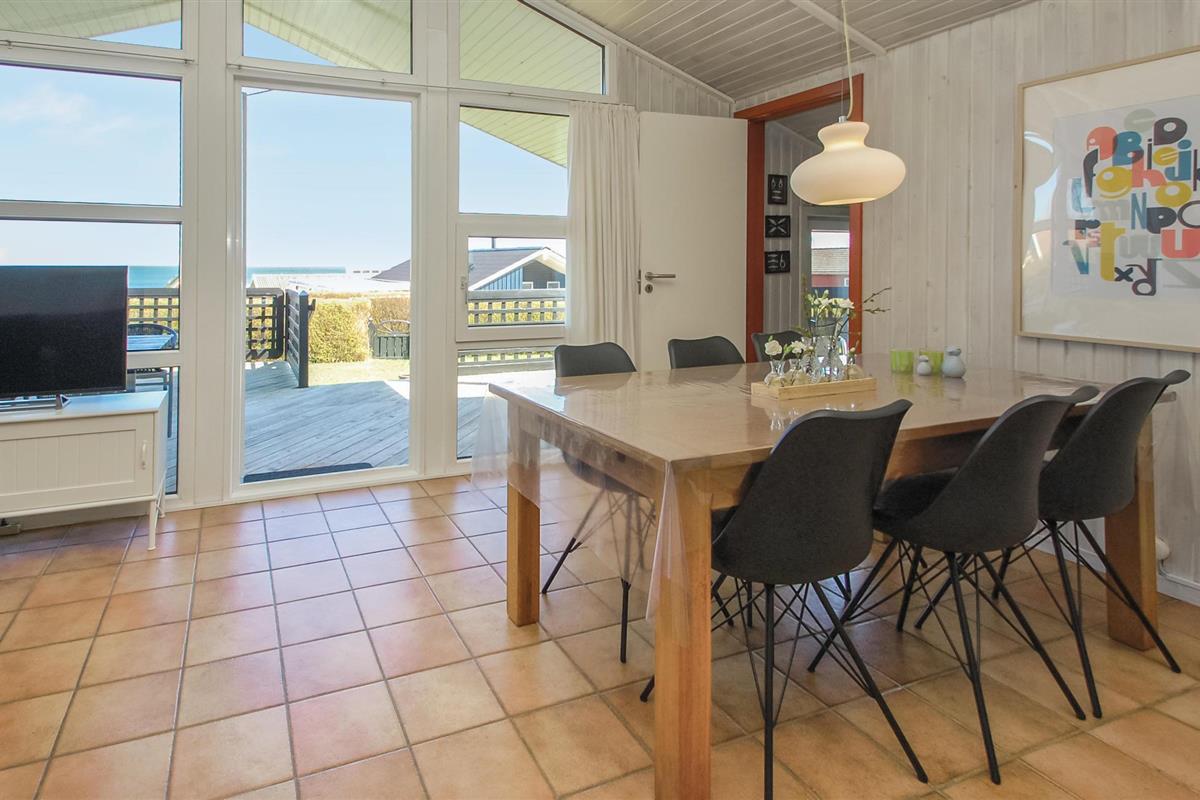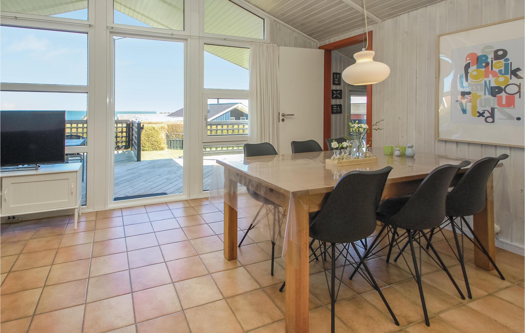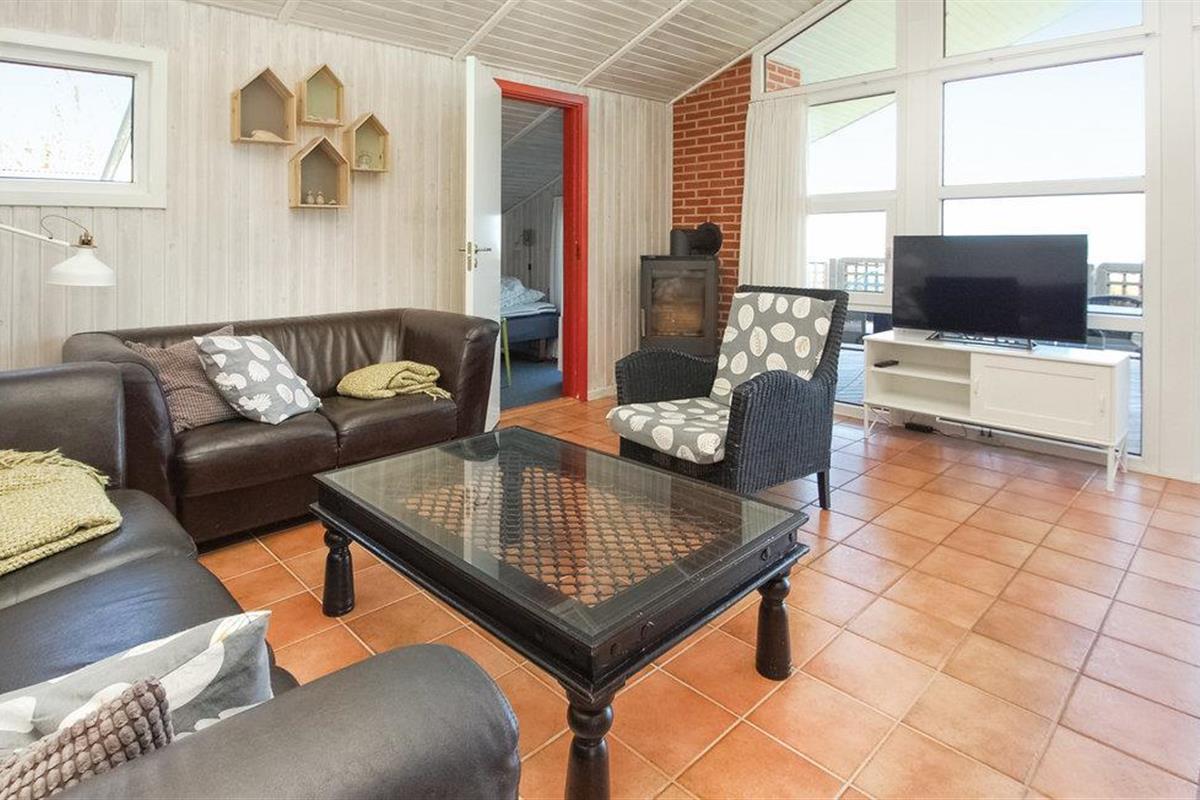 Een mooi en goed onderhouden vakantiehuis met uitzicht op zee vanuit de woonkamer en het terras. Het interieur van het huis is gezellig en warm, met een houtkachel in de woonkamer en een warmtepomp.