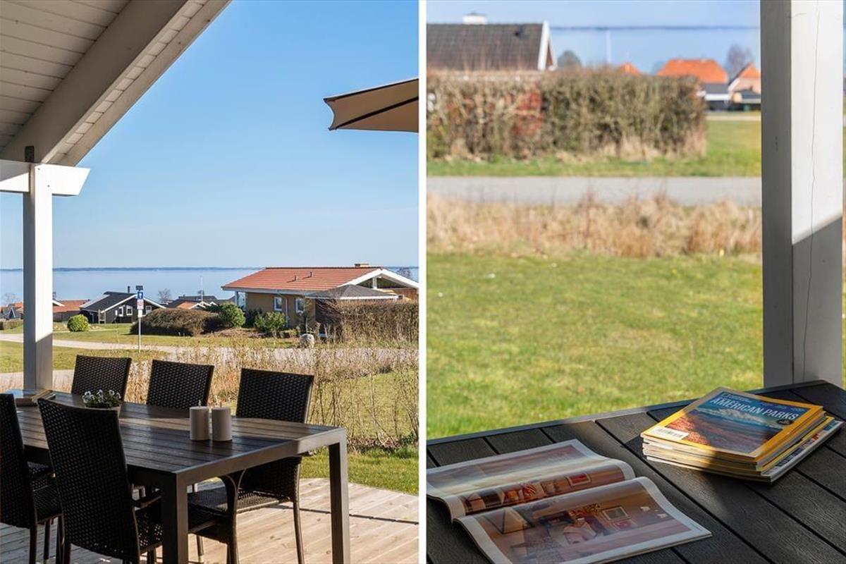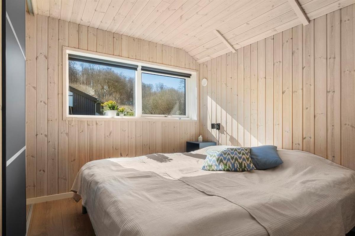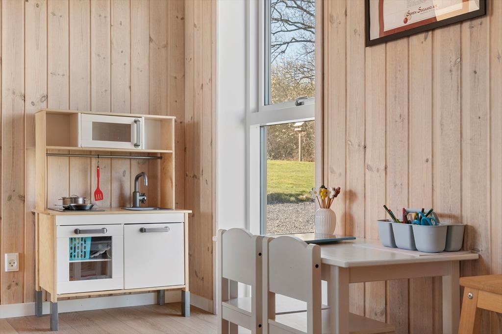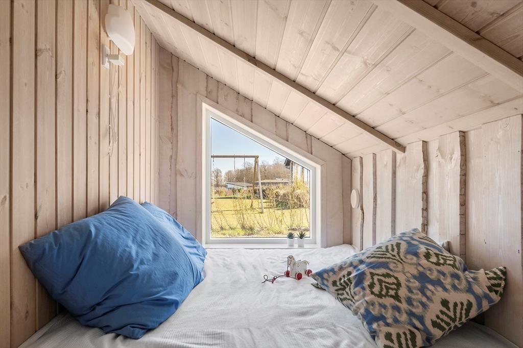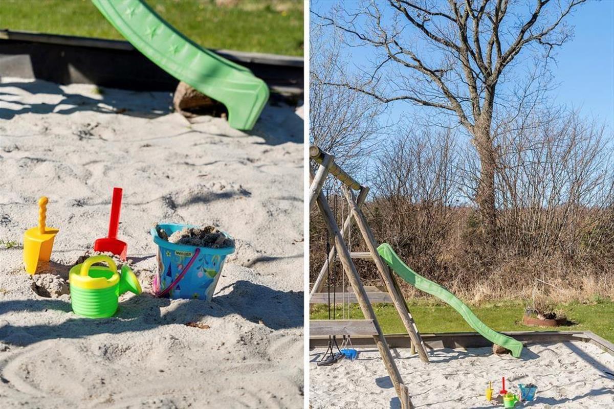 The outdoor area is designed for both relaxation and play. The holiday home boasts several terraces, one of which is partially covered, allowing you to find shade or soak up the sun from morning to evening. Start your day with a cup of coffee on the terrace while taking in the breathtaking panoramic sea view, or gather the family for a delightful barbecue evening with the scent of summer in the air. Children can have fun in the sandbox or on the swings while the adults enjoy the tranquility and fresh air. The scenic surroundings invite you to take long walks through the hilly landscape, where you can discover the stunning viewpoints of Skamlingsbanken.