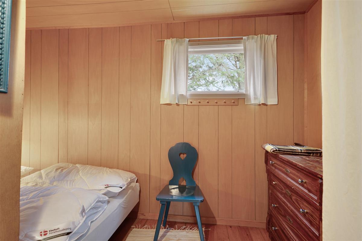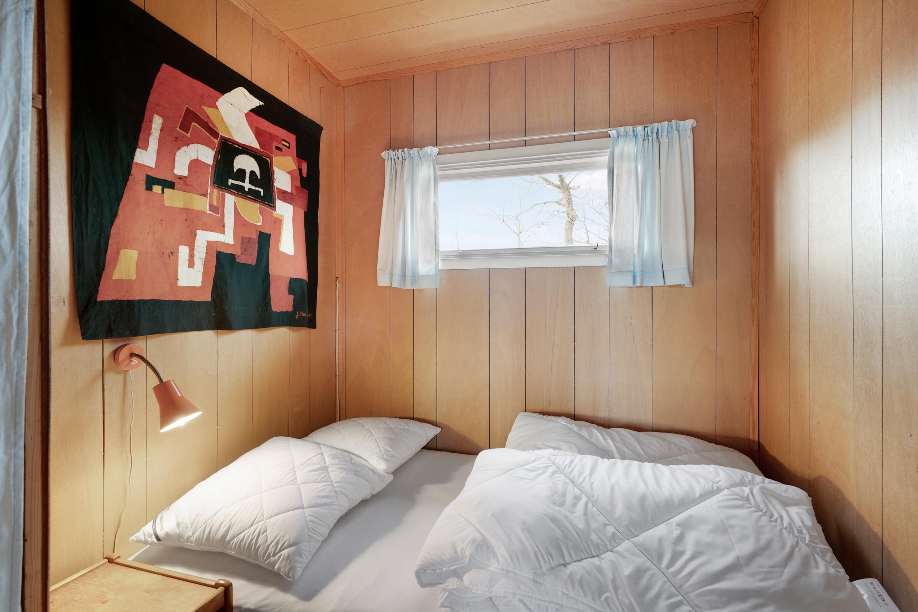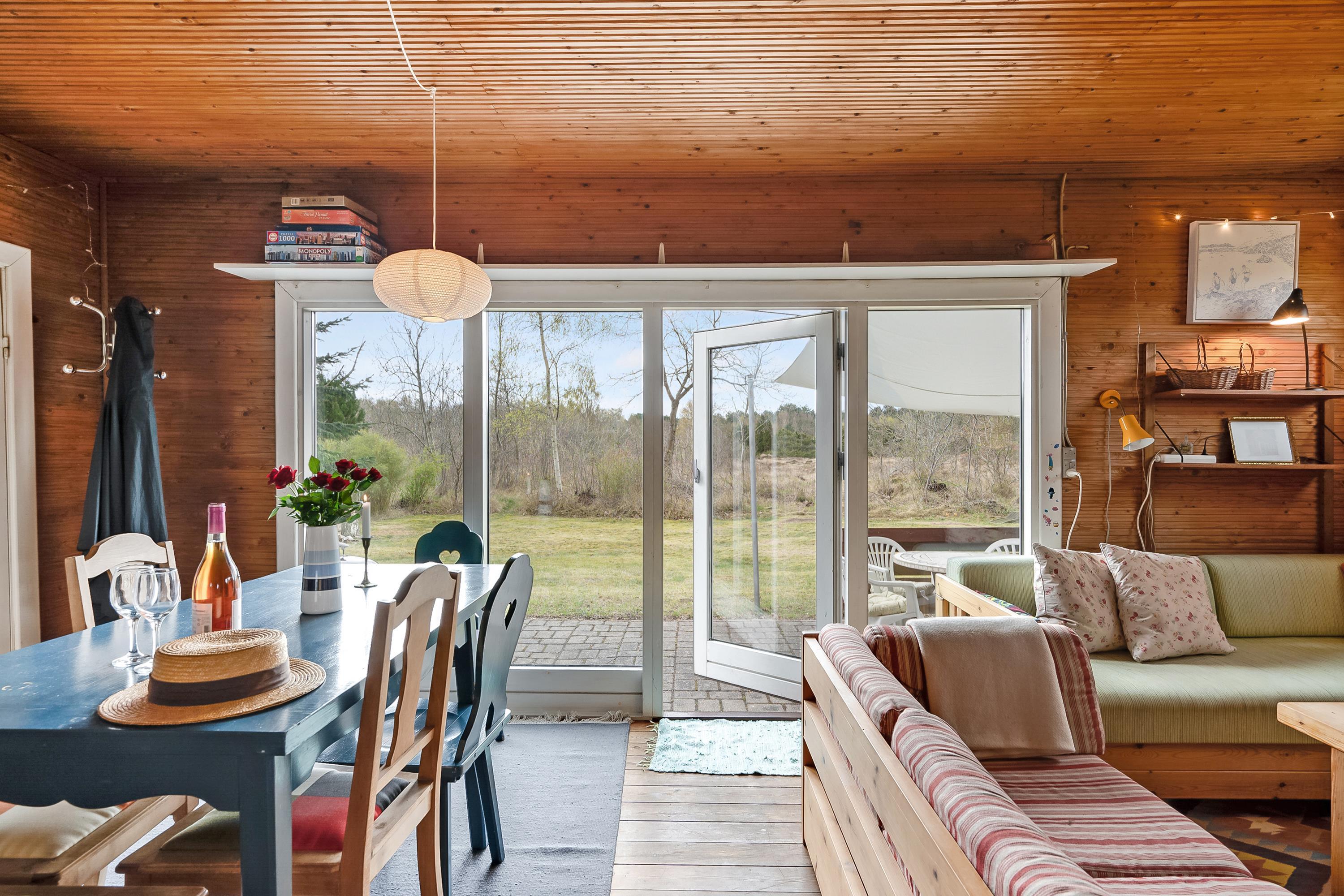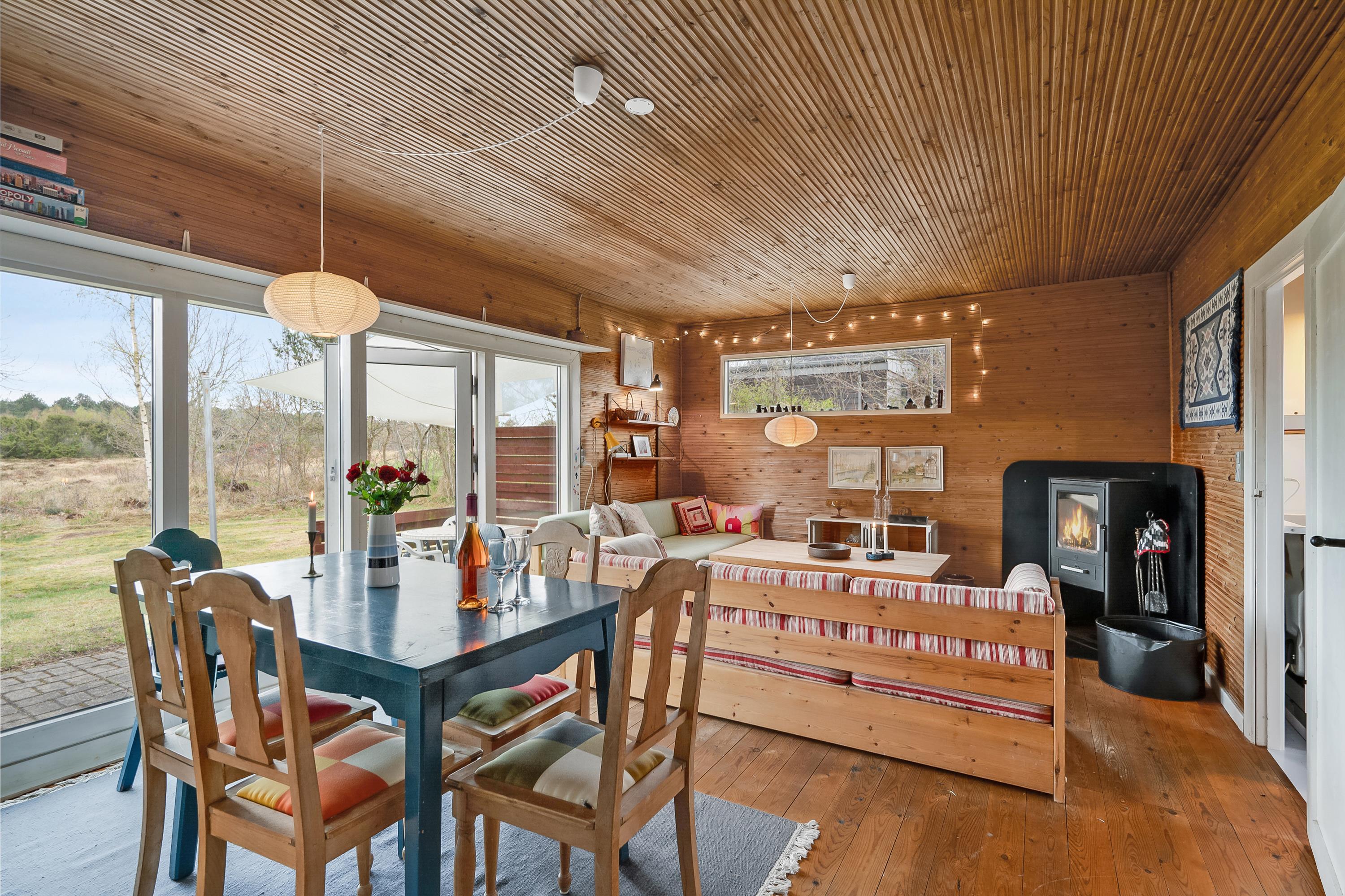 Close to one of Jutland's best bathing beaches, you will find this small holiday home/cabin of 55 m², located on a lovely plot with heathland in the background. The house is authentic, offering a true offline experience where nature takes precedence over comfort. Inside, you’ll find a cozy small living room with a fireplace and access to a lovely terrace with garden furniture and a barbecue. From the terrace, you can enjoy the most beautiful views of the forest and heathland, and you may be lucky enough to spot deer and hares in the backyard. The house features three small bedrooms: one with a single bed, one with a double bed, and one with a bunk bed (180 cm in length). There is a small but functional kitchen, and an integrated toilet with a shower niche, located just a few steps outside the door. As mentioned, this house is completely offline—there is neither TV nor internet, but an internet router can be rented at the office, and you can bring your own computer.