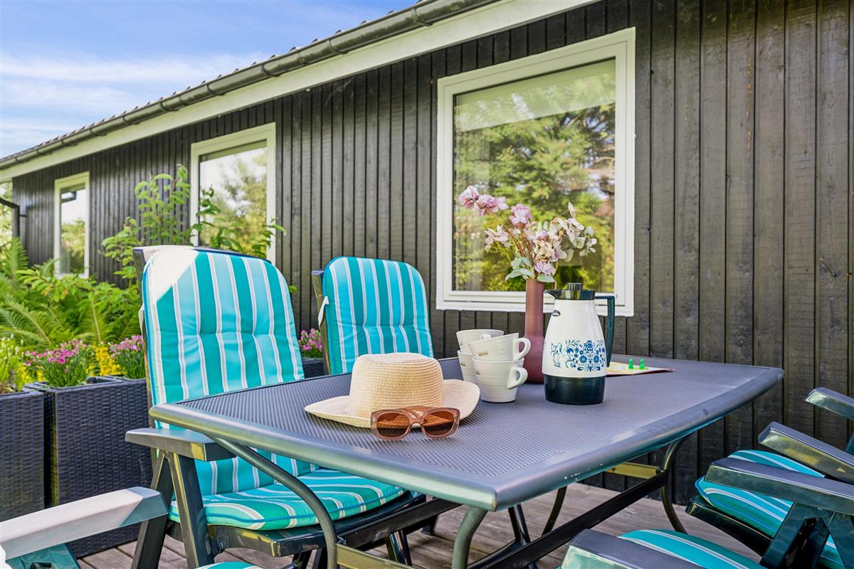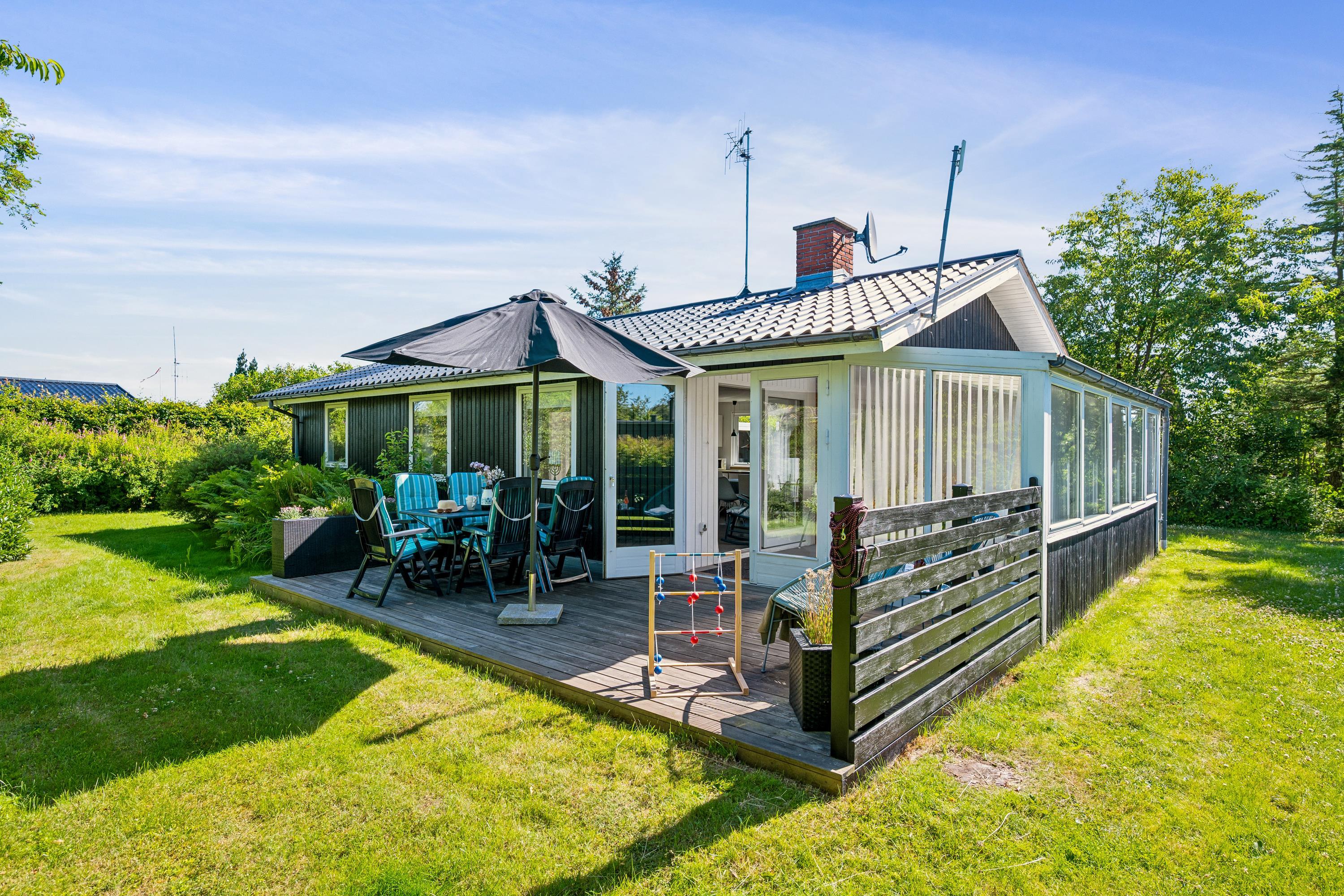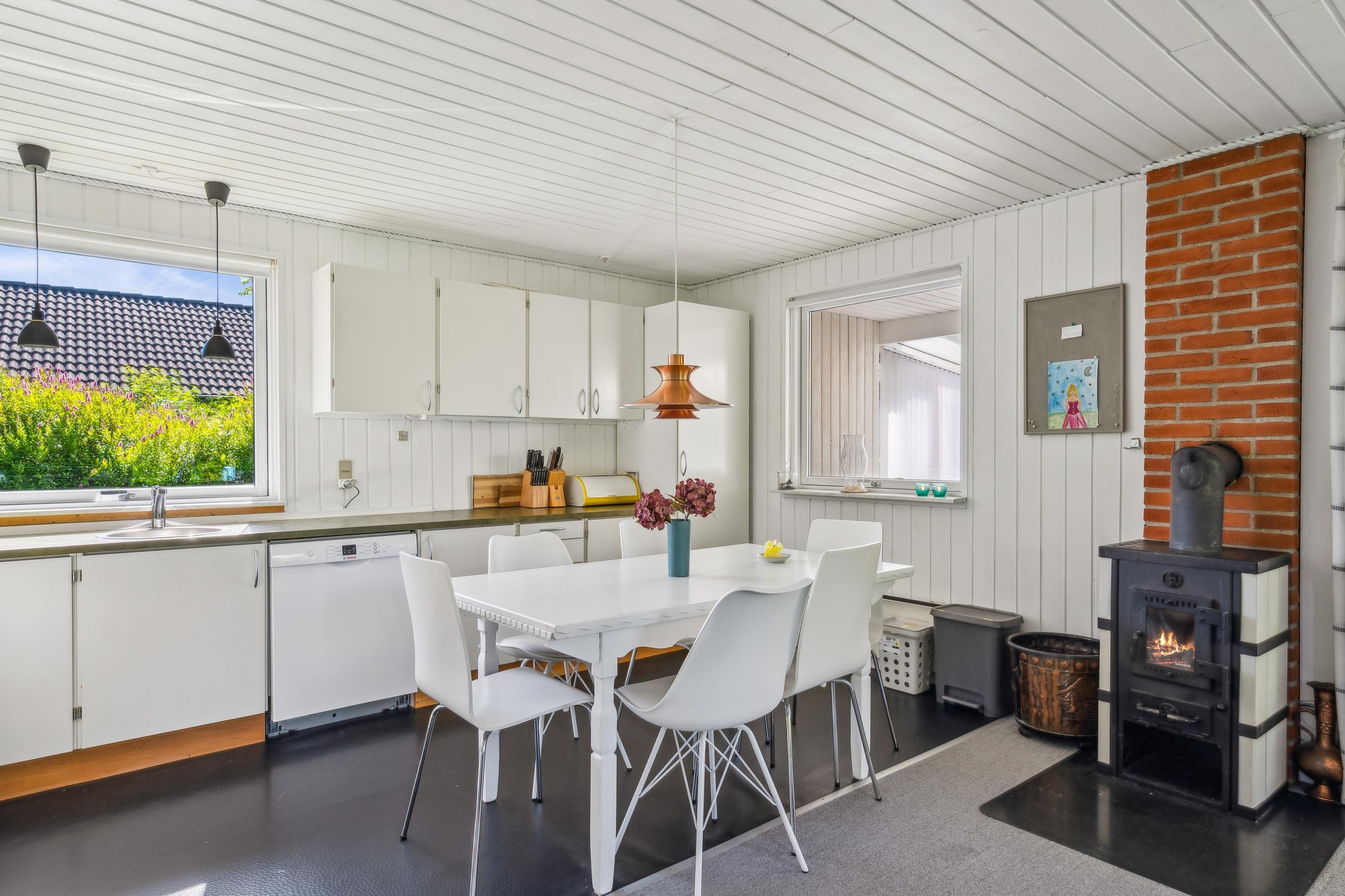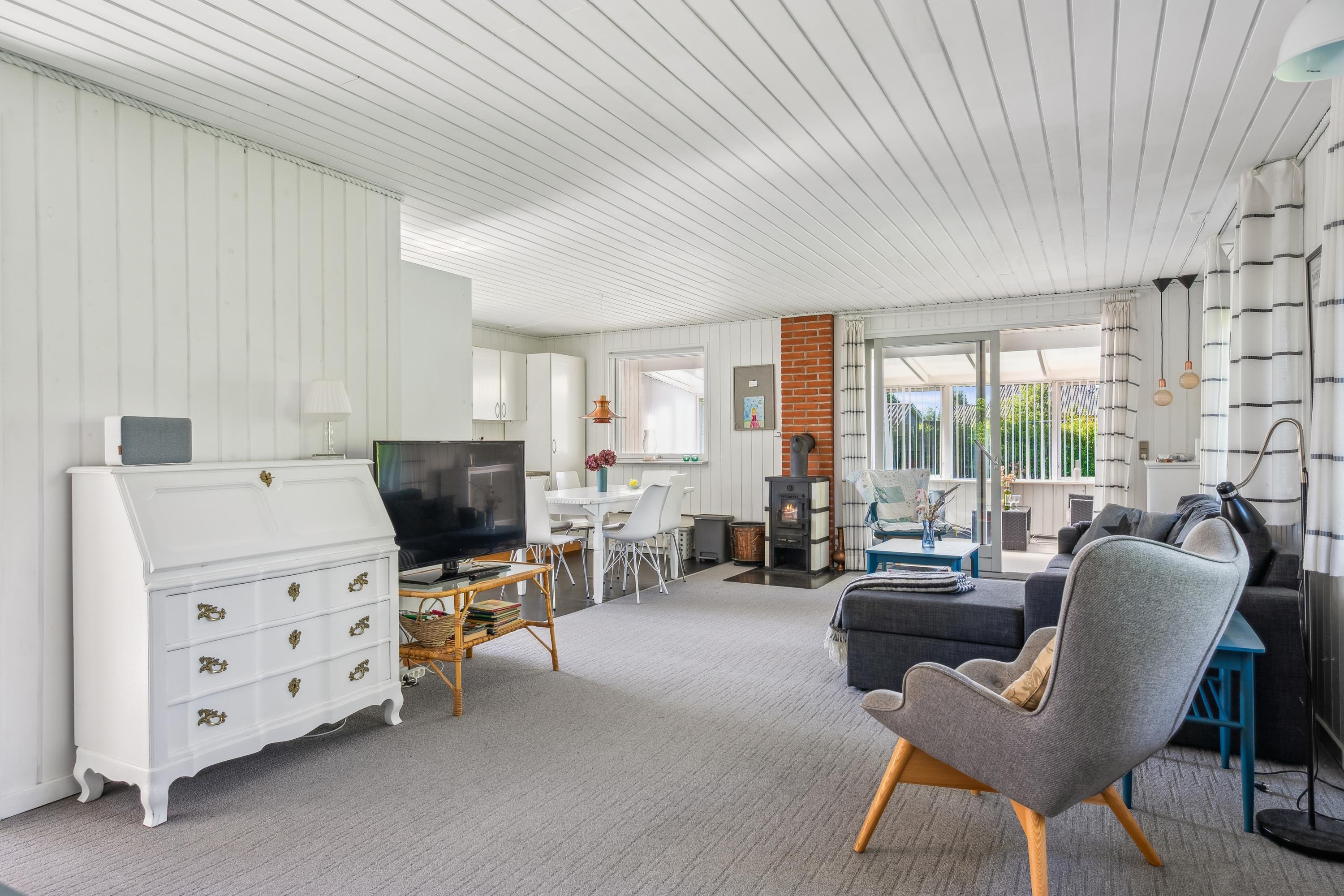 Close to one of Jutland’s finest bathing beaches, you’ll find this older yet cozy holiday home. The house features a bright living room with a wood-burning stove and direct access to a lovely sunroom. From the sunroom, there’s access to a nice terrace with garden furniture.