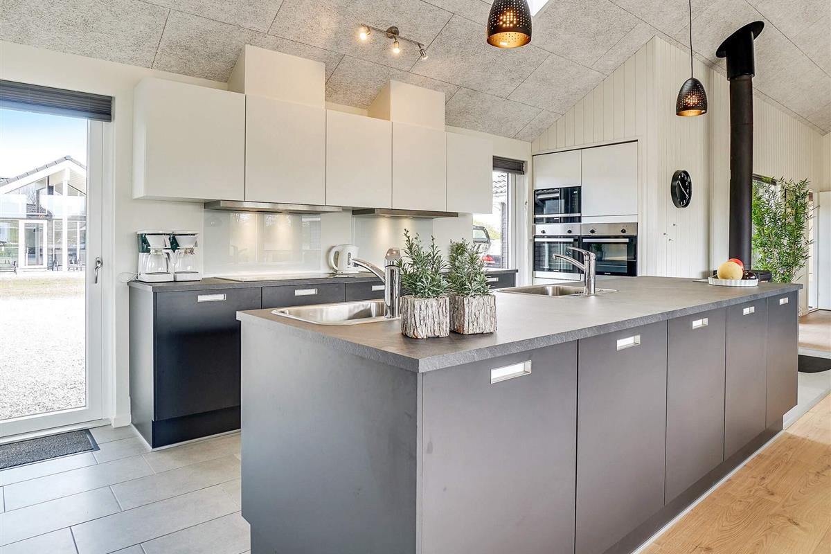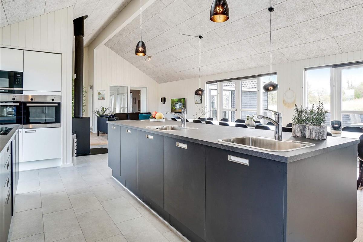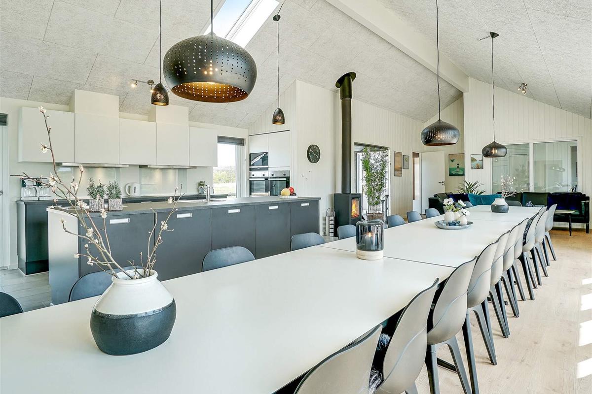 Die Küche ist offen mit dem Wohnraum und dem großen Essplatz kombiniert und gut durchdacht. So stehen u.a. zwei Kühlschränke, ein Gefrierschrank, zwei Herde und zwei Spülmaschinen zur Verfügung. Im Wohnraum sind Stereoanlage, CD-Player, Fernseher und DVD-Player vorhanden. Ein Holzofen sorgt hier für gemütliche Wärme.