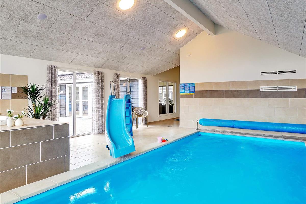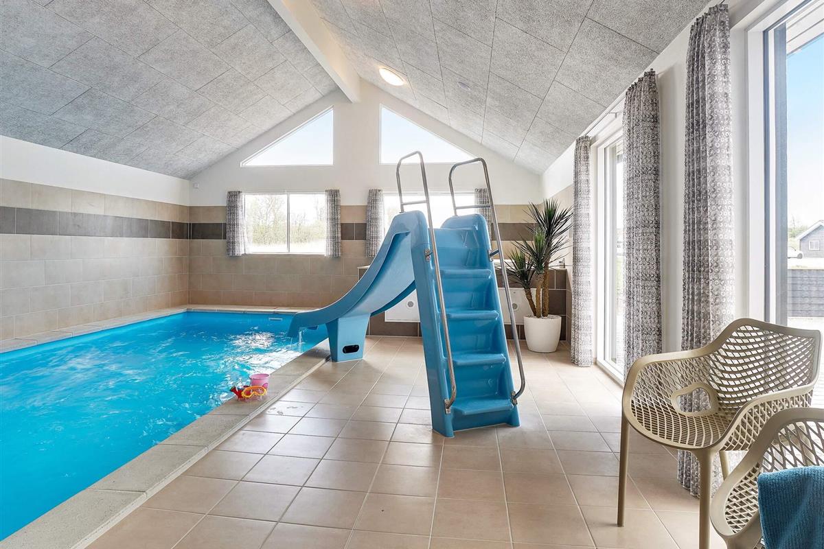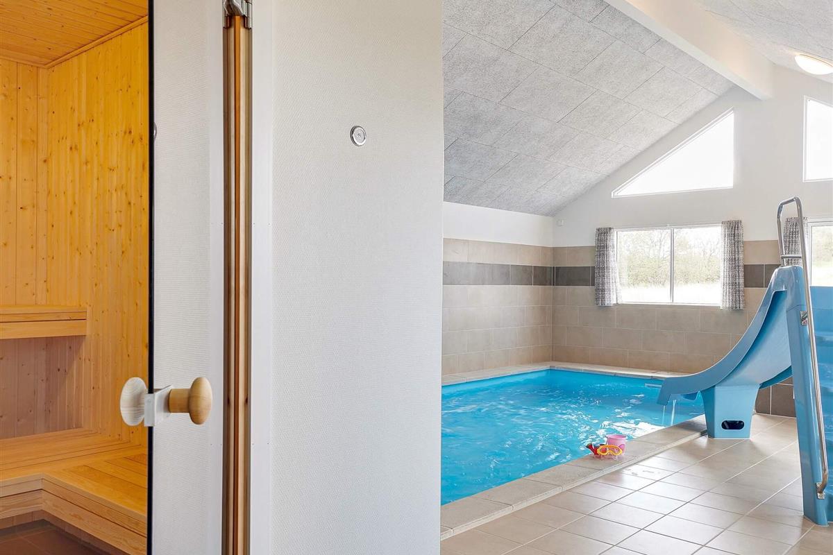Der Poolbereich beinhaltet einen 2 m² großen Swimmingpool mit Wasserrutsche für die Kinder und einer Gegenstromanlage für die aktiven Schwimmer. Außerdem gibt es hier zum Entspannen einen großen Whirlpool und eine Sauna mit Platz für 6 Personen.