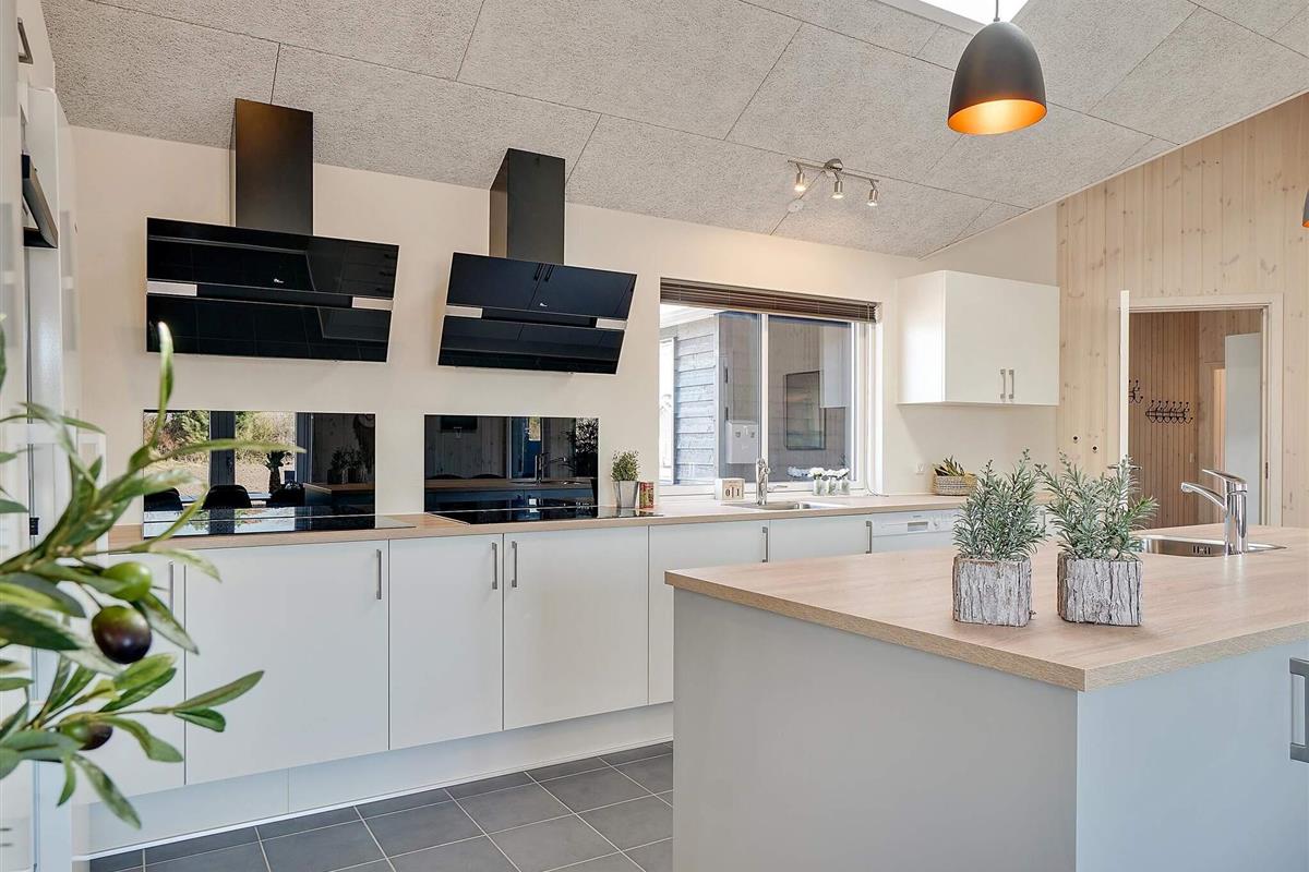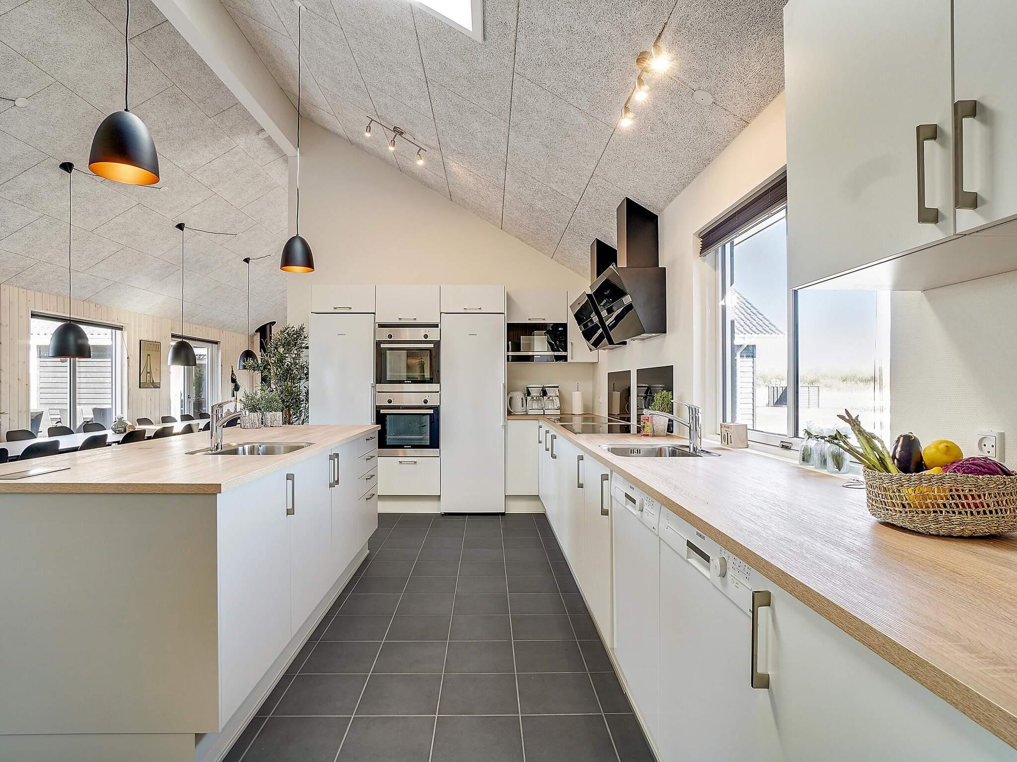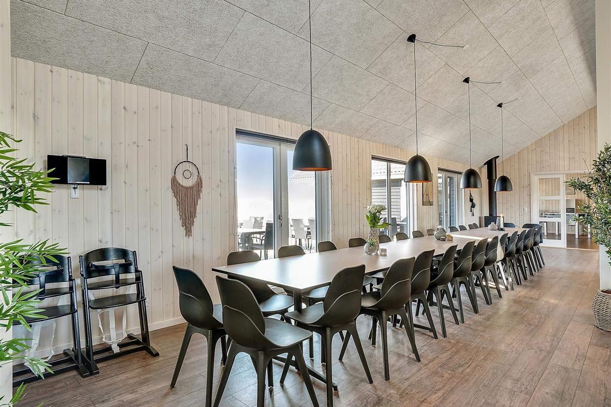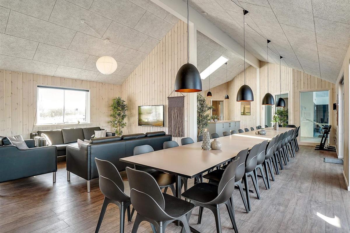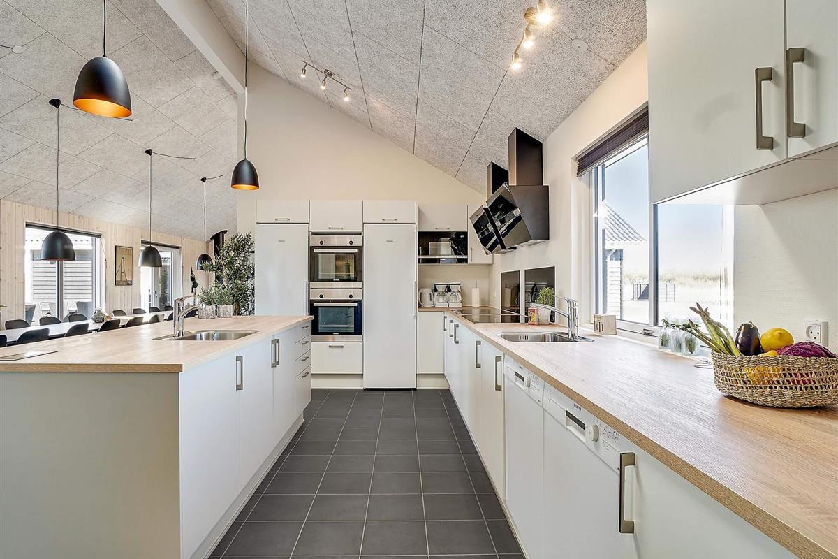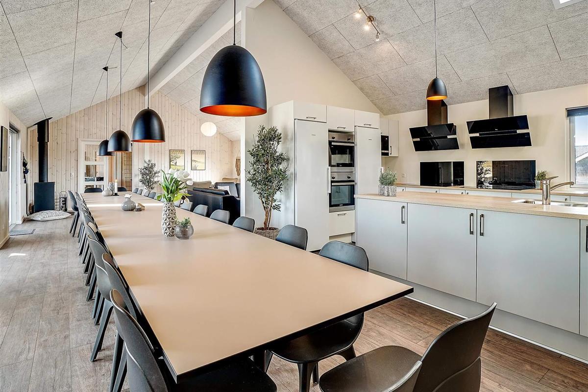 In der Mitte des Ferienhauses befindet sich die Wohnküche mit einer gut ausgestatteten Küche, einer gemütlichen Sofagruppe und einem langen Esstisch mit Platz für 30 Personen, sodass die ganze Familie gemeinsam essen kann. Mit zwei Backöfen, Herden, Spülbecken, Geschirrspülern und viel Platz im Kühlschrank können Sie problemlos leckeres Essen für viele Personen zubereiten.