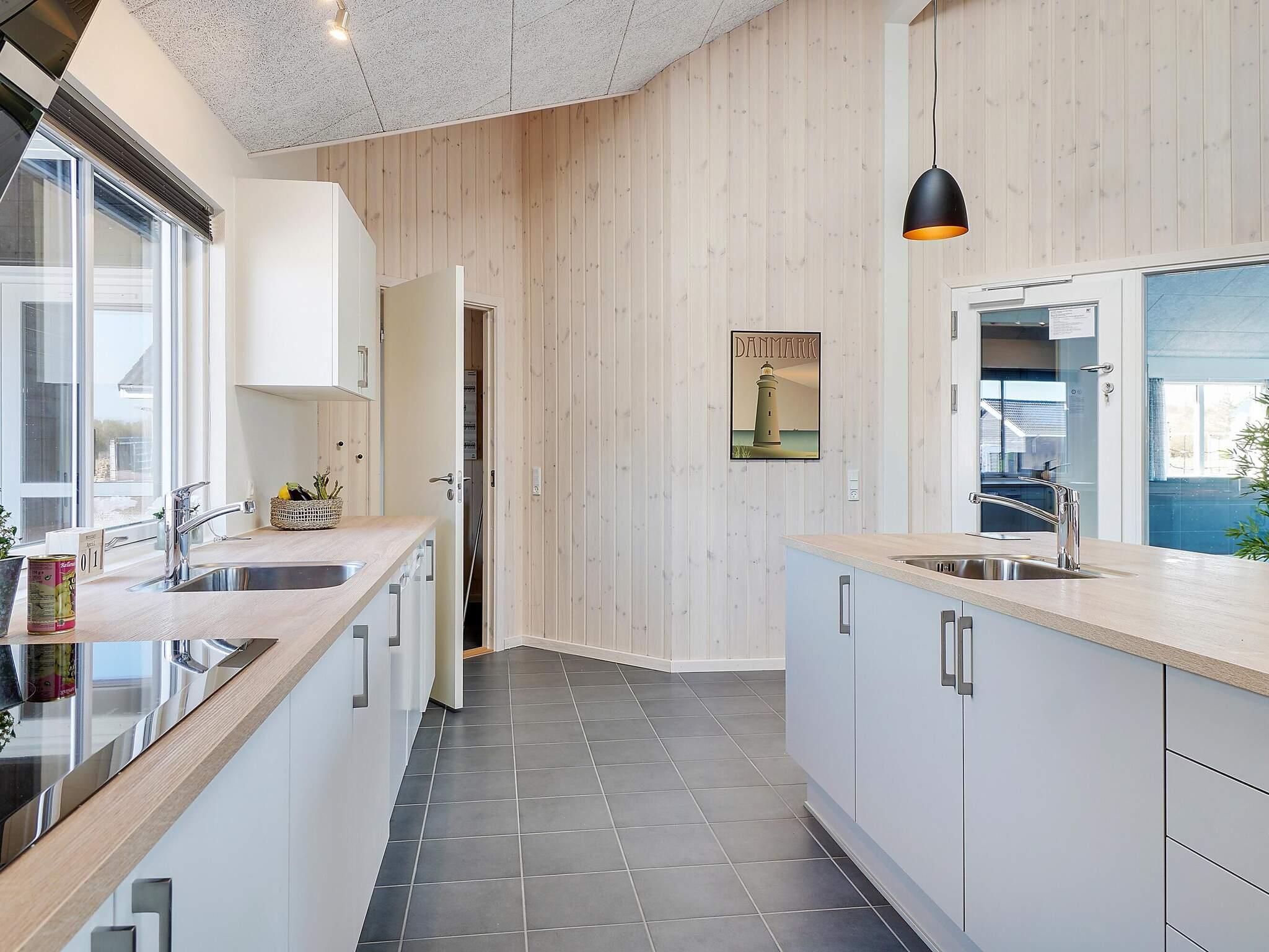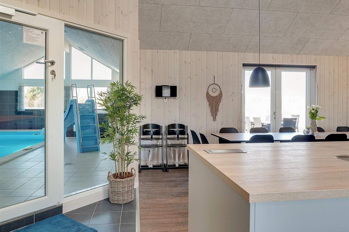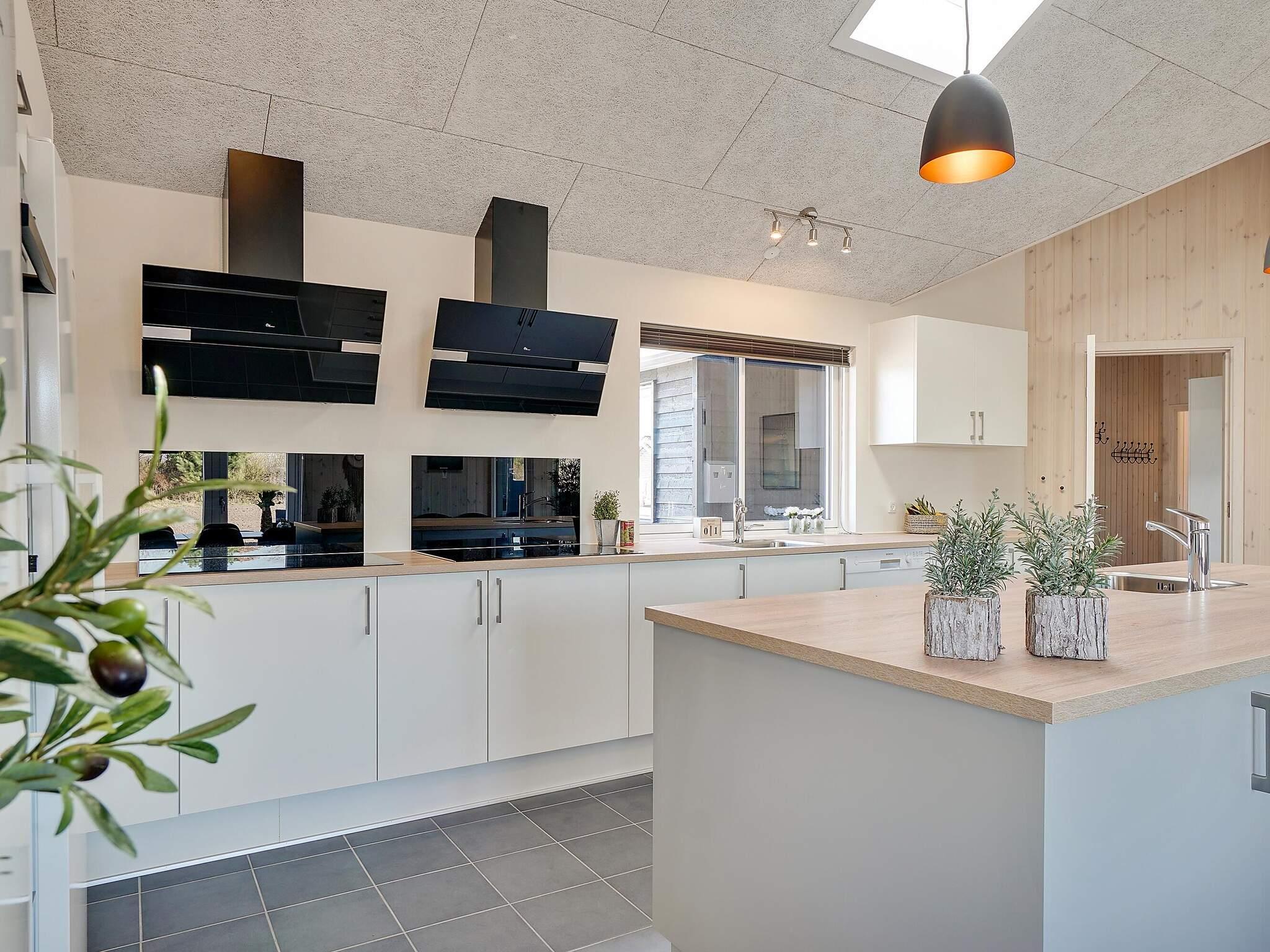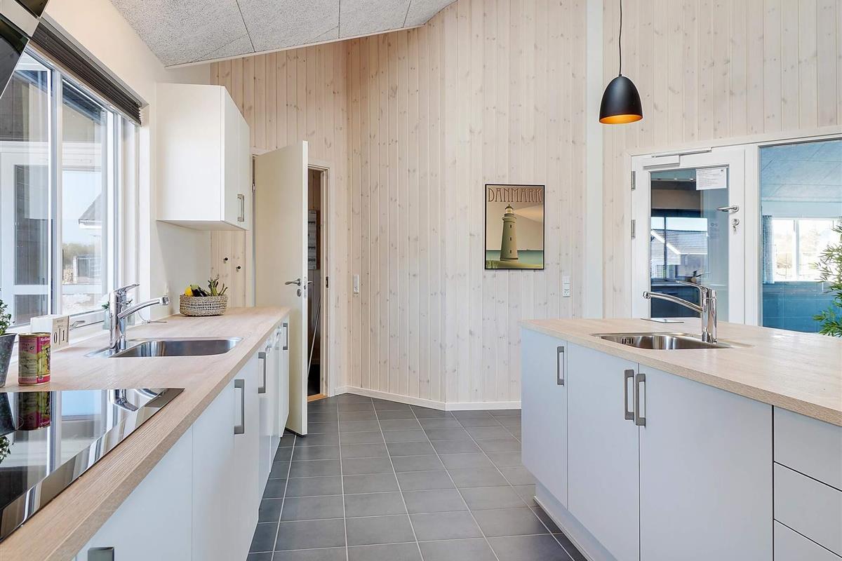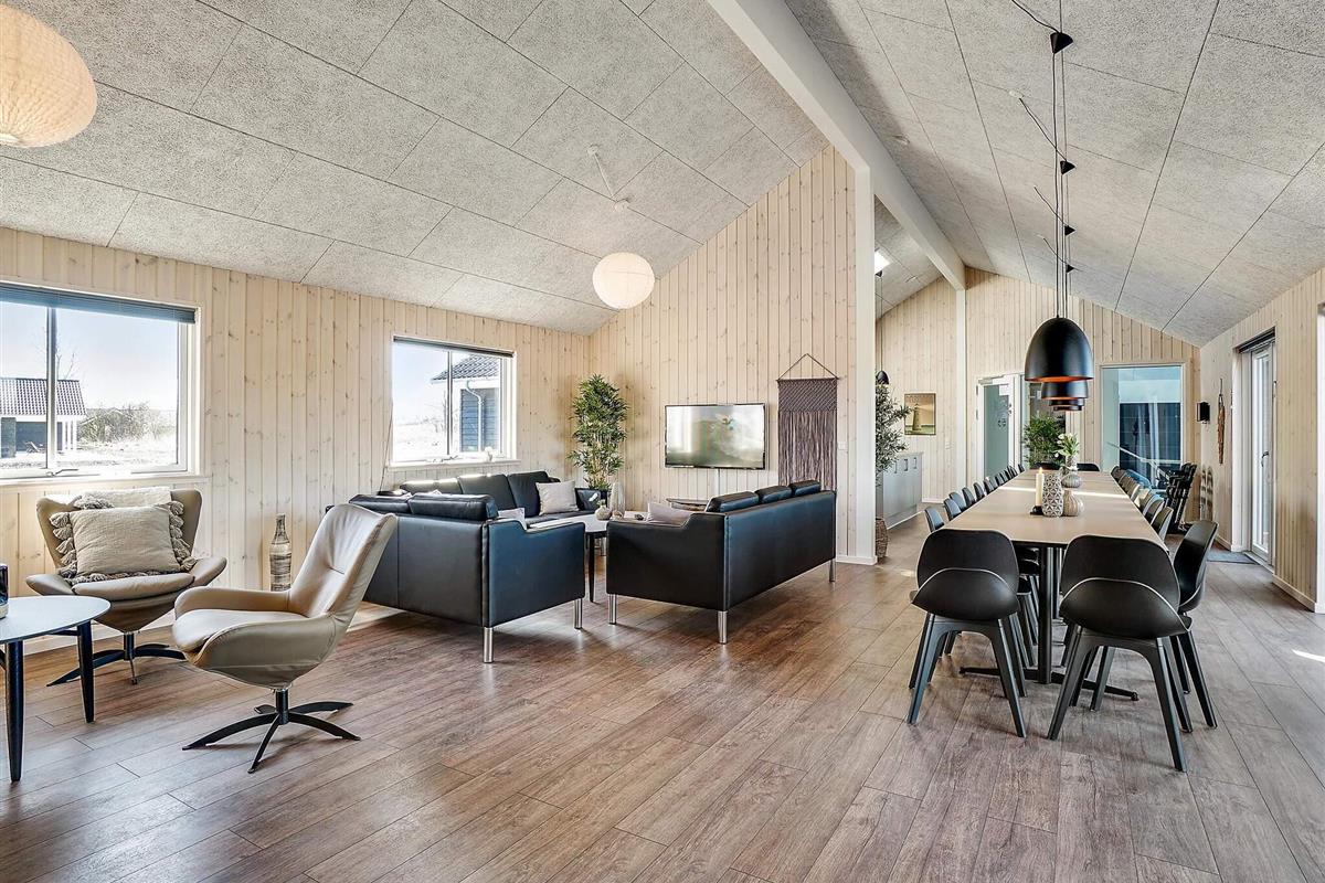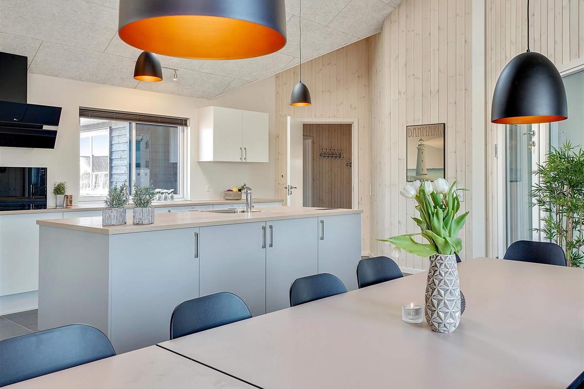 In der Mitte des Ferienhauses befindet sich die Wohnküche mit einer gut ausgestatteten Küche, einer gemütlichen Sofagruppe und einem langen Esstisch mit Platz für 30 Personen, sodass die ganze Familie gemeinsam essen kann. Mit zwei Backöfen, Herden, Spülbecken, Geschirrspülern und viel Platz im Kühlschrank können Sie problemlos leckeres Essen für viele Personen zubereiten.
