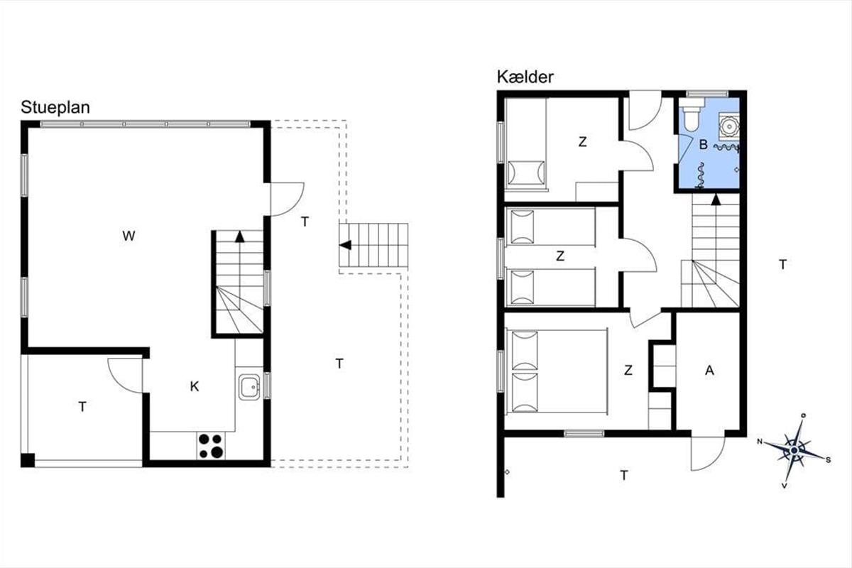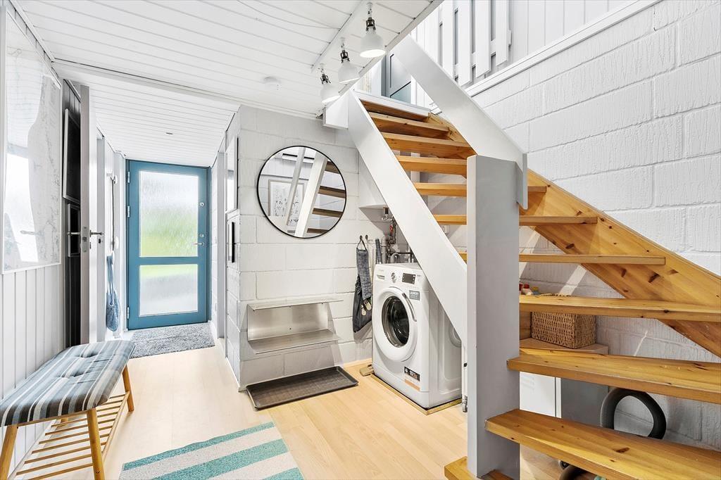 Das untere Stockwerk verfügt über drei gemütliche Schlafräume, von denen einer mit einem Doppelbett eingerichtet ist. Im zweiten Raum stehen zwei Einzelbetten bereit, die bei Bedarf zu einem Doppelbett zusammengeschoben werden können. Im dritten Raum ist ein doppeltes Schlafsofa untergebracht. Der Rest des Untergeschosses ist dem ansprechenden Badezimmer und einem guten Eingangsbereich mit einer Waschmaschine und der Treppe in das obere Stockwerk überlassen.