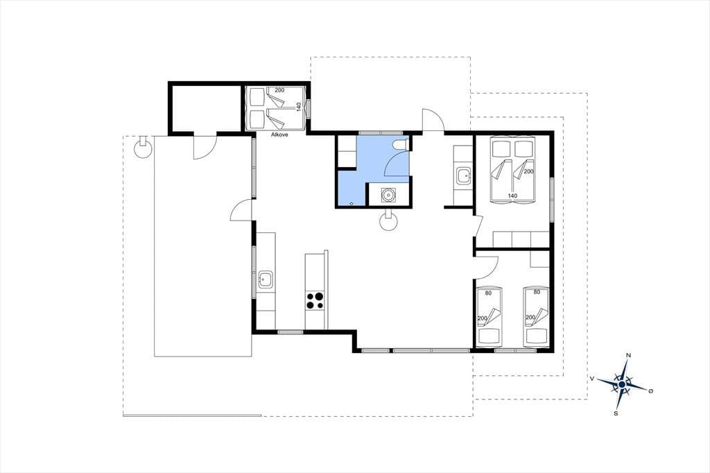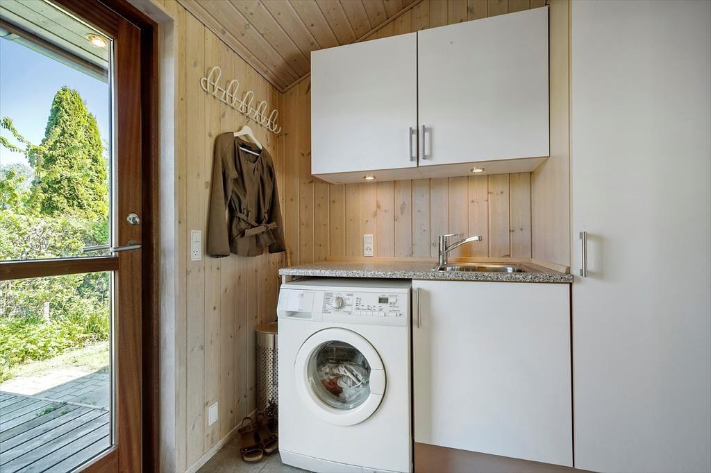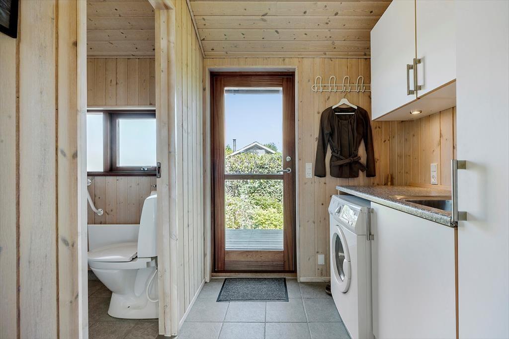 Einer der beiden Schlafräume begrüßt dich mit einem Doppelbett. Im zweiten Schlafraum stehen zwei Einzelbetten zur Verfügung. Weitere Schlafmöglichkeiten stehen in Form zweier Matratzen auf dem Hängeboden und einer Schlafnische mit einem doppelten Schlafsofa bereit. Das Badezimmer präsentiert sich hell und funktionell. Zu den praktischen Elementen zählen das Waschbecken und die Waschmaschine im Hauswirtschaftsbereich.