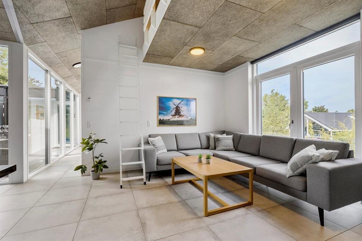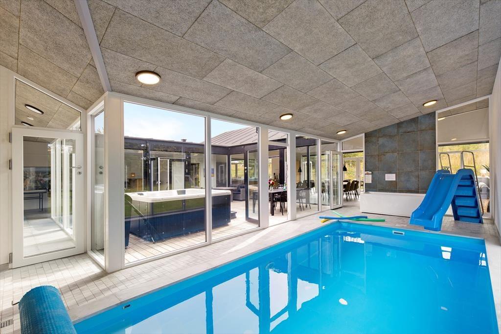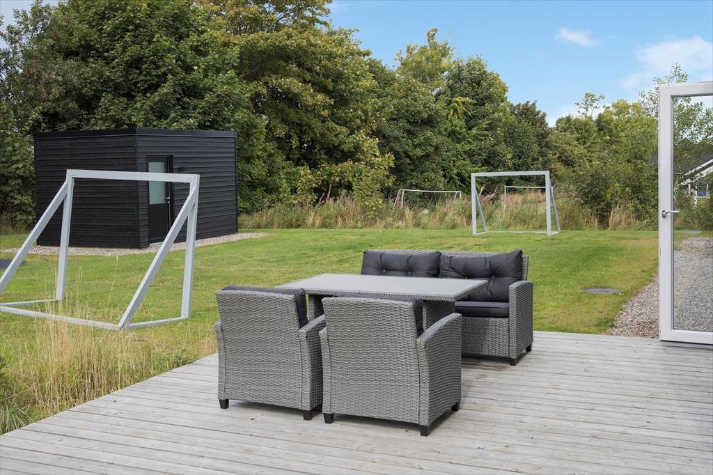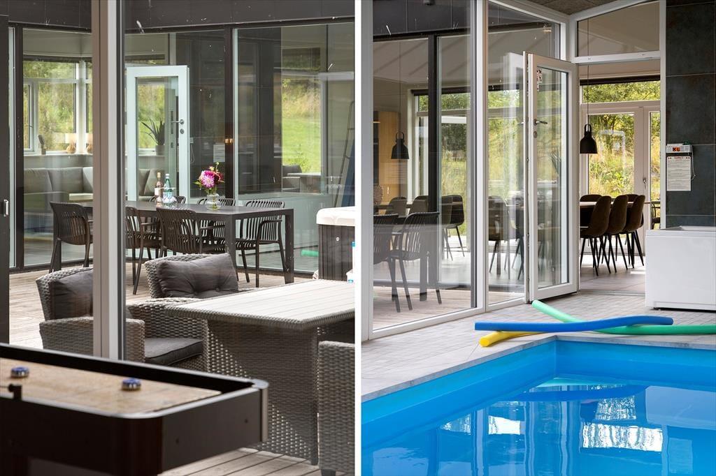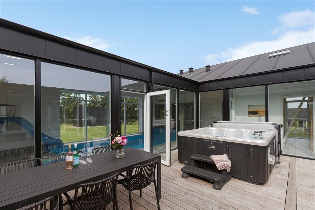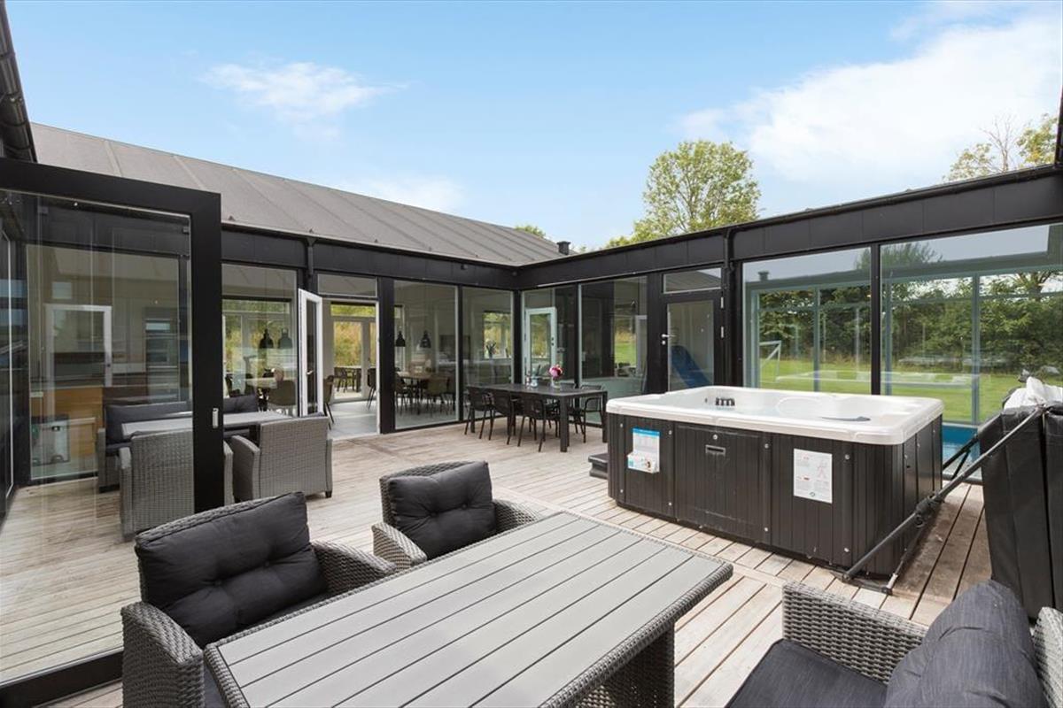 Mitten im Ferienhaus erwartet dich ein schöner Innenhof mit Loungemöbeln und einem großen Outdoor-Whirlpool für 6 Personen. Frische Luft und eine schöne Atmosphäre sind dir hier garantiert. Traumhaft gemütliche, entspannte Stunden verspricht der Innenhof beispielsweise am Abend, wenn die Kinder längst schlafen und du es dir mit den Erwachsenen bei einem Glas Wein gut gehen lässt. Vom Innenhof gelangst du direkt in den Poolraum und hast zugleich freien Blick auf deine im Wasser planschenden Kinder, auf den Flügel mit den Schlafräumen, Aktivitätsraum, sowie auf Küche und Wohnraum. Das Atrium schafft somit eine wunderbare Verbindung zwischen dem Außen- und Innenbereich des Hauses. Das Grundstück deines Ferienhauses ist großzügig bemessen und bietet viel Platz zum Umhertollen und Ballspielen. Rund ums Haus erwarten dich mehrere Terrassen, auf denen du es dir in aller Ruhe mit einem Becher Kaffee gemütlich machen kannst, während deine Kinder vergnügt auf dem Trampolin hüpfen und ausgelassen spielen. Lange Urlaubstage lasst ihr alle zusammen sicherlich gern bei einem stimmungsvollen Abendessen vom Gasgrill ausklingen.