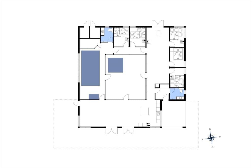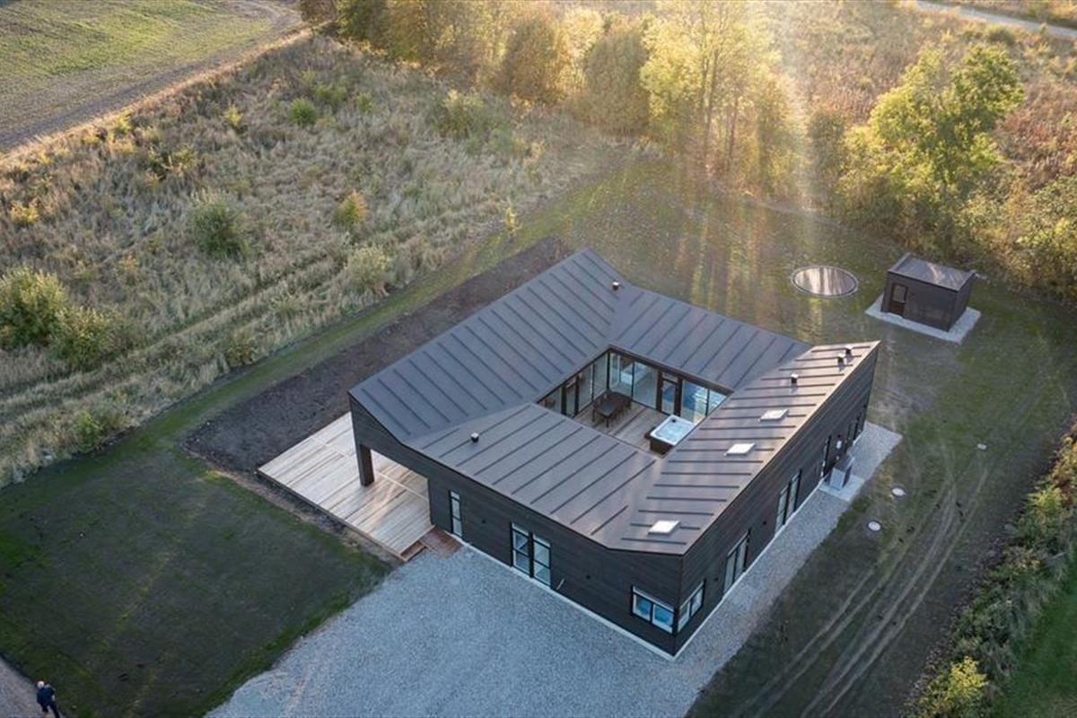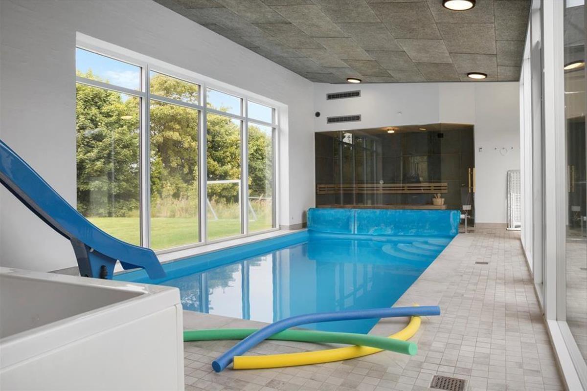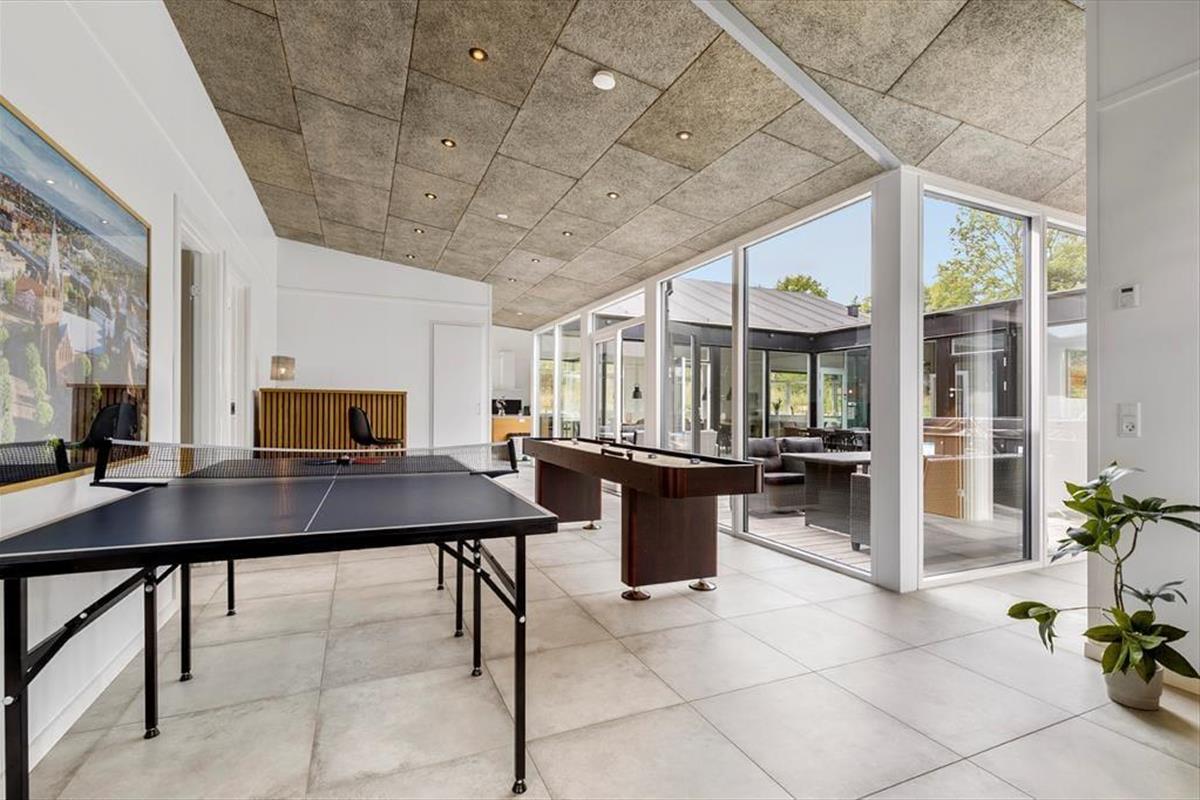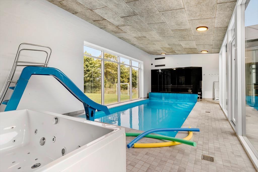 Mitten im Ferienhaus erwartet dich ein schöner Innenhof mit Loungemöbeln und einem großen Outdoor-Whirlpool für 6 Personen. Frische Luft und eine schöne Atmosphäre sind dir hier garantiert. Traumhaft gemütliche, entspannte Stunden verspricht der Innenhof beispielsweise am Abend, wenn die Kinder längst schlafen und du es dir mit den Erwachsenen bei einem Glas Wein gut gehen lässt. Vom Innenhof gelangst du direkt in den Poolraum und hast zugleich freien Blick auf deine im Wasser planschenden Kinder, auf den Flügel mit den Schlafräumen, Aktivitätsraum, sowie auf Küche und Wohnraum. Das Atrium schafft somit eine wunderbare Verbindung zwischen dem Außen- und Innenbereich des Hauses. Das Grundstück deines Ferienhauses ist großzügig bemessen und bietet viel Platz zum Umhertollen und Ballspielen. Rund ums Haus erwarten dich mehrere Terrassen, auf denen du es dir in aller Ruhe mit einem Becher Kaffee gemütlich machen kannst, während deine Kinder vergnügt auf dem Trampolin hüpfen und ausgelassen spielen. Lange Urlaubstage lasst ihr alle zusammen sicherlich gern bei einem stimmungsvollen Abendessen vom Gasgrill ausklingen.