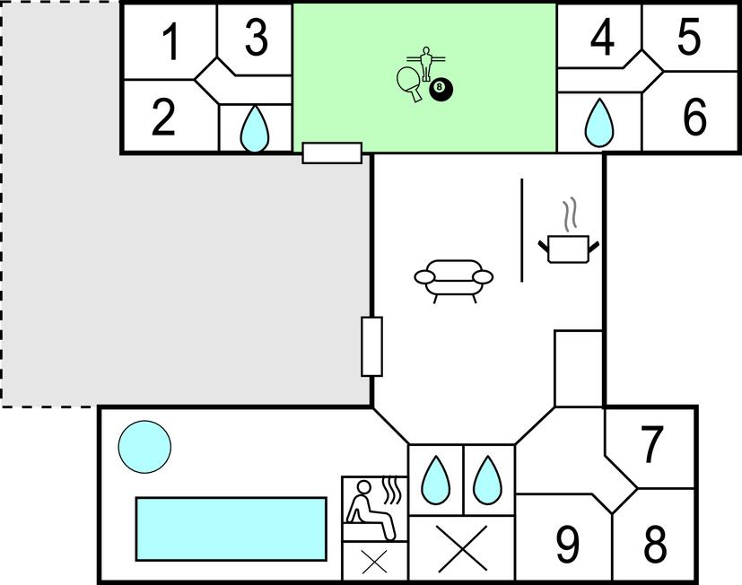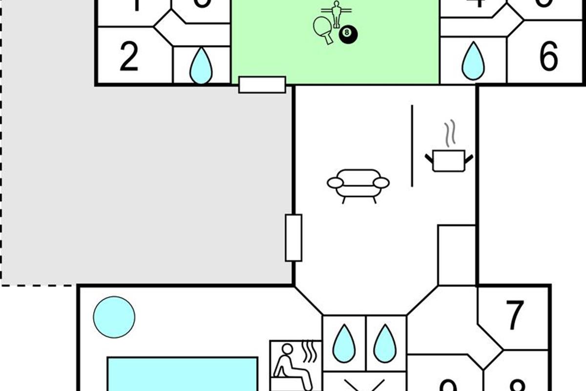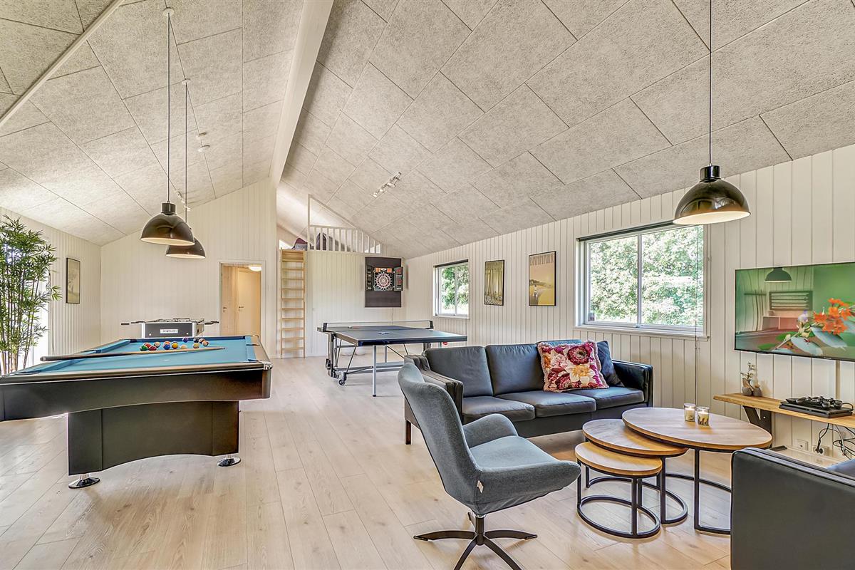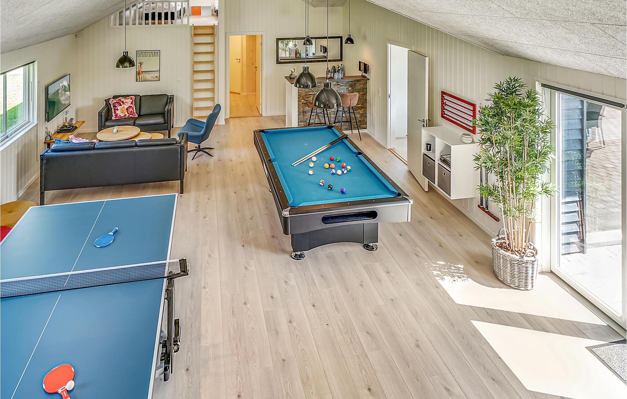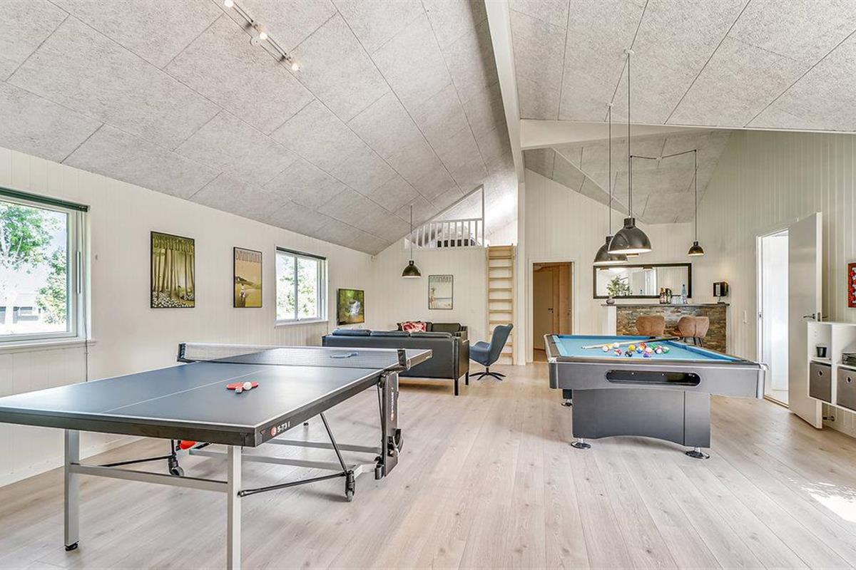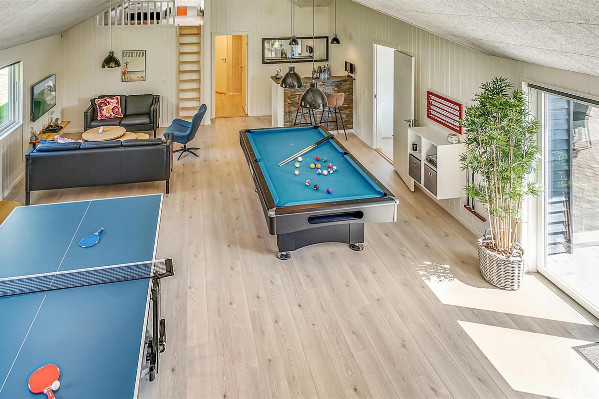 Aan de ene kant van het poolhuis bevindt zich de populaire speelkamer. Hier kunt u biljarten, tafeltennissen, darten of tafelvoetballen. Er is ruimte voor toeschouwers aan de bar in de hoek, terwijl u kunt ontspannen op de bank of Play Station 4 kunt spelen.