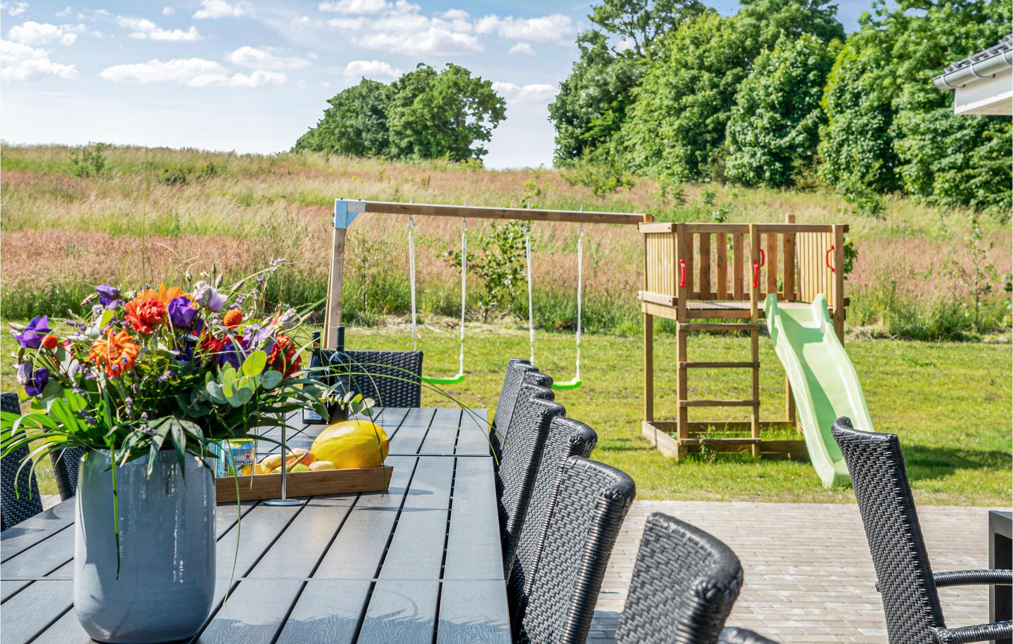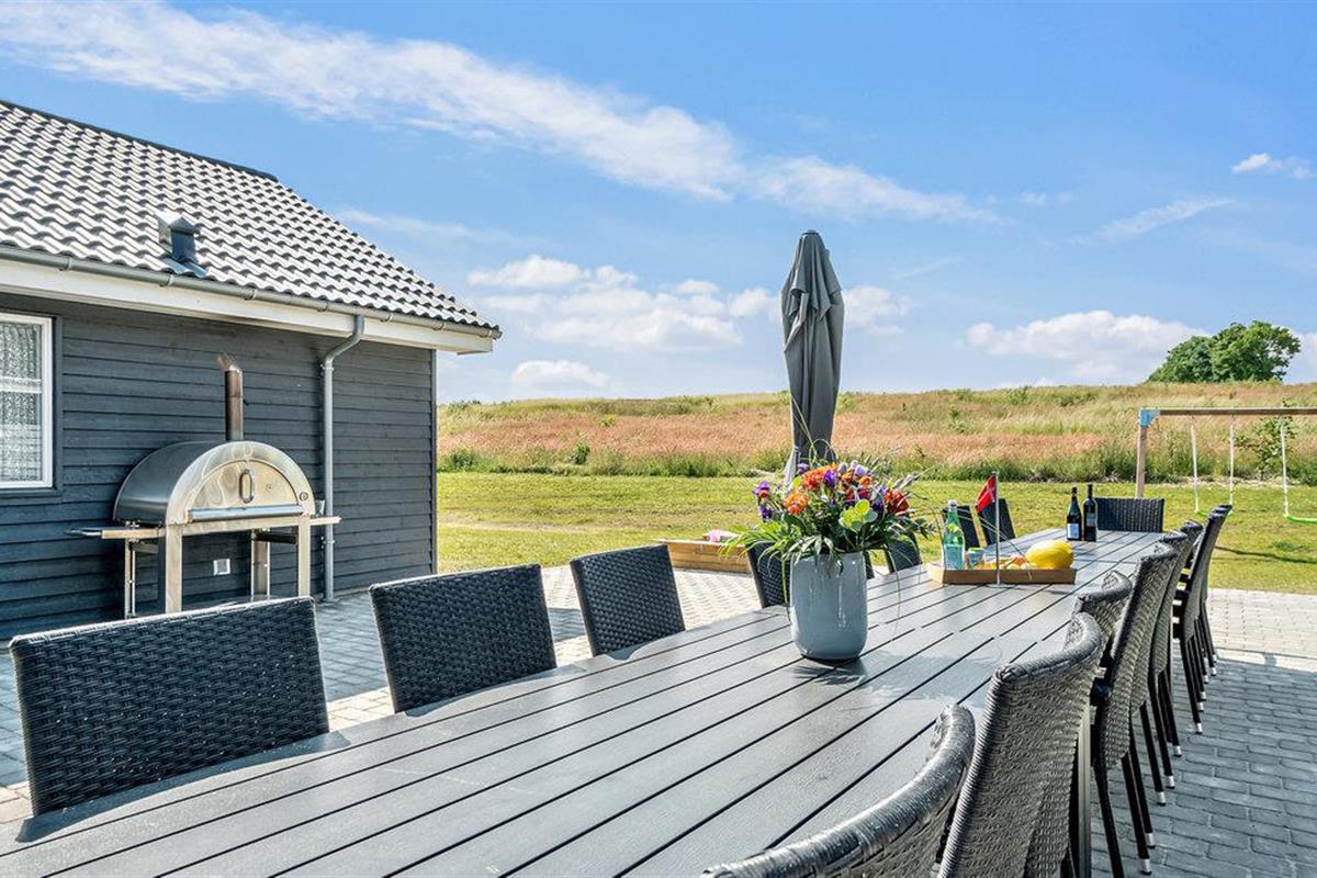Het gedeeltelijk overdekte terras is uitgerust met tuinmeubelen en een barbecue en een pizza-oven. In de tuin is er een schommel, een zandbak, voetbalgoals (in de zomer) en een trampoline voor de jongste gasten.