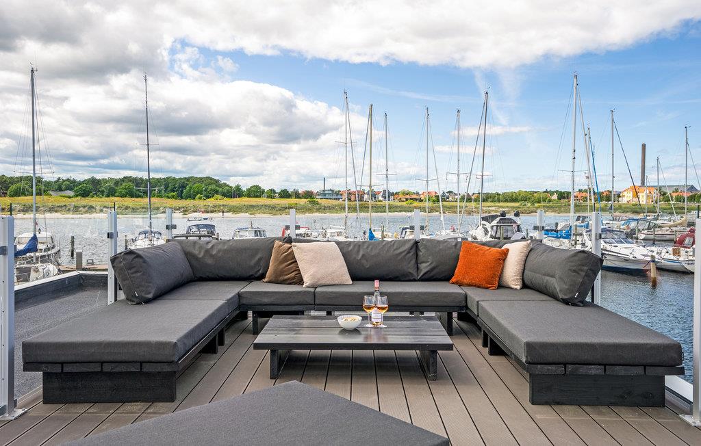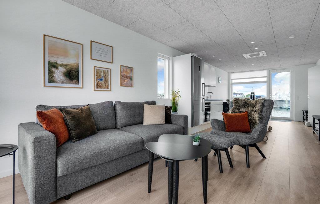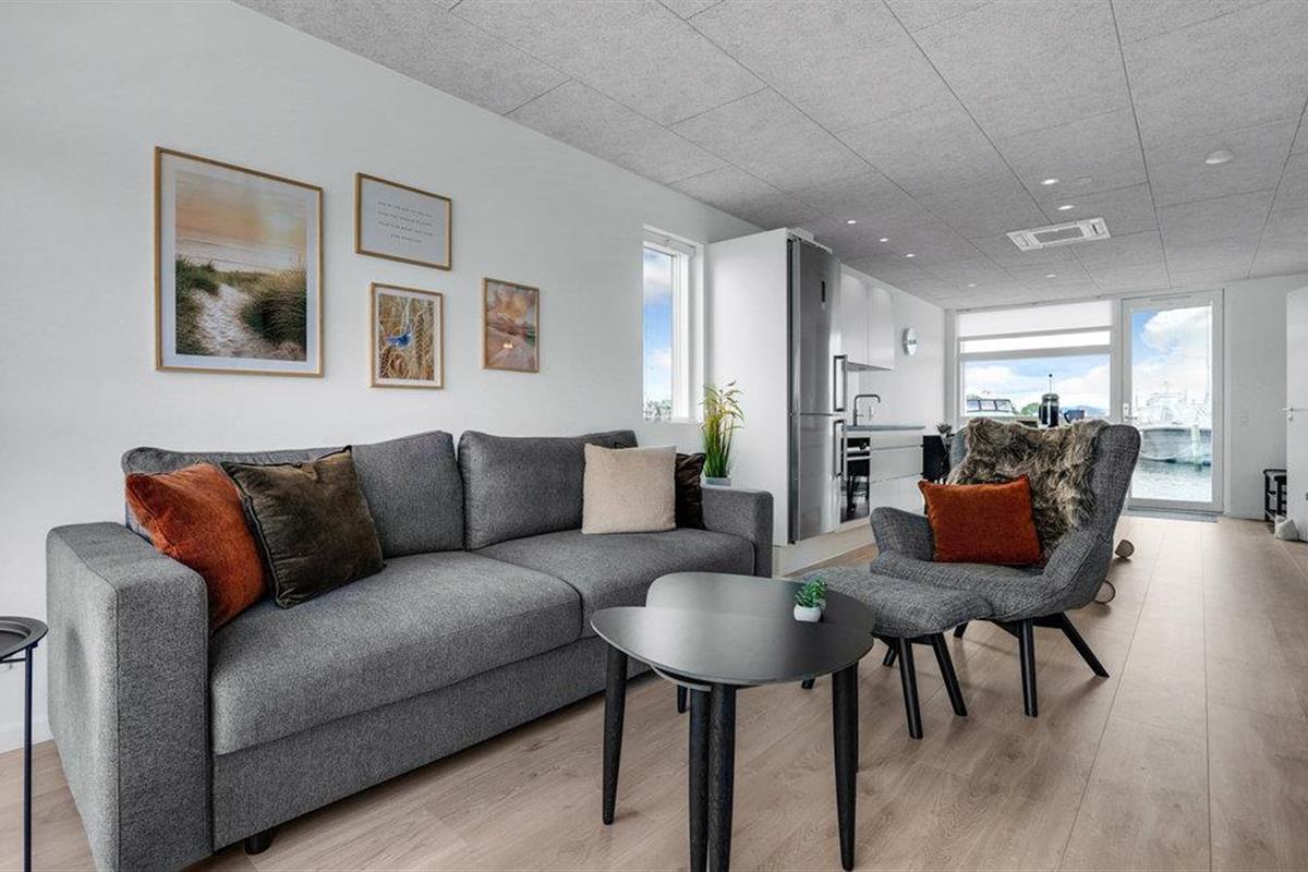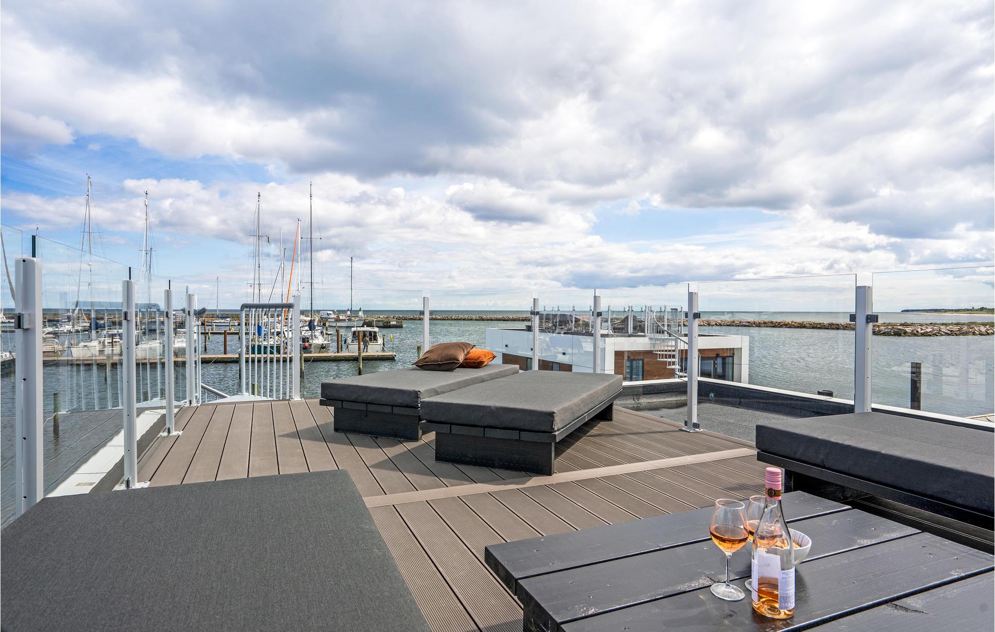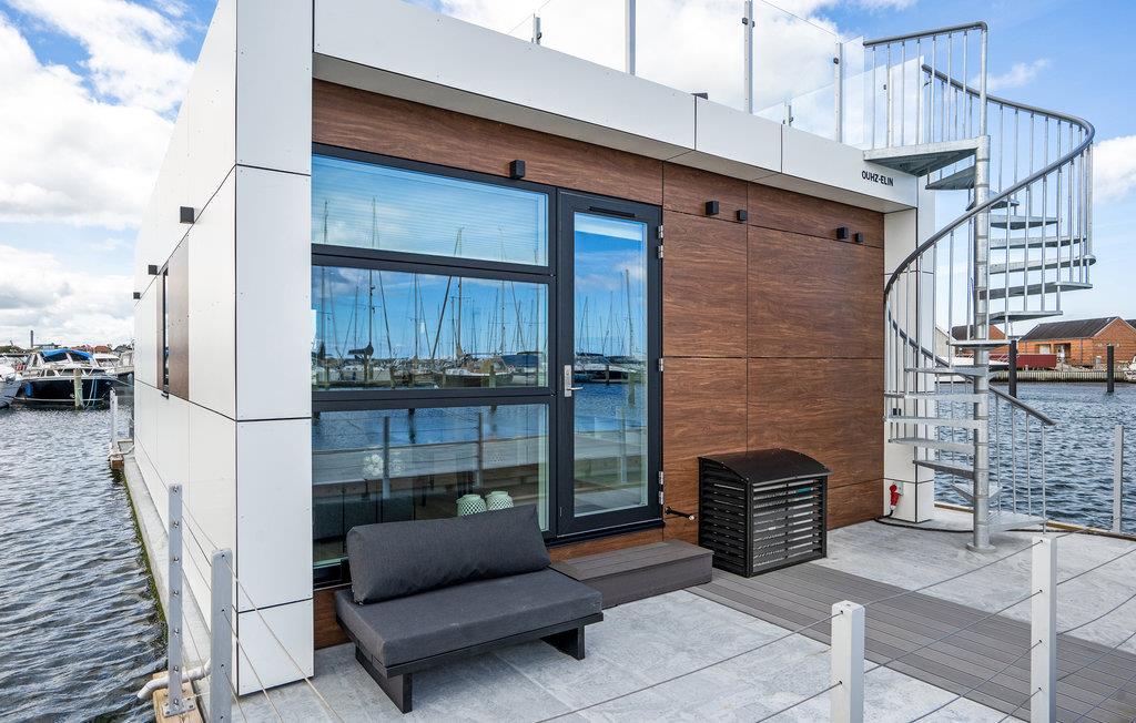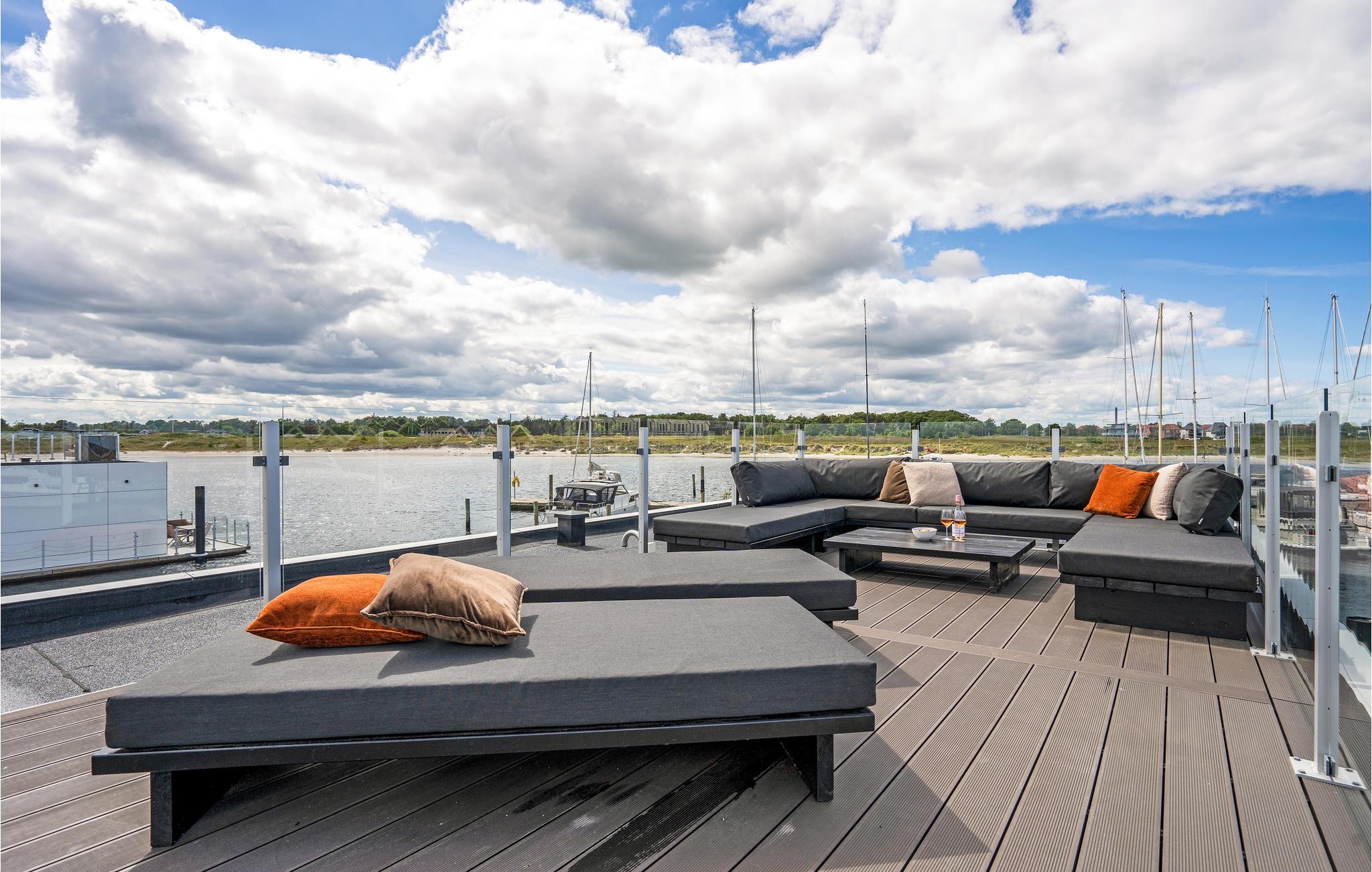 Ontdek deze moderne woonboot in Grenå met panorama-uitzicht, terras en dichtbij het strand voor een unieke vakantie aan het water.