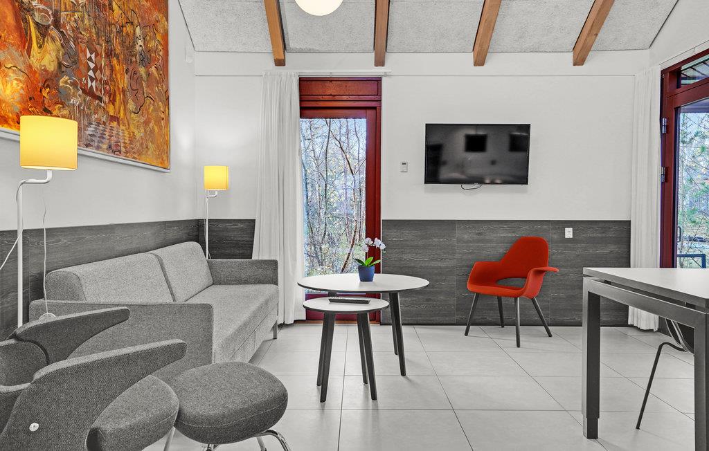 Dit lichte en vriendelijke vakantiehuis verwelkomt maximaal vijf gasten en een extra peuter. In het praktische vakantiehuis vindt u een mooie woonkamer met keuken. Hier kunt u het zich op koude dagen comfortabel maken voor de houtkachel. Veel licht stroomt door de grote ramen. Het vakantiehuis is licht en sfeervol ingericht.