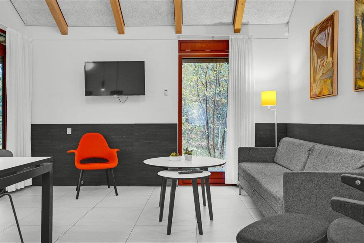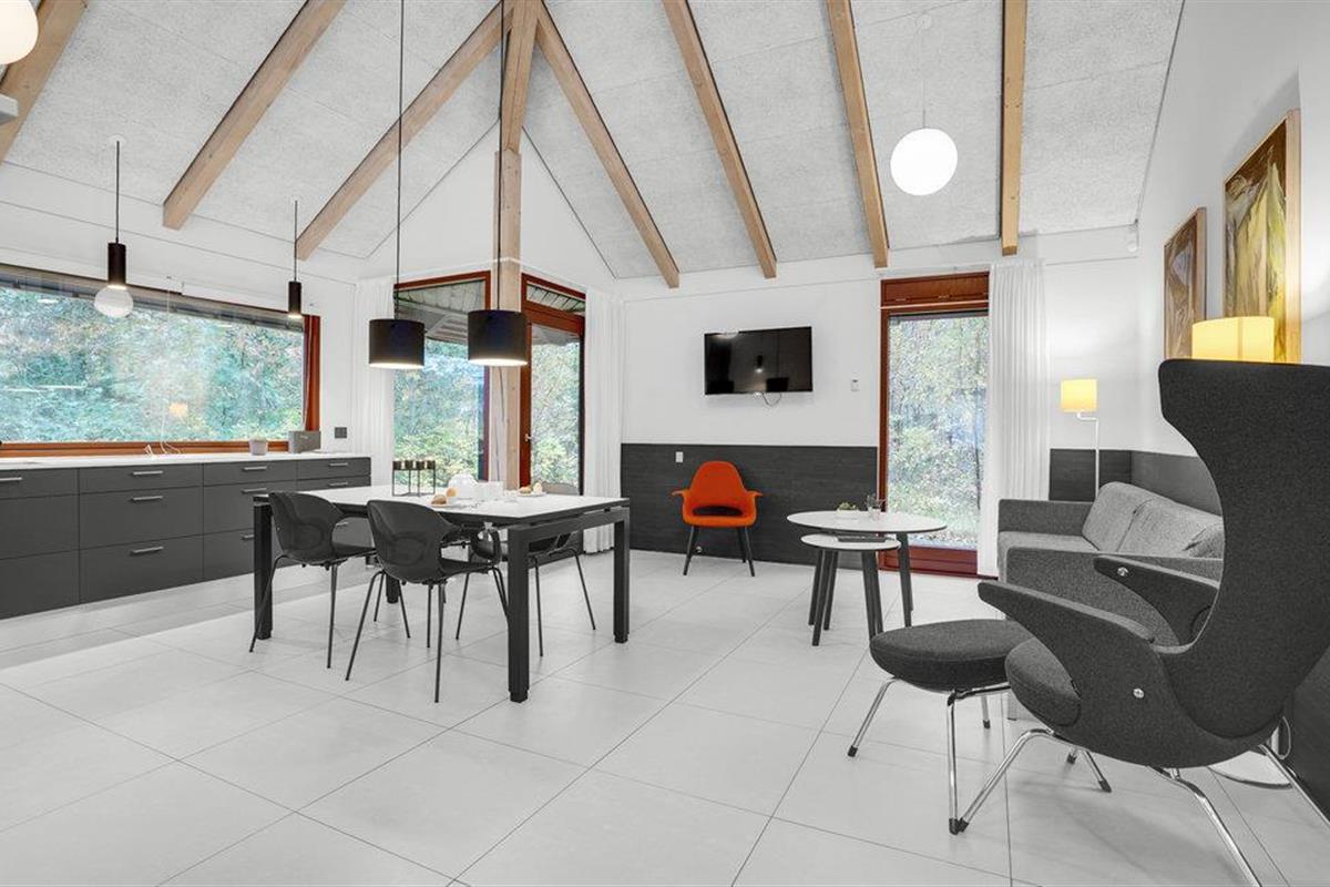 Dit lichte en vriendelijke vakantiehuis verwelkomt maximaal vijf gasten en een extra peuter. In het praktische vakantiehuis vindt u een mooie woonkamer met keuken. Hier kunt u het zich op koude dagen comfortabel maken voor de houtkachel. Veel licht stroomt door de grote ramen. Het vakantiehuis is licht en sfeervol ingericht.
