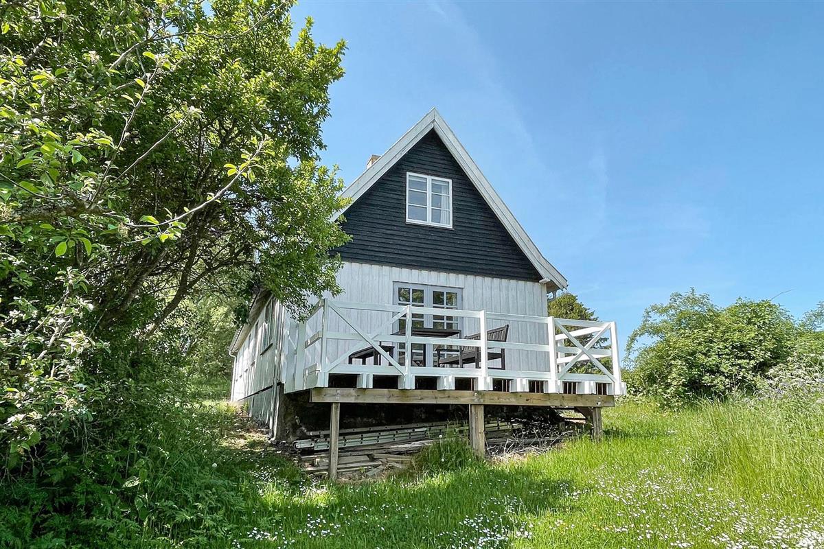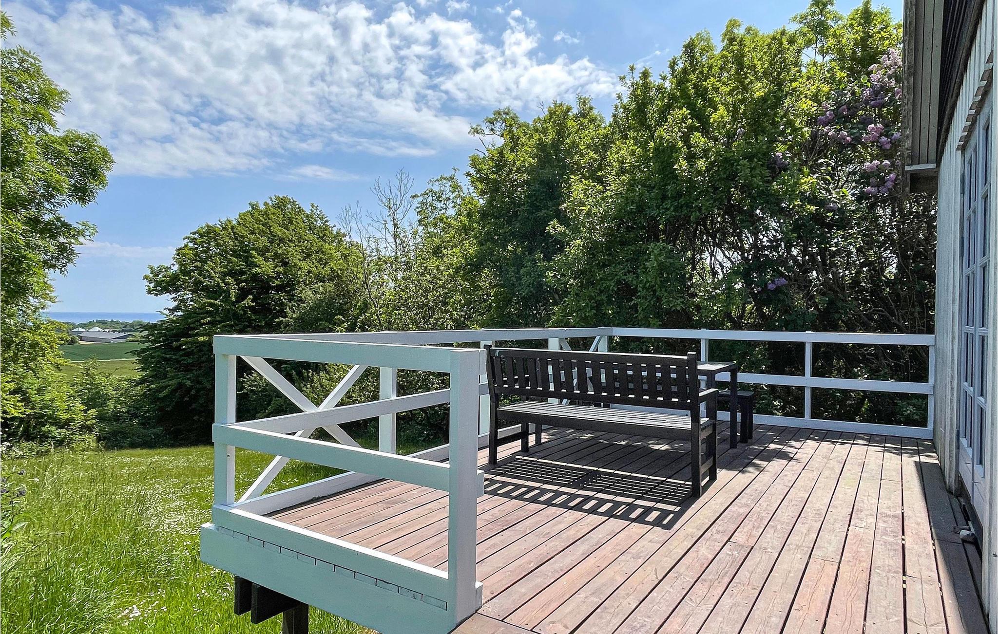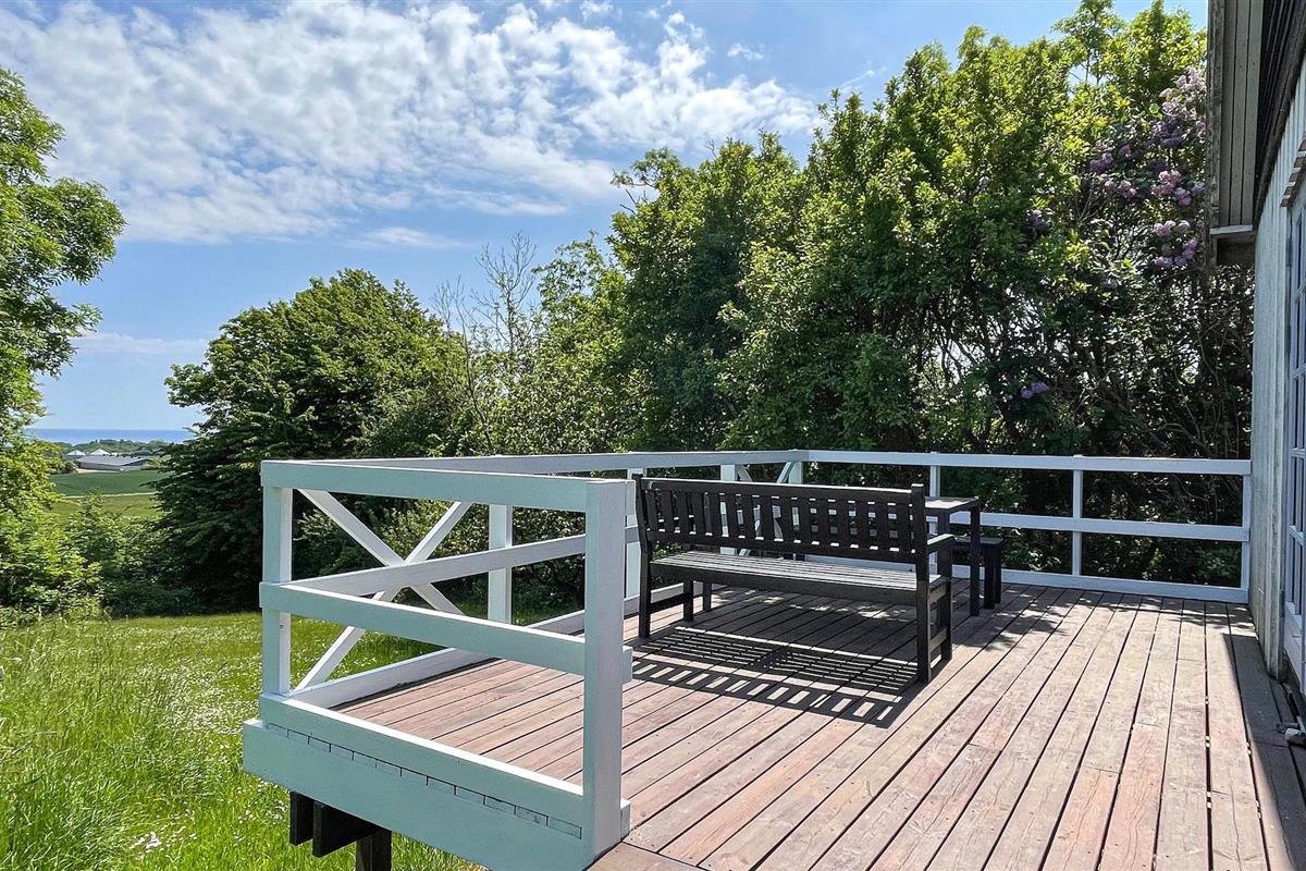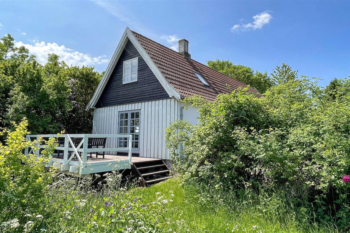 Gezellig en licht vakantiehuis met rustieke sfeer, houten terras en gedeeltelijk zeezicht nabij Gudhjem op Bornholm.