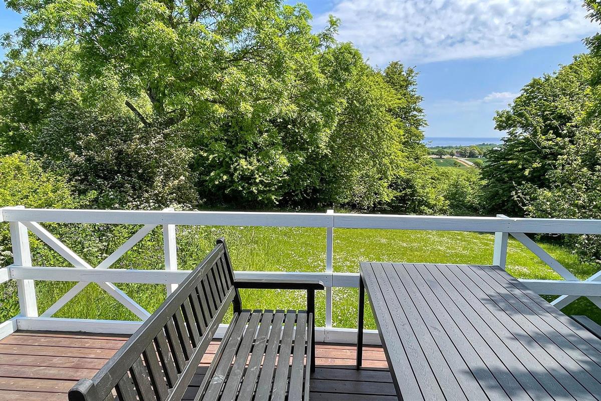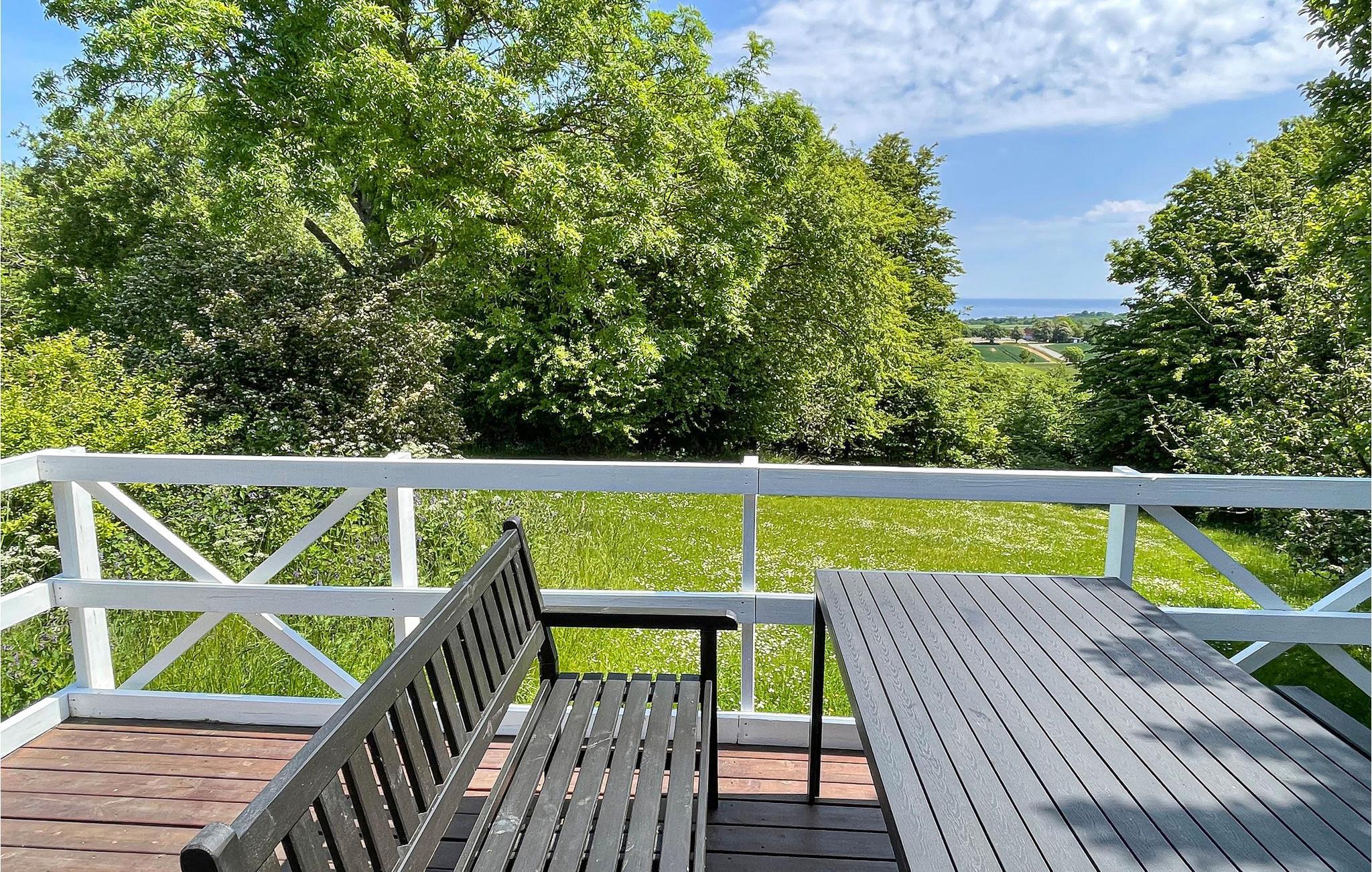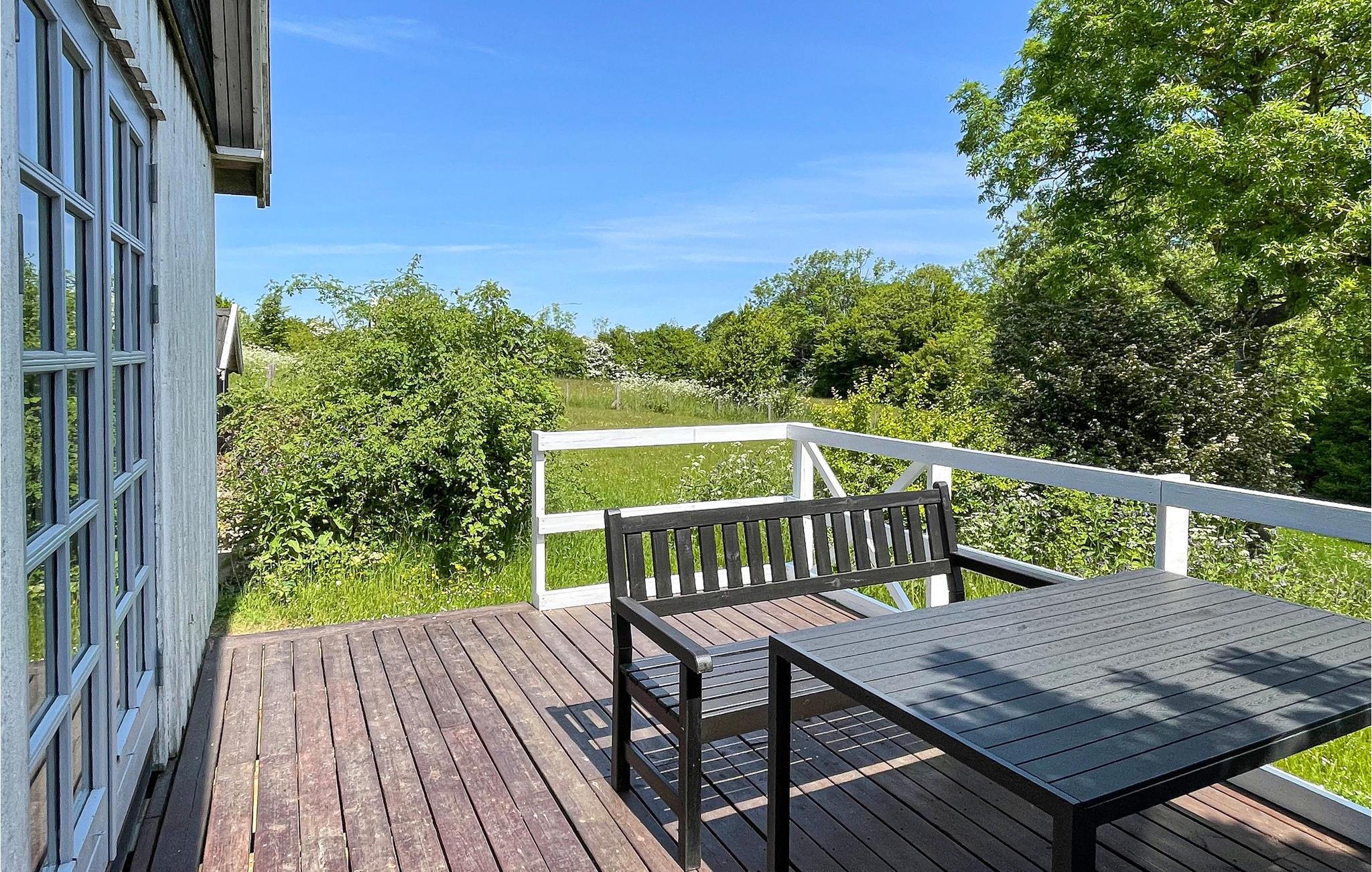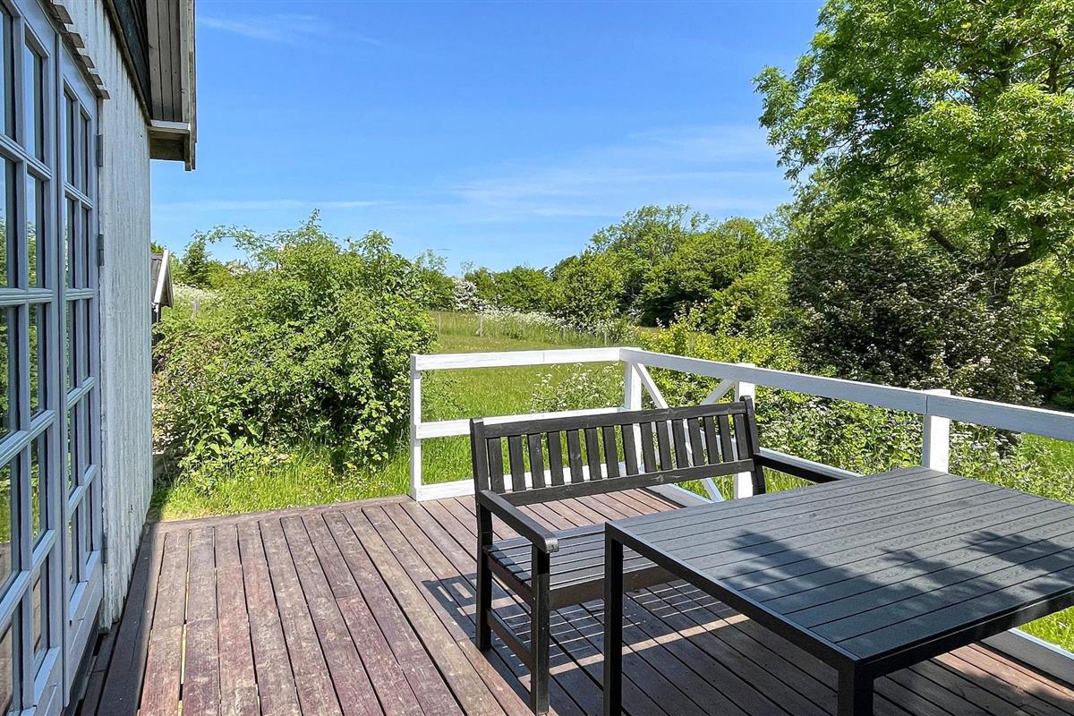 Gezellig en licht vakantiehuis met rustieke sfeer, houten terras en gedeeltelijk zeezicht nabij Gudhjem op Bornholm.