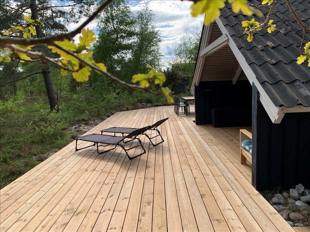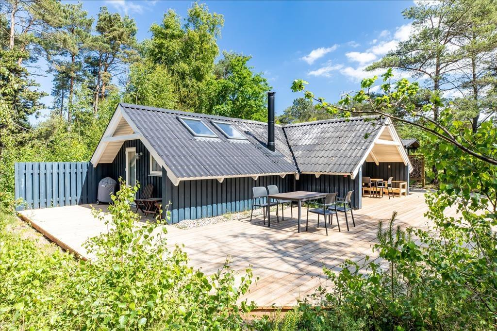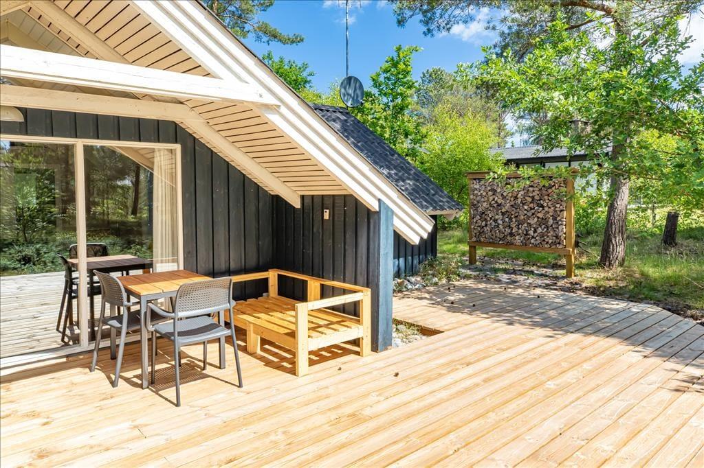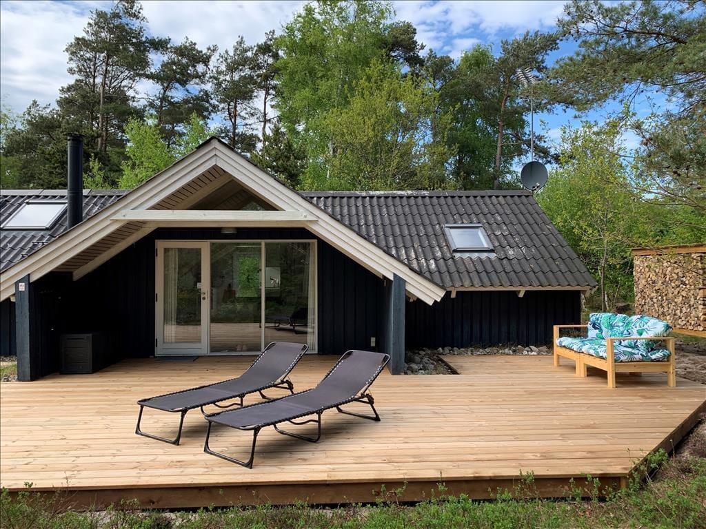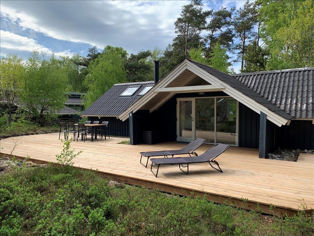 Das Haus empfängt Sie mit einem gemütlichen Wohnraum, der über ein Sofaarrangement vor dem Kaminofen verfügt und mit seinem Ausblick auf das Naturgrundstück mit herrlicher Heide besticht, auf dem Sie mit ein wenig Glück äsende Rehe beobachten werden. Im großen Esszimmer ist ein Schlafsofa für zwei Personen untergebracht. Das Esszimmer grenzt direkt an die offene Küche und verwöhnt Ihre Kinder mit viel Platz zum Spielen. In der Küche erleichtert Ihnen ein Geschirrspüler den täglichen Abwasch. Die Schlafplätze verteilen sich neben dem bereits erwähnten Schlafsofa auf einen Schlafraum mit einem Doppelbett und einen Schlafraum mit zwei Einzelbetten, einer Kommode und Schrankfläche. Das Badezimmer beinhaltet eine Dusche. Aufgrund der Dachkonstruktion und der Dachfenster dürfen Sie sich auf einen fantastischen Tageslichteinfall freuen. Die große Holzterrasse ist direkt vom Wohnraum aus zugänglich und lädt zu herrlichen Stunden mit einem guten Buch, einem ausgedehnten Sonnenbad oder der einen oder anderen geselligen Runde mit einem köstlichen Essen vom Grill ein.