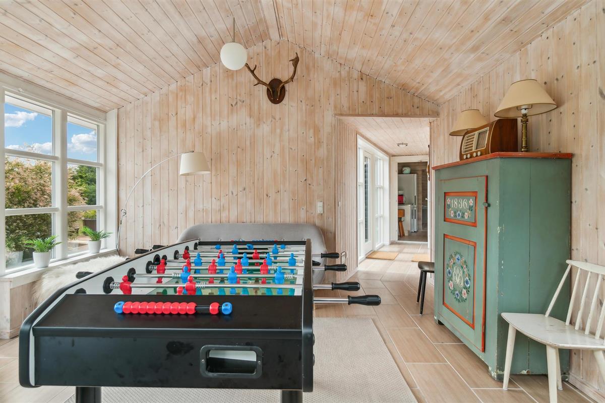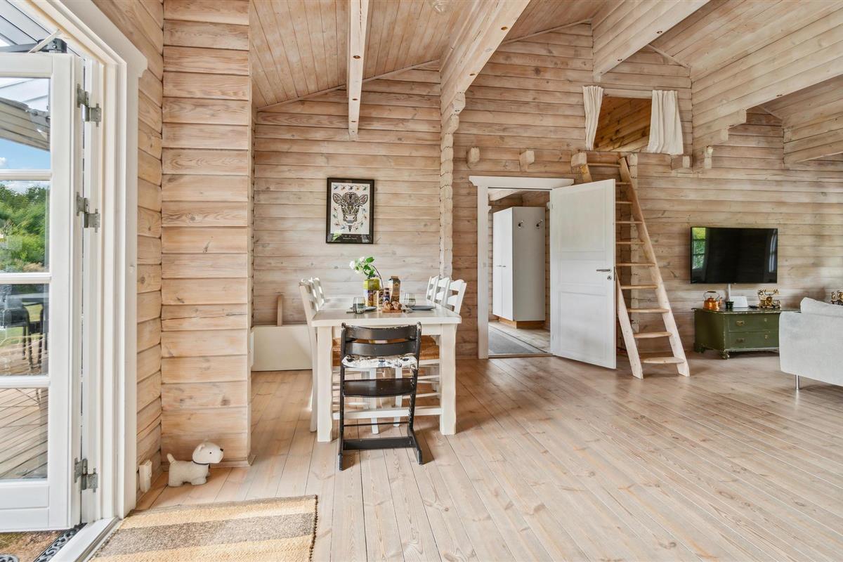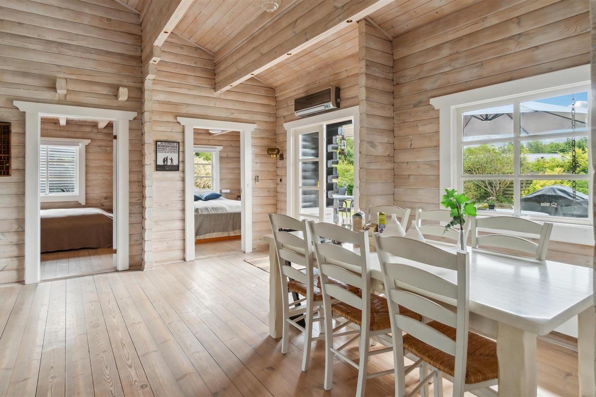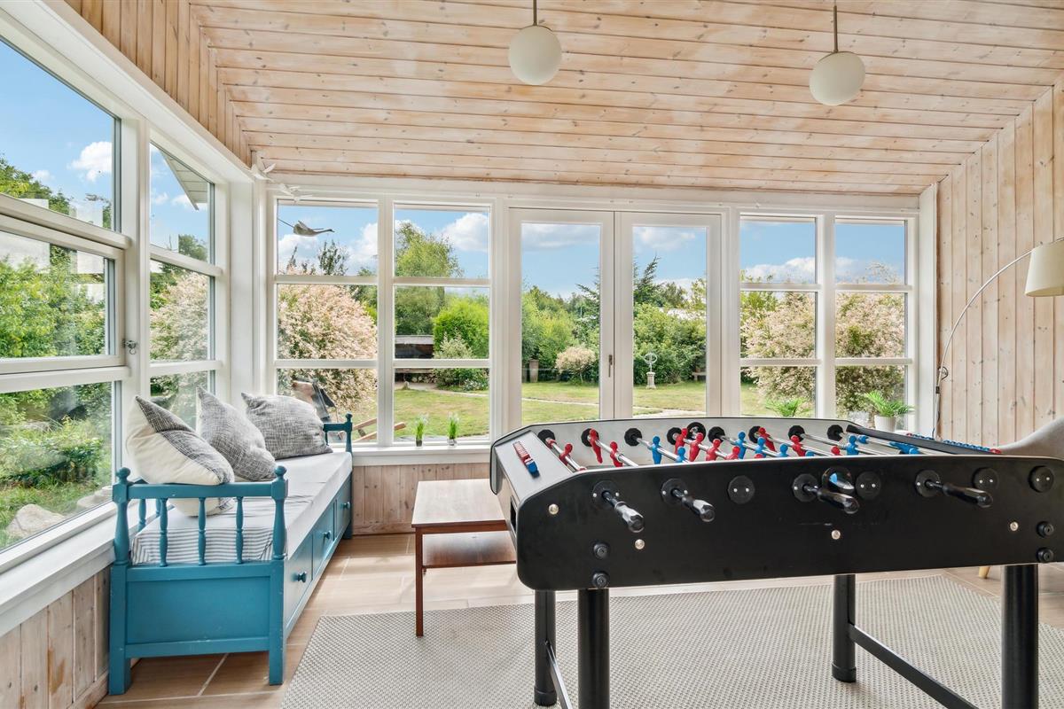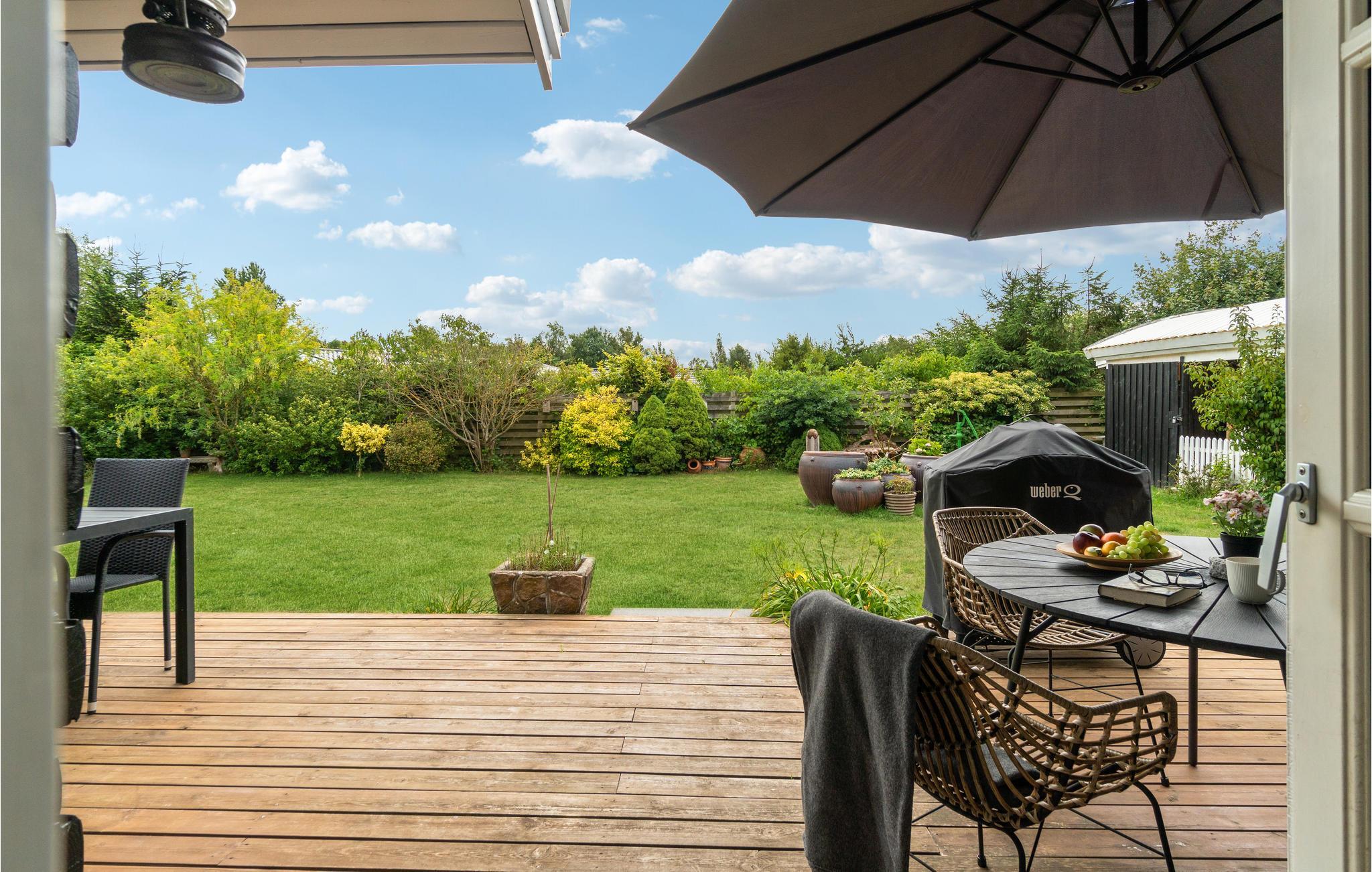 Vanuit de leefruimtes stap je op het uitgestrekte terras met verschillende hoekjes die je uitnodigen om te luieren en te zonnebaden. Buiten heeft het vakantiehuis ook veel te bieden, zoals de buitendouche, die gewaardeerd wordt op warme dagen, of de open haard, waar je 's avonds marshmellows kunt roosteren en in het vuur kunt staren. Je kunt zelfs buiten overnachten in de typisch Deense schuilplaats.