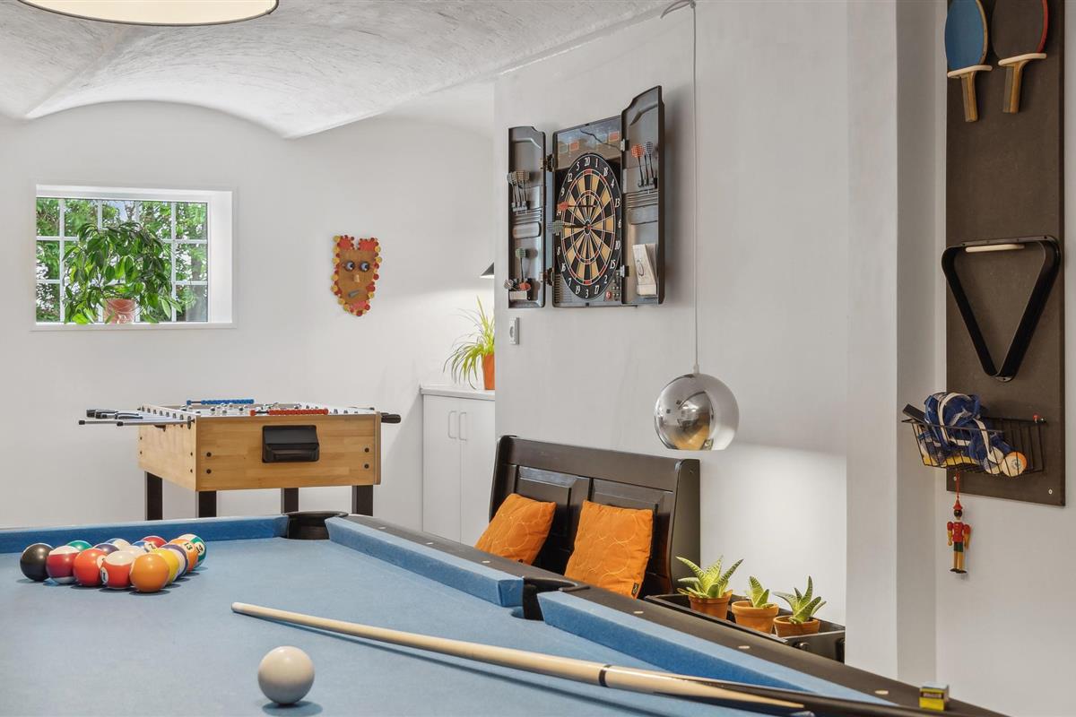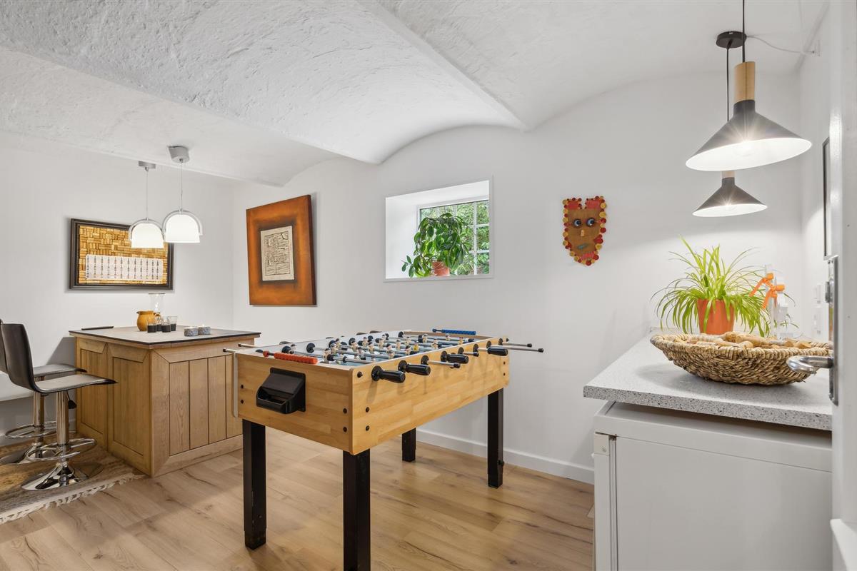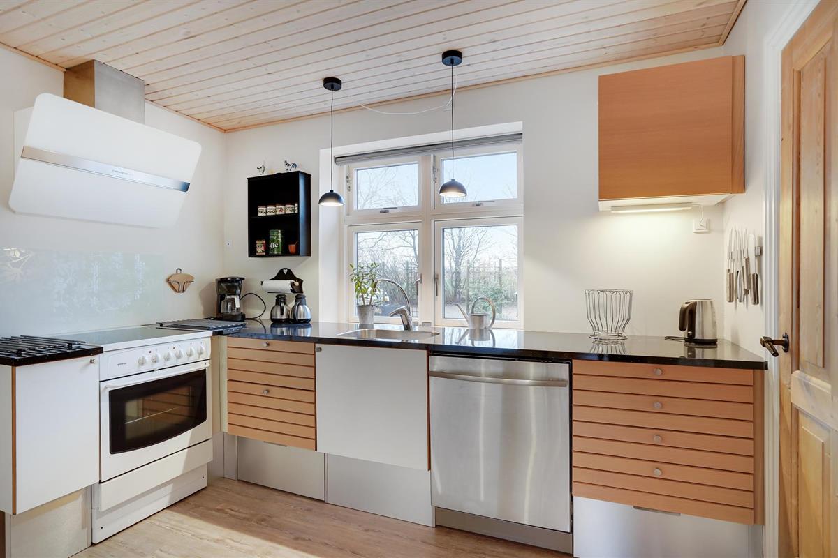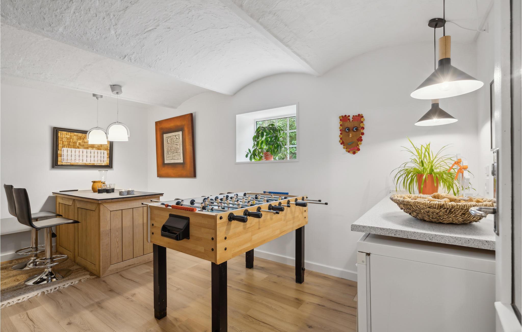 De keuken is goed uitgerust, compleet met bijkeuken met ruimte voor alle drankjes en etenswaren die u op vakantie heeft meegenomen. Vanuit de keuken heeft u toegang tot het eetgedeelte en de woonkamer, waar een warmtepomp staat als extra en energiebesparende warmtebron. In de gang naast de 2 slaapkamers staat nog een warmtepomp, die zorgt voor een aangenaam binnenklimaat in het huis. In de hobbyruimte van 40 m² kunt u biljarten of tafeltennissen en drankjes mixen aan de bar. Er zijn 2 mooie terrassen bij het huis en de tuin is omringd door bomen en het kleurenspel weerspiegelt het verstrijken van de seizoenen. Als u vroeg in het jaar aankomt vindt u prachtige witte sneeuwklokjes in de tuin, daarna verandert het in gele narcissen en later in het jaar is er een zee van paarse bloemen.