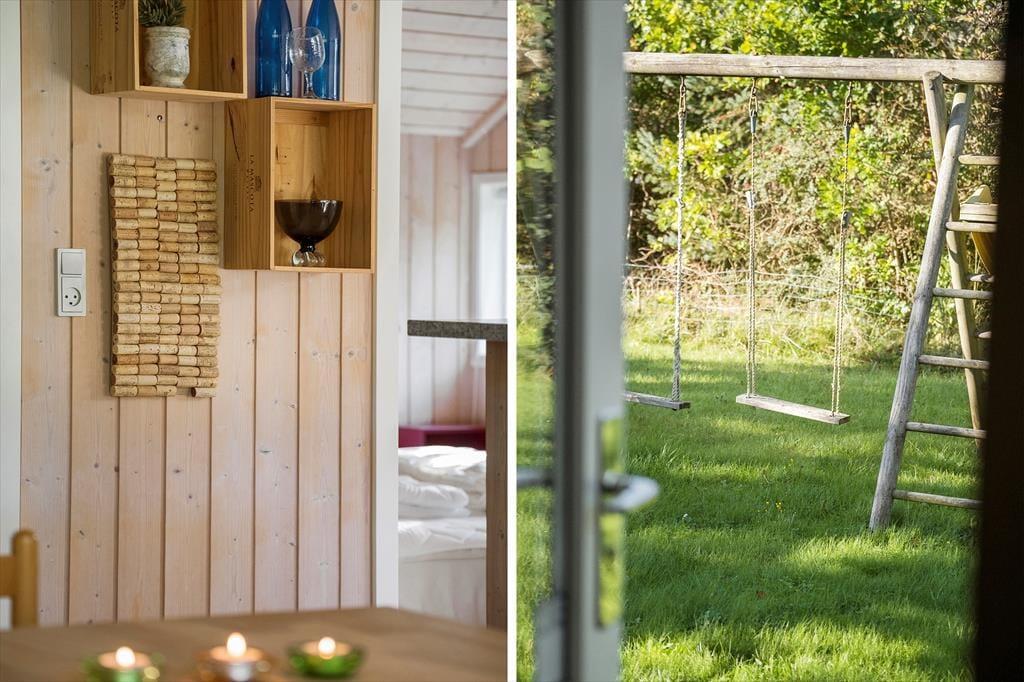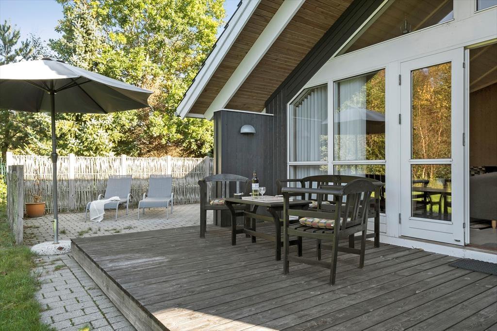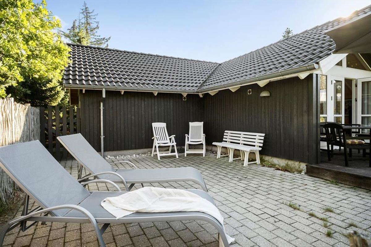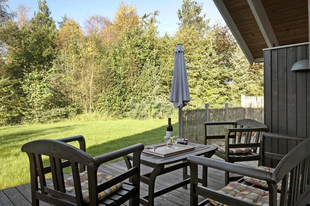 Vom Wohnzimmer aus treten Sie direkt hinaus auf die teilweise überdachte, nach Südwesten ausgerichtete Holzterrasse, auf der Sie sich wunderbar von den letzten Sonnenstrahlen des Tages verwöhnen lassen können. Ein gepflastertes Terrassenareal umgibt zudem einen Großteil des wunderschönen Urlaubsdomizils. Somit werden Sie, je nach Tageszeit und persönlicher Vorliebe, stets ein sonniges, schattiges oder auch windgeschütztes und ungestörtes Plätzchen finden. Während Sie sich in aller Ruhe unter freiem Himmel erholen und entspannen, werden Ihre Kinder vergnügt auf der rasenfläche des 1.250 m² großen Grundstücks umhertollen und vergnügt spielen.