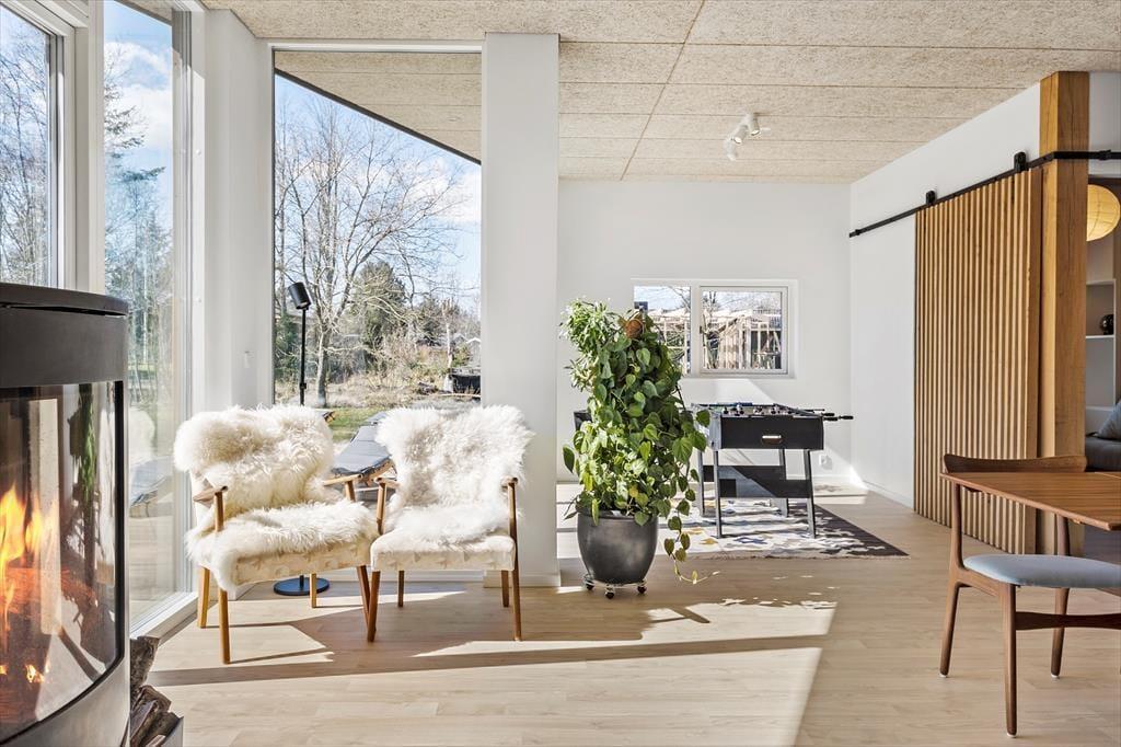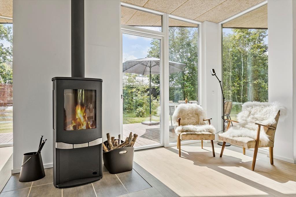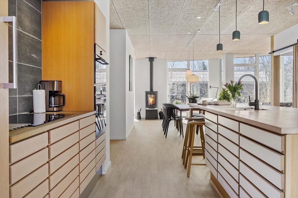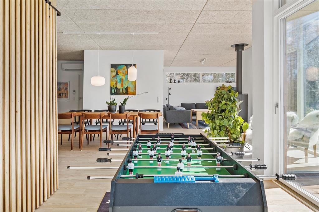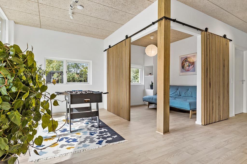 Das moderne 129 m2 große Haus bietet Platz für acht Personen und ist damit ideal für zwei Familien mit Kindern, eine Mehrgenerationenfamilie oder einen Pärchenurlaub mit guten Freunden. Zwei Bäder und vier Schlafzimmer sind gleichmäßig auf zwei Schlafbereiche verteilt, wobei eines der Bäder besonders groß und schön mit einer Wellness-Badewanne ausgestattet ist. Das Herzstück des Hauses ist der Wohnbereich, der durch die hellen Fenster und die Wahl der Materialien für die Einrichtung und das Mobiliar eine luftige und einladende Atmosphäre hat. In der Nähe der Sofaecke und des Esstisches befindet sich ein Holzofen, und es gibt auch eine Ecke mit einem Tischfußballtisch, an dem sich ein Teil der Gruppe vergnügen kann, während der Rest das Essen in der offenen Küche genießen kann.