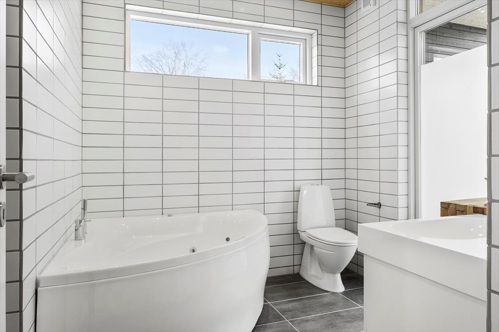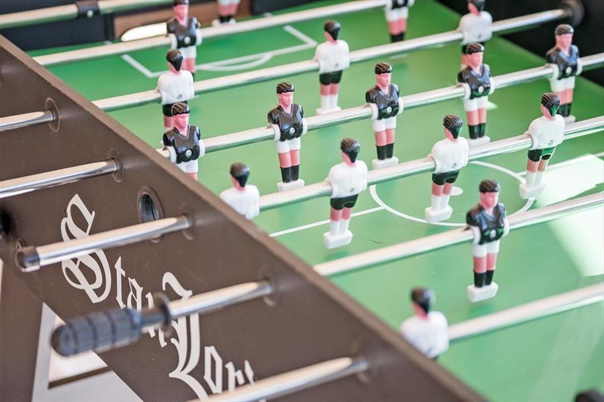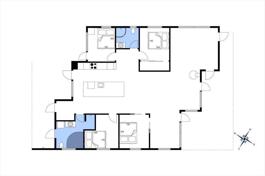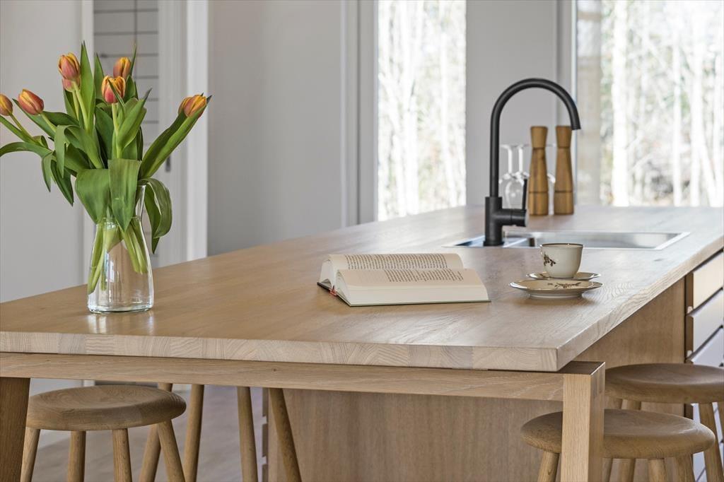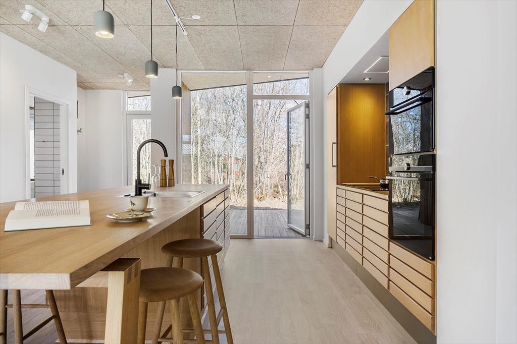 Das moderne 129 m2 große Haus bietet Platz für acht Personen und ist damit ideal für zwei Familien mit Kindern, eine Mehrgenerationenfamilie oder einen Pärchenurlaub mit guten Freunden. Zwei Bäder und vier Schlafzimmer sind gleichmäßig auf zwei Schlafbereiche verteilt, wobei eines der Bäder besonders groß und schön mit einer Wellness-Badewanne ausgestattet ist. Das Herzstück des Hauses ist der Wohnbereich, der durch die hellen Fenster und die Wahl der Materialien für die Einrichtung und das Mobiliar eine luftige und einladende Atmosphäre hat. In der Nähe der Sofaecke und des Esstisches befindet sich ein Holzofen, und es gibt auch eine Ecke mit einem Tischfußballtisch, an dem sich ein Teil der Gruppe vergnügen kann, während der Rest das Essen in der offenen Küche genießen kann.