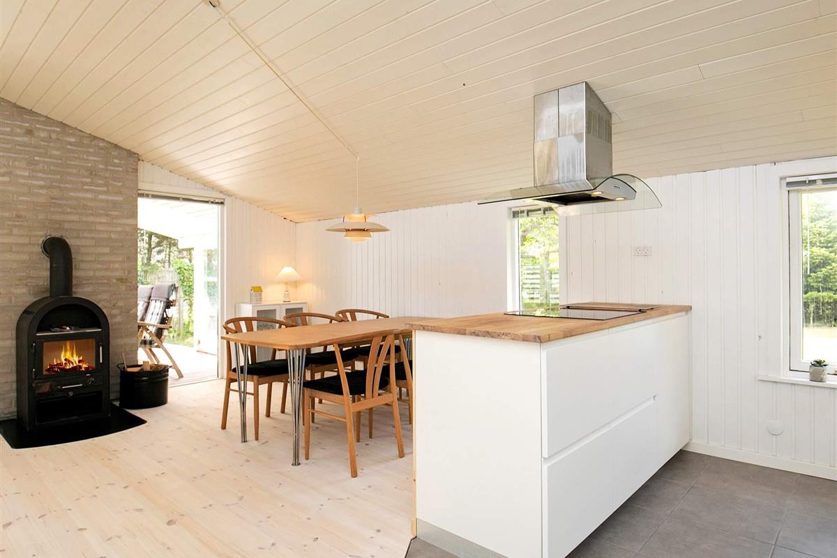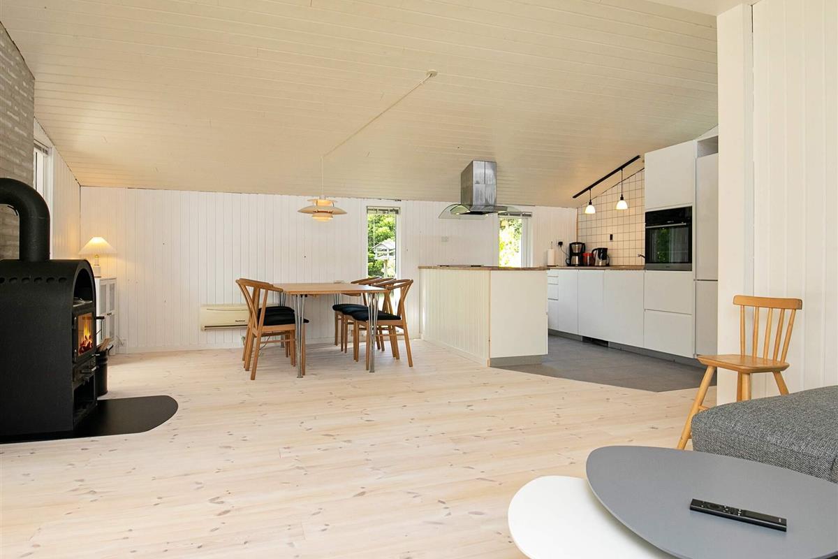 Im Ferienhaus offener Küchen-/Wohnbereich für das Familienleben, ausgestattet mit klimafreundlicher Luft-Luft-Wärmepumpe sowie Holzofen für gemütliche Abende. Der Raum bietet Zugang zur nach Süden ausgerichteten Holzterrasse. Außerdem Eingangsdiele / Flur vorhanden sowie ein Schlafzimmer mit Doppelbett und ein größeres, zweites Schlafzimmer mit Doppelbett sowie doppelter Schlafcouch. Zudem stehen im 2021 neu geschaffenen Annex nebenan ein weiteres Doppelbett und ein Bad bereit.