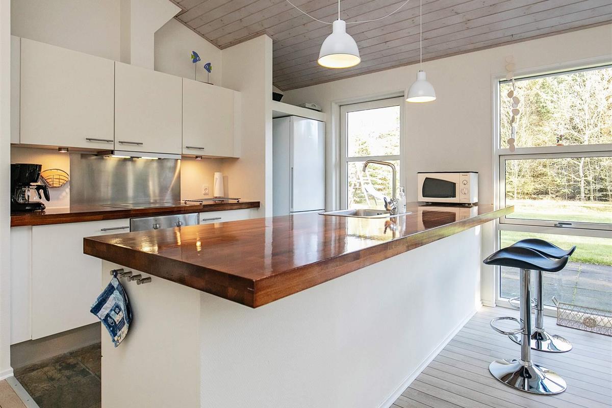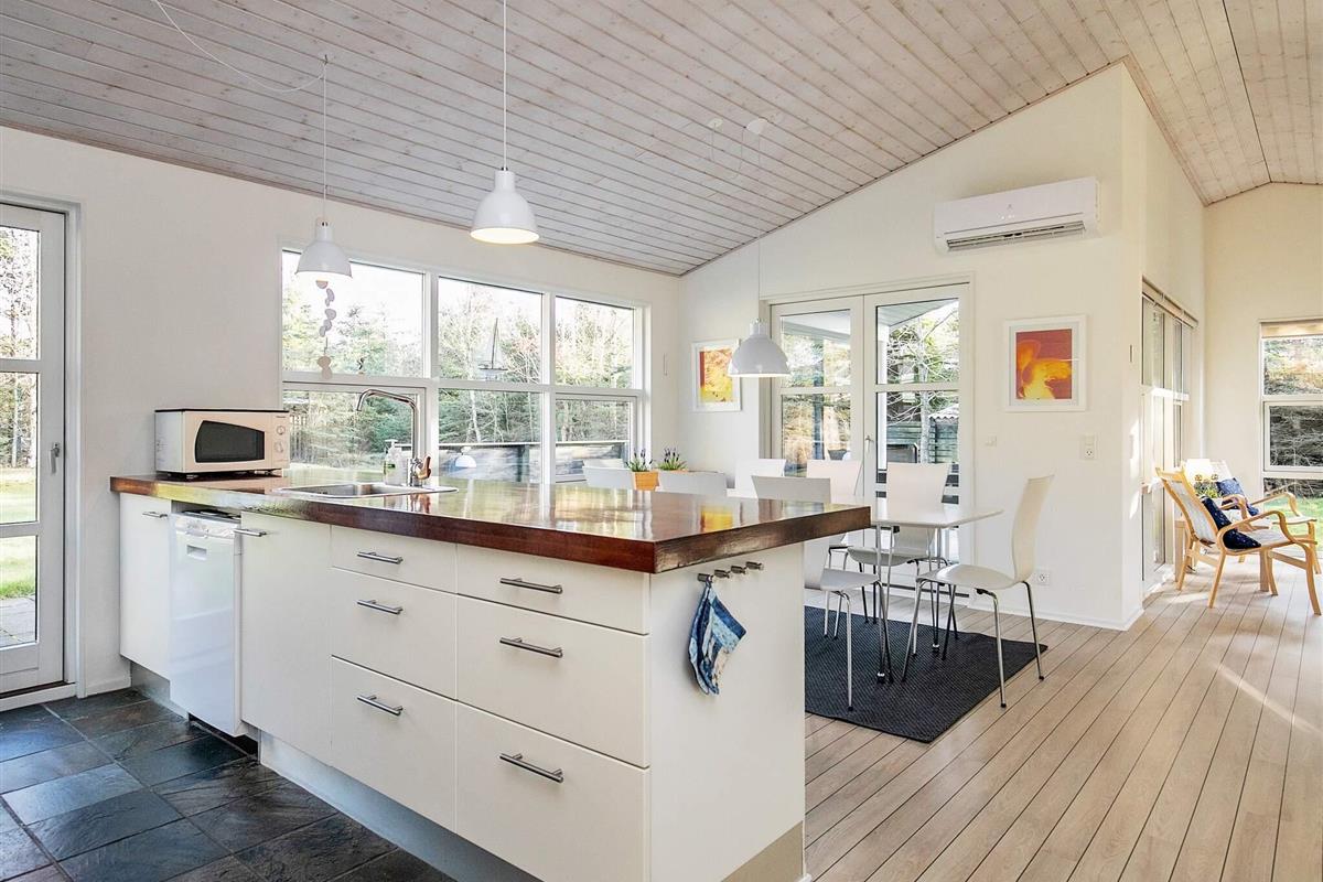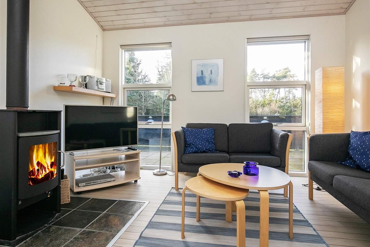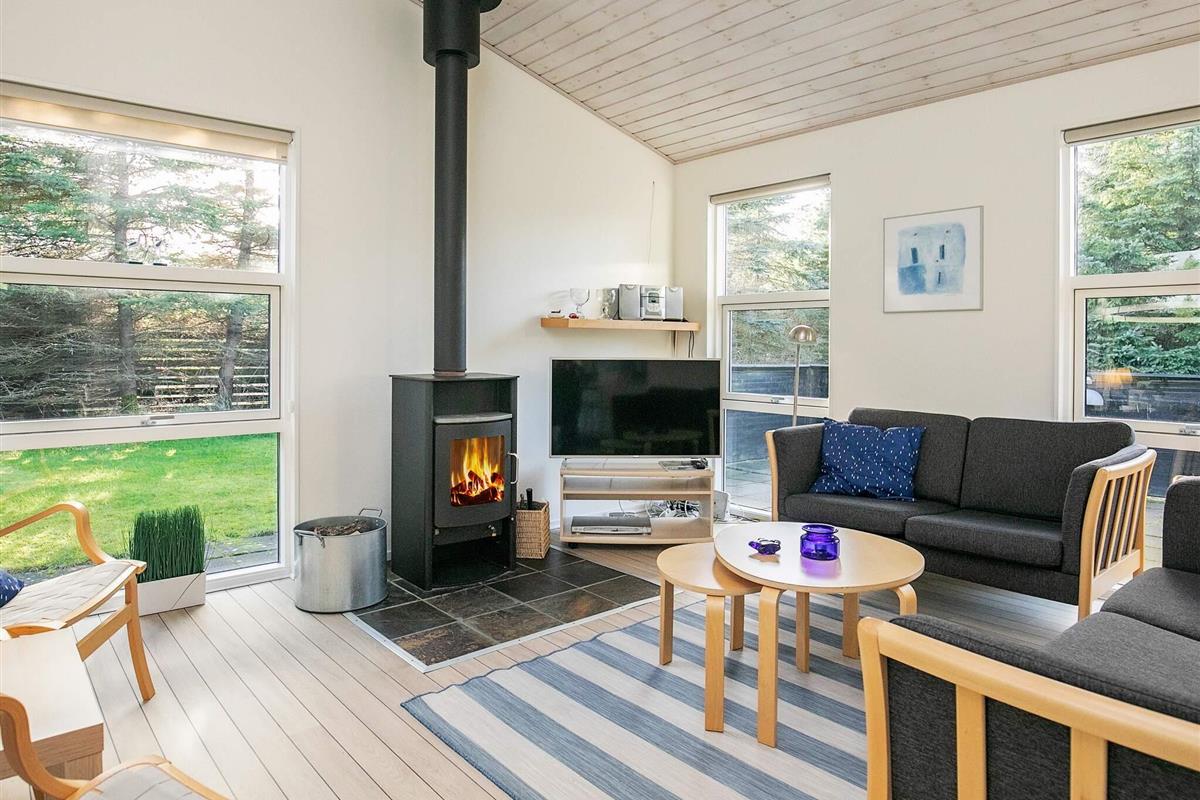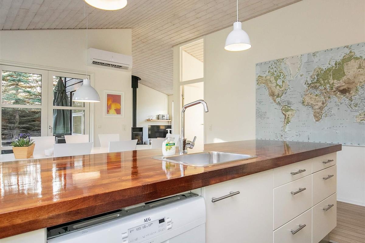 Im Haus stehen drei Schlafzimmer bereit; zwei mit je einem Doppelbett, das dritte mit zwei Etagenbetten bzw. vier Kojen. Das Ferienhaus hat einen offenen Küchen-/Wohnbereich für das Familienleben mit Sitz- und Essecke sowie klimafreundlicher Wärmepumpe und gemütlichem Holzofen für kühlere Abende. Brennholz liegt vor Ort bereit. Badezimmer mit Whirlpool, Waschmaschine und Wäschetrockner sowie Dusche/WC.