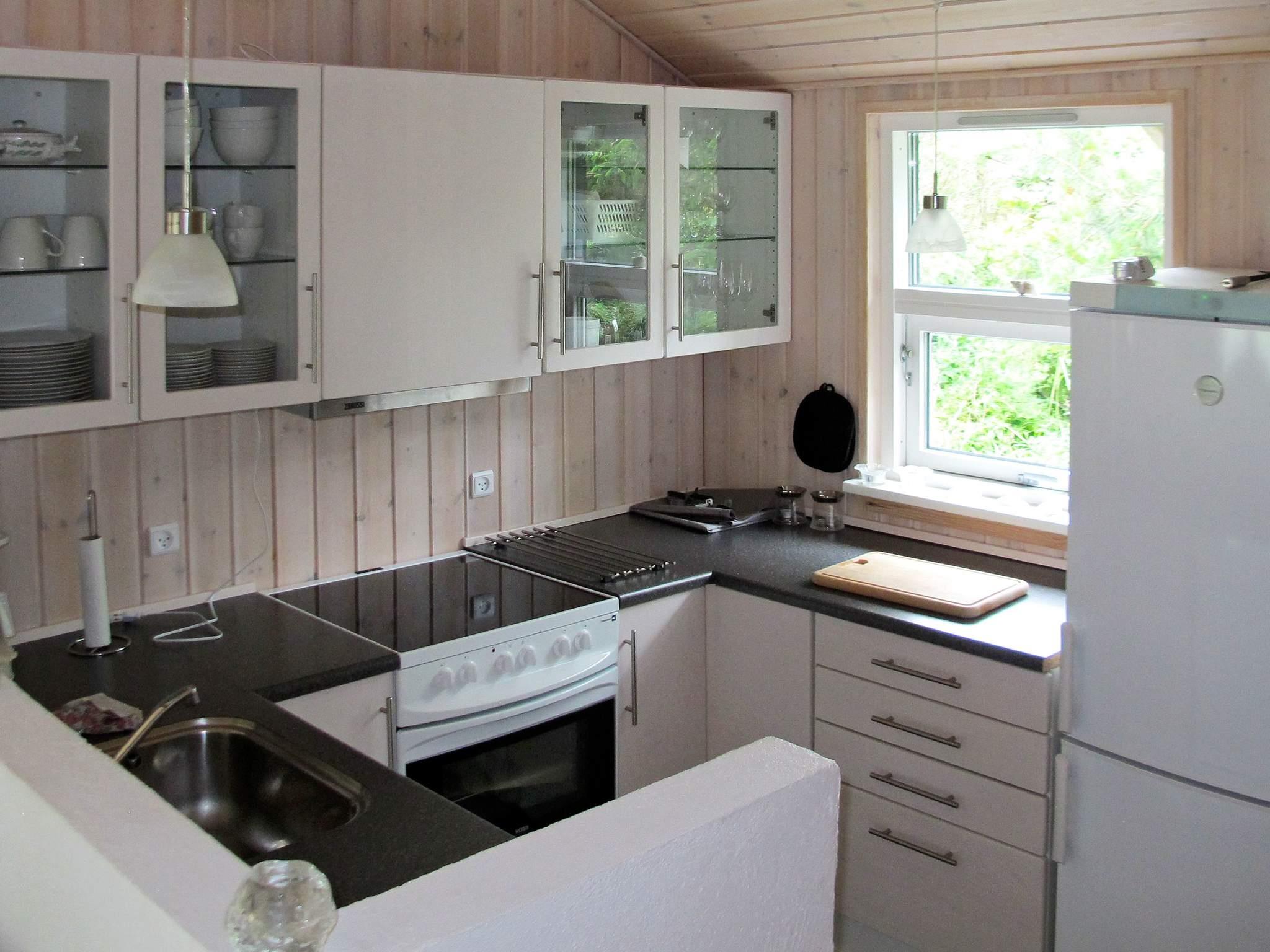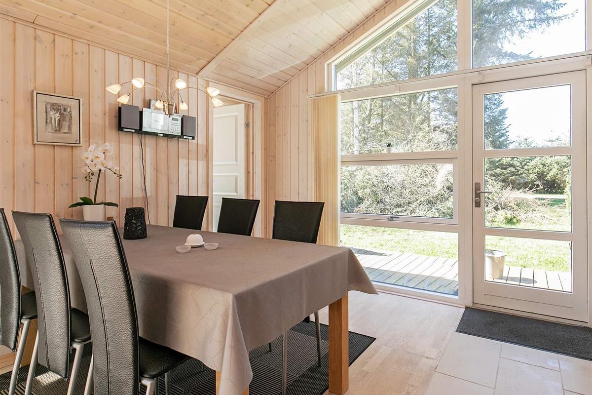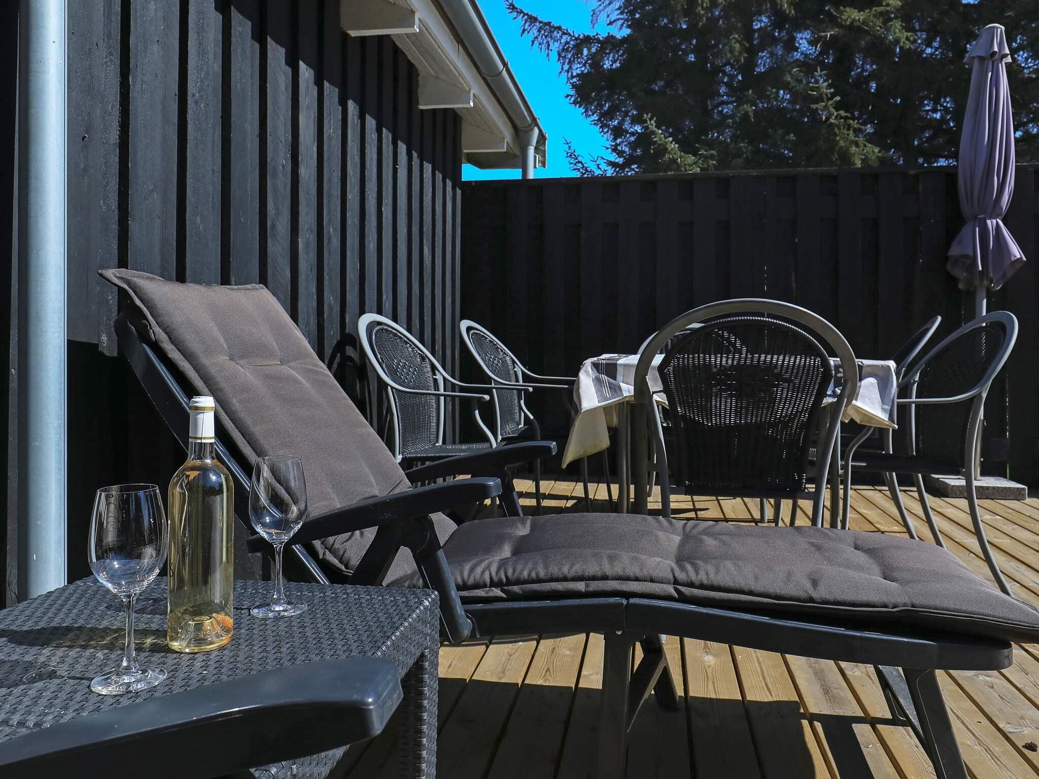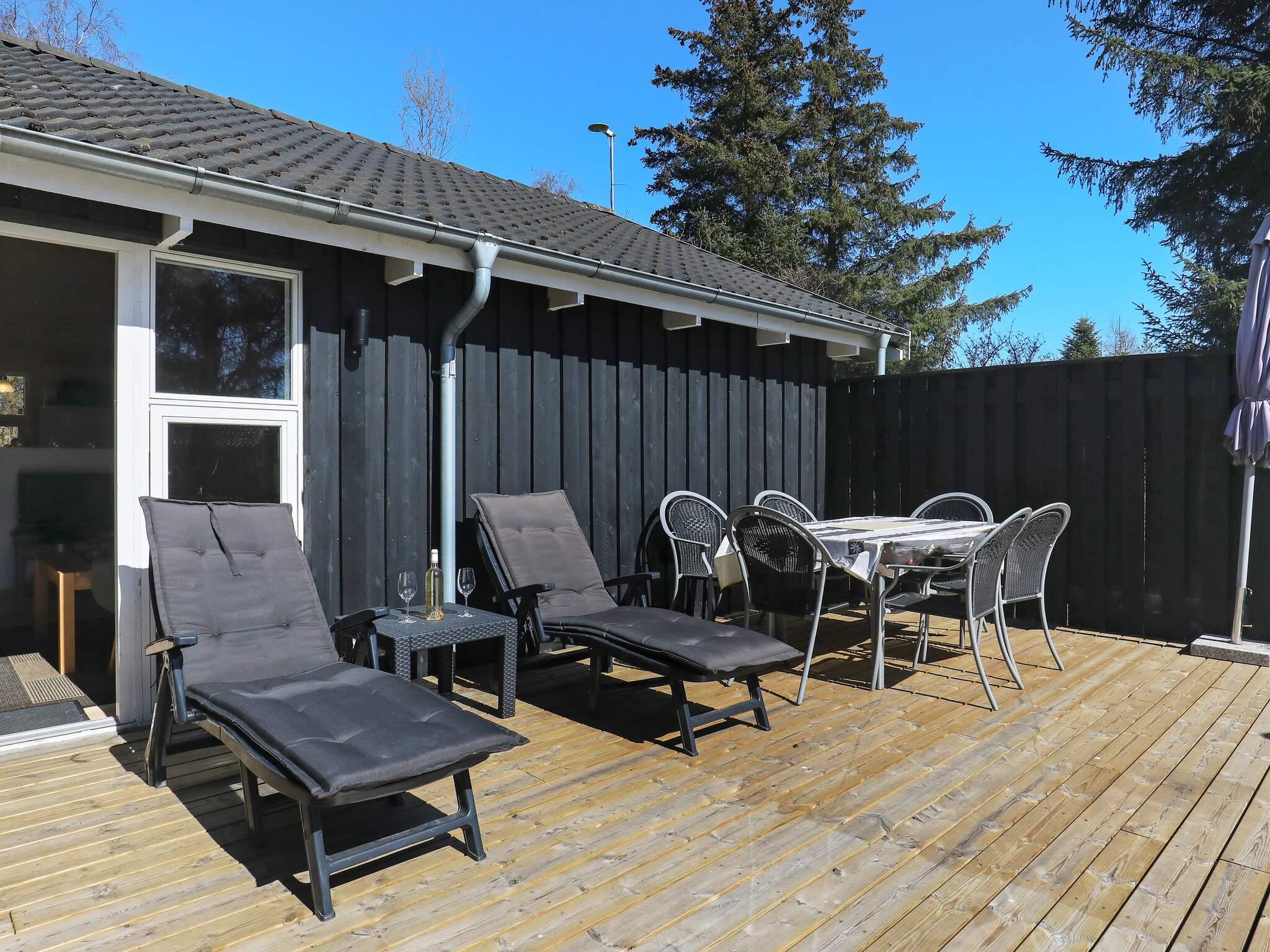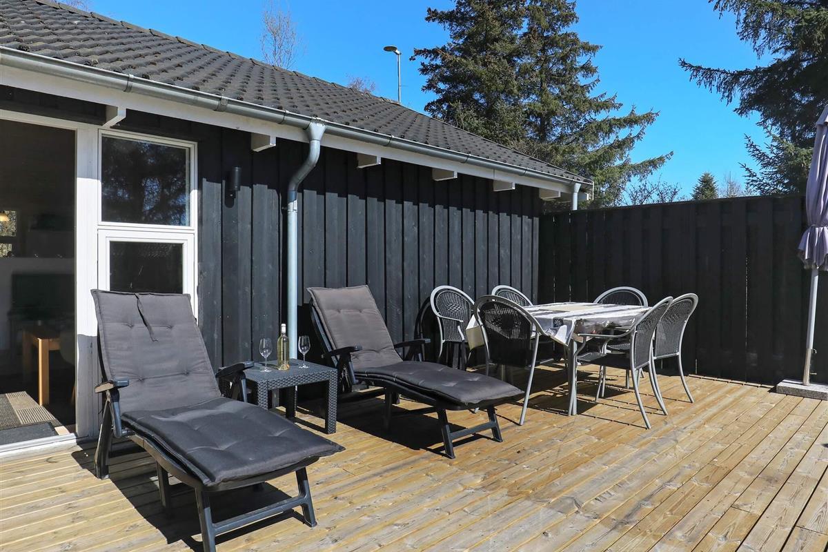 Vom Wohnzimmer aus gelangen Sie hinaus auf eine große, nach Süden ausgerichtete Holzterrasse mit Grill. Hier lassen sich die langen Sommerabende wunderbar genießen. Das Sommerhaus liegt auf einem 1.197 m² großen, naturbelassenen Grundstück mit Baumbestand und bietet eine schöne, private Atmosphäre.
