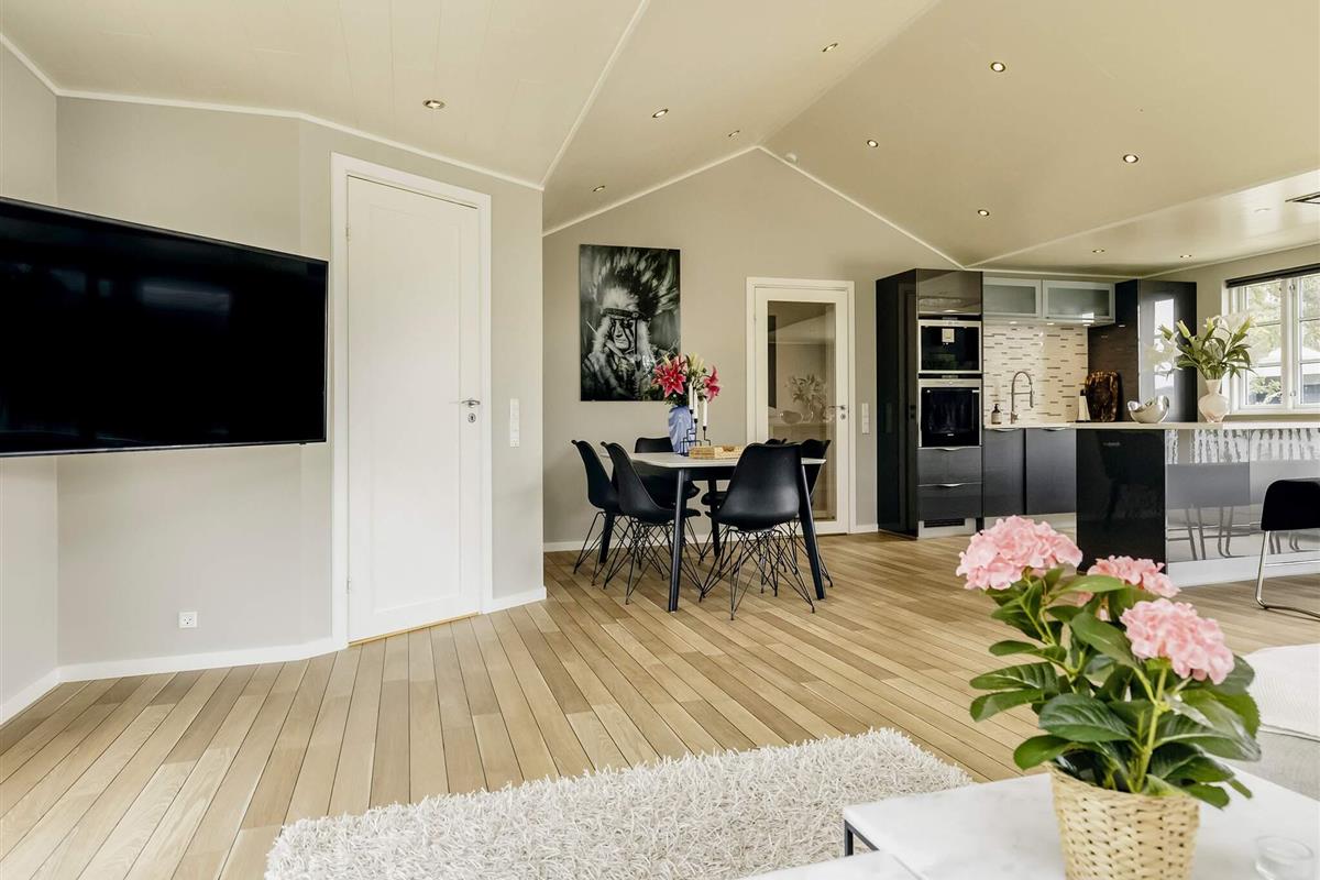 Vom Wohnzimmer gelangt man hinaus auf eine überdachte Terrassenfläche mit Blick auf das Wasser.