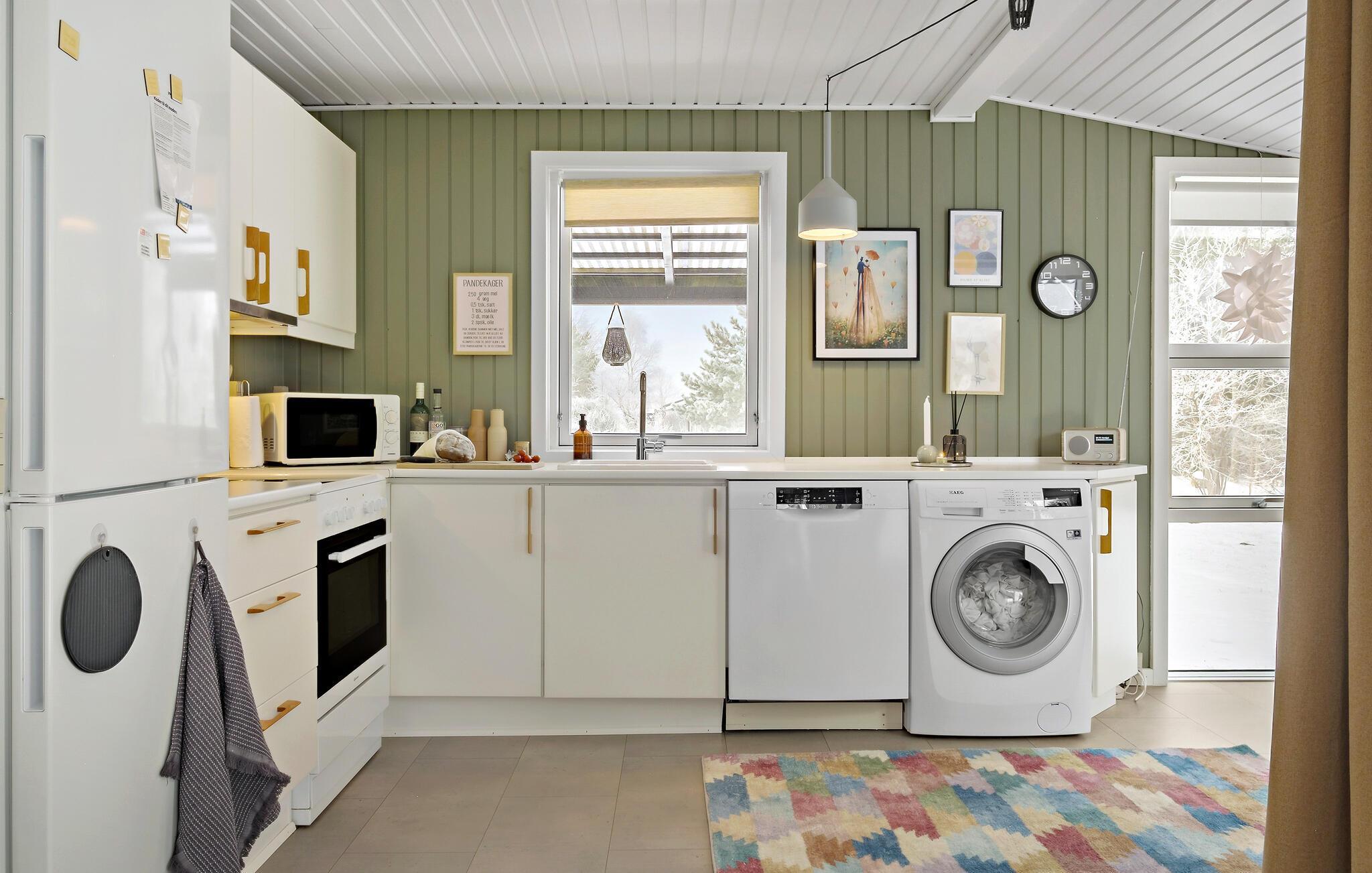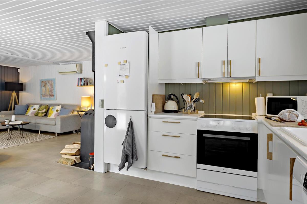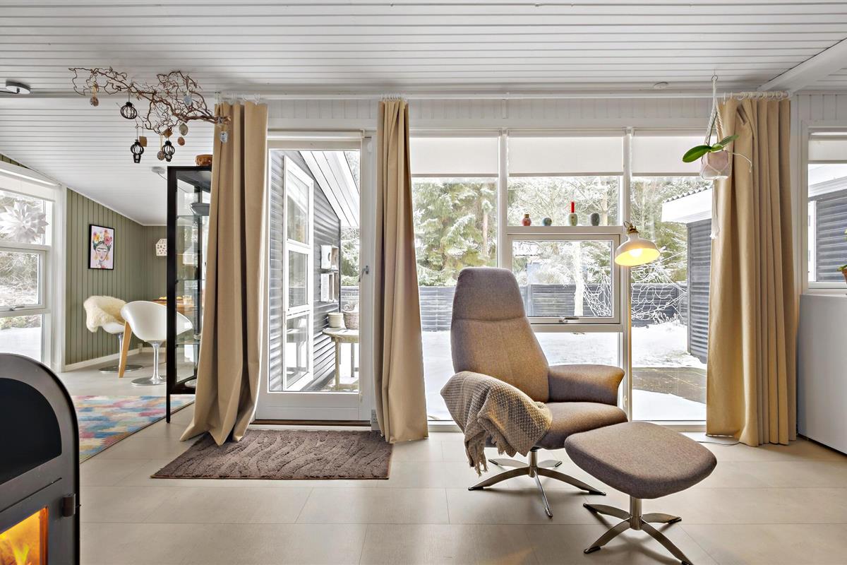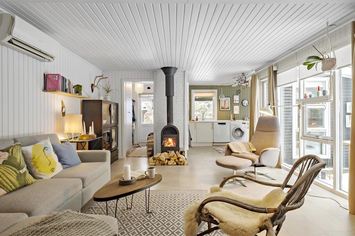 Dit uitnodigende vakantiehuis verwelkomt je aan het einde van een doodlopende weg in een gezinsvriendelijke buurt met veel activiteiten voor kinderen. Zodra je binnenkomt, vallen de liefdevol ingerichte en gemeubileerde kamers je op en voel je je meteen thuis. De vele ramen van vloer tot plafond en de houtkachel maken van de woonkamer, in combinatie met de keuken en eethoek, de ideale ontmoetingsplek voor het gezin. Hier kun je samen koken, spelen aan de eettafel of ontspannen op de bank.