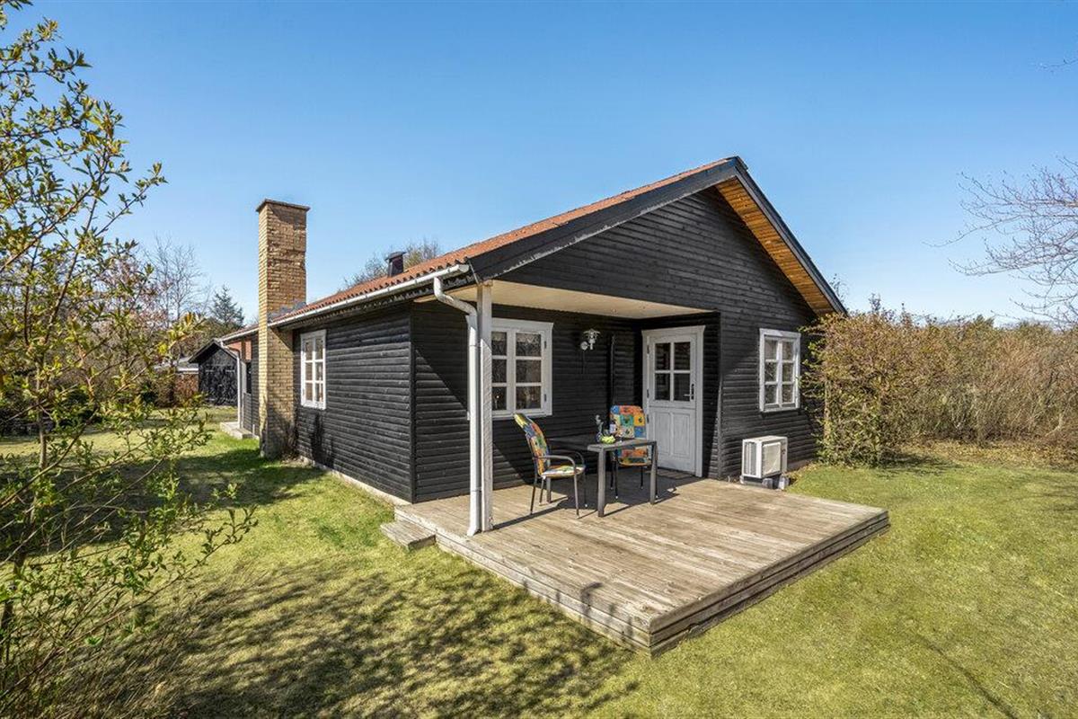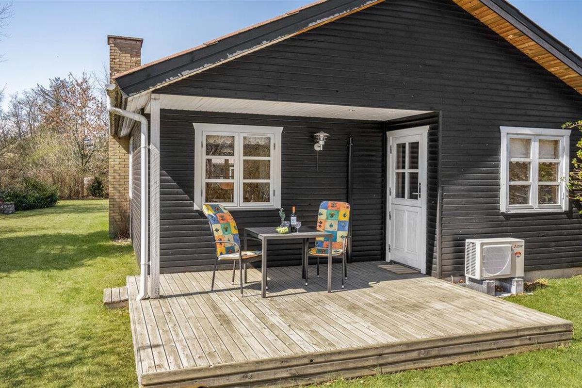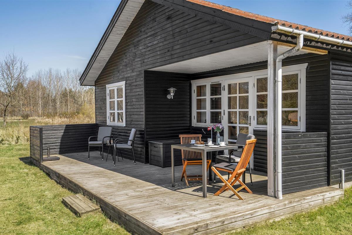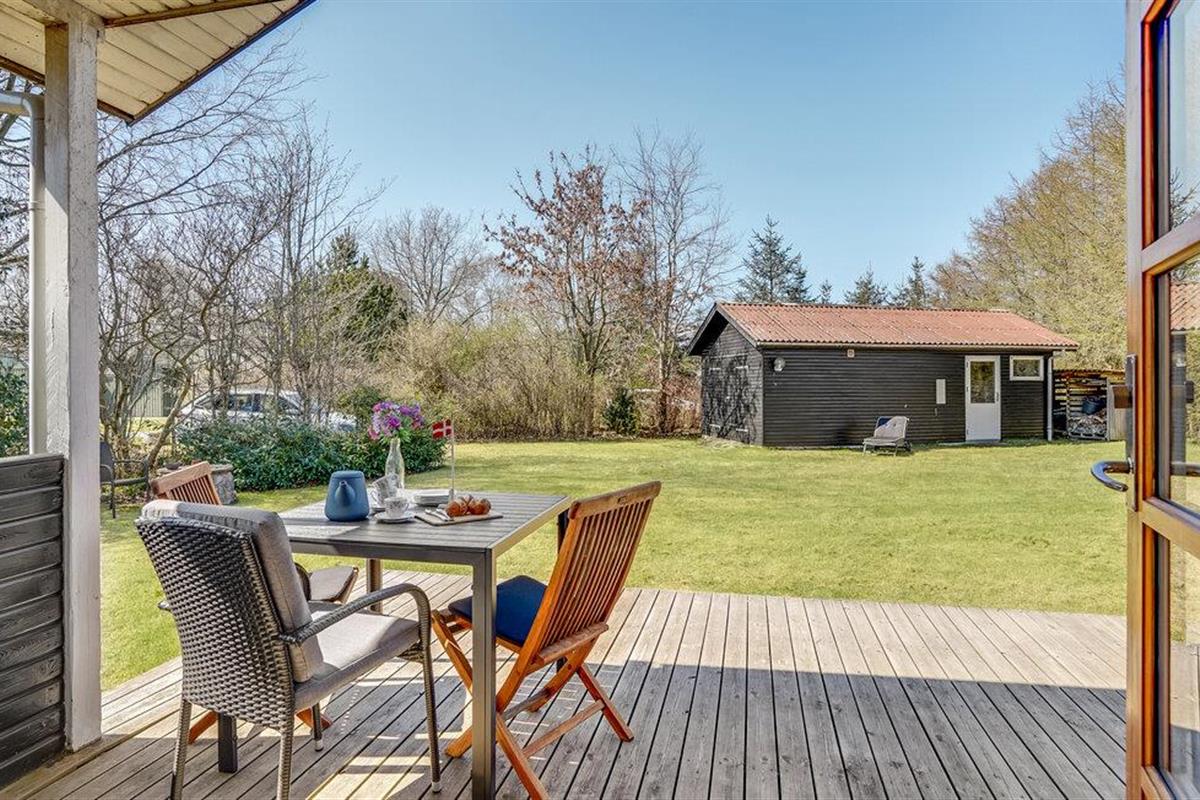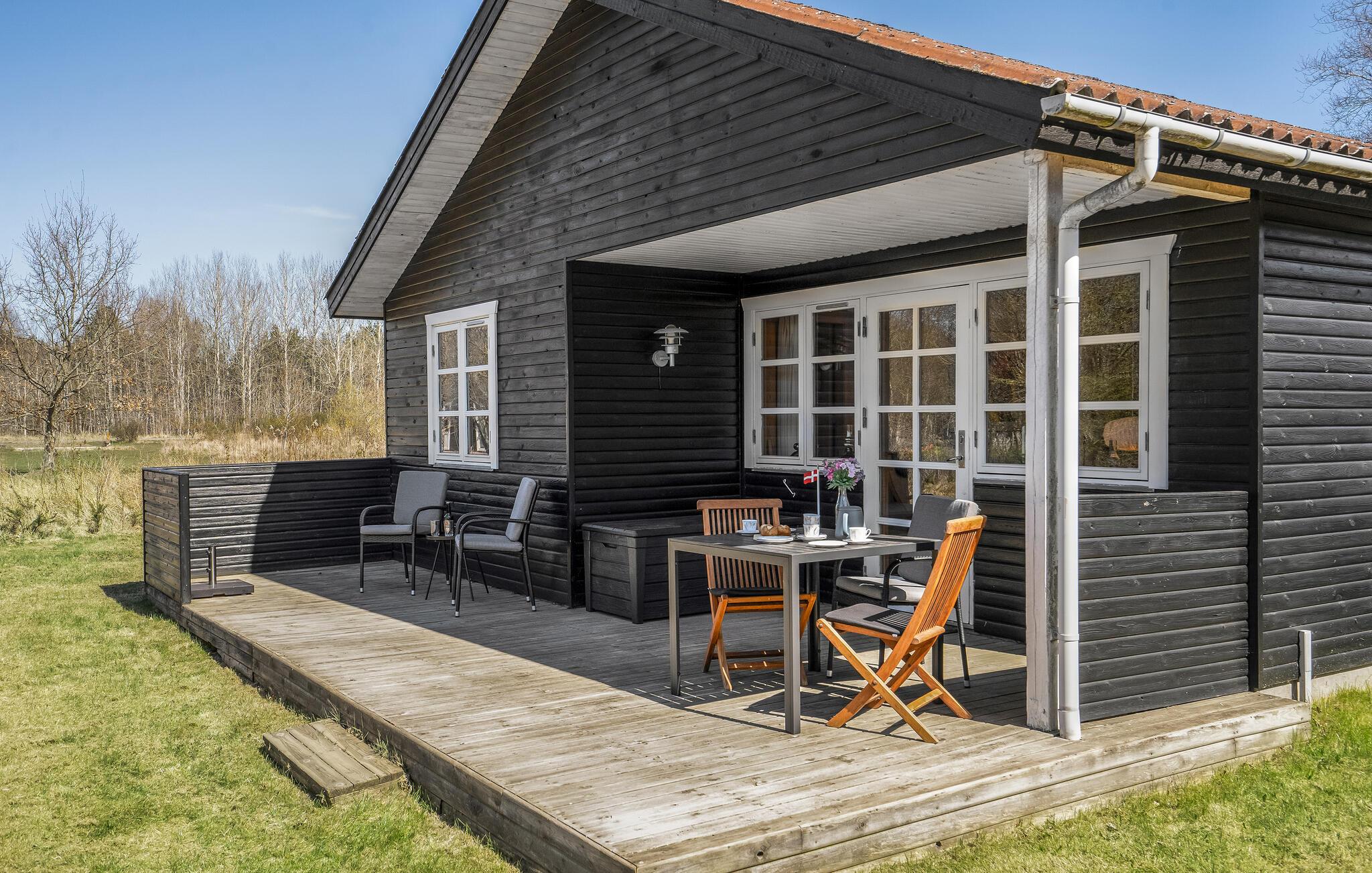 Gezellig vakantiehuis op natuurgrondstuk nabij Hals Strand, ideaal voor een rustige familievakantie met open keuken en terras.