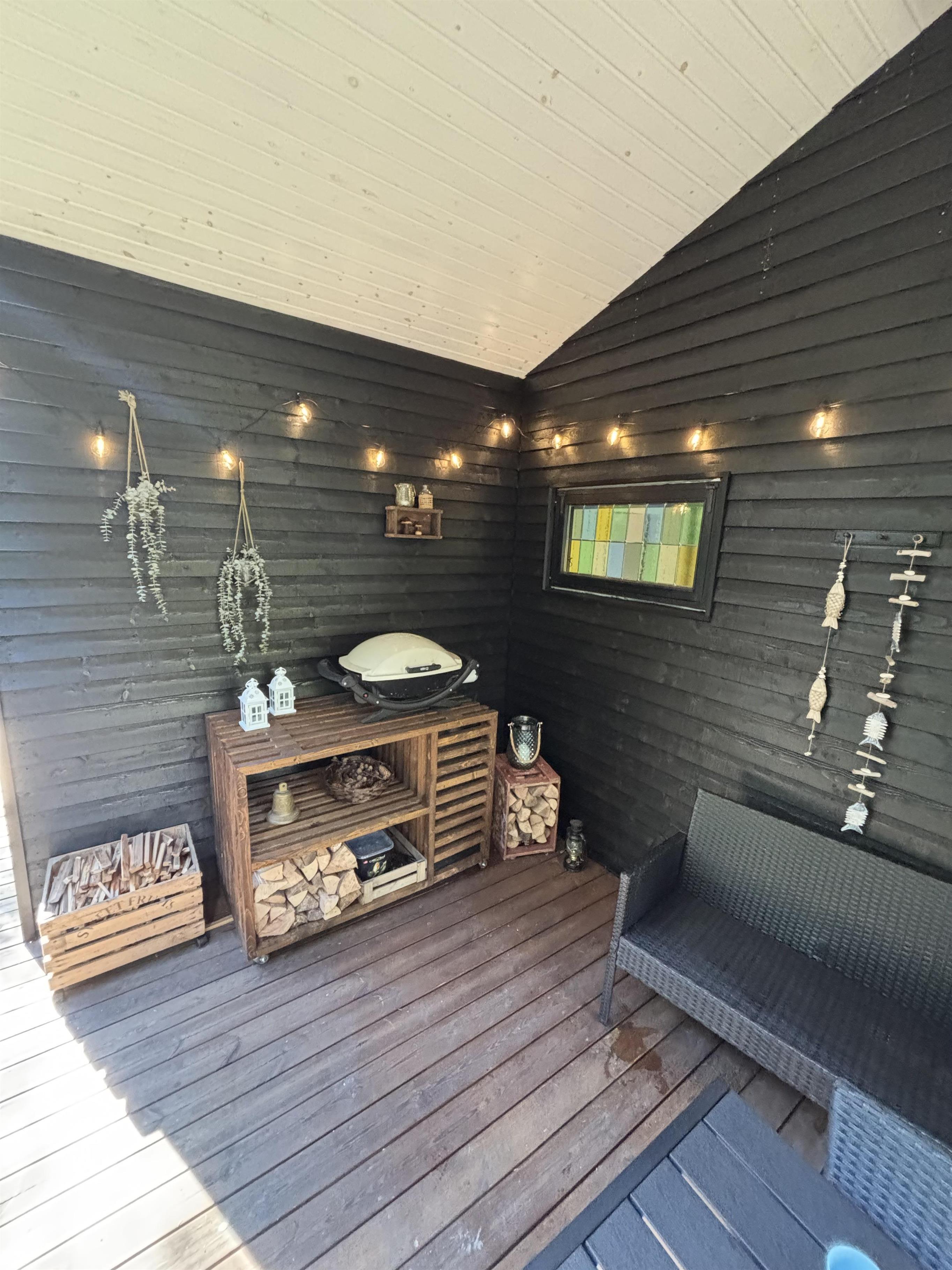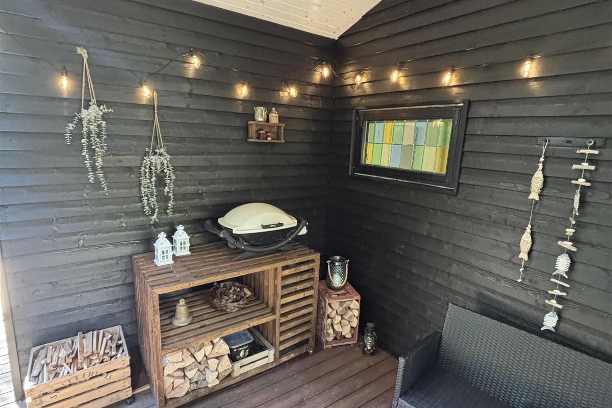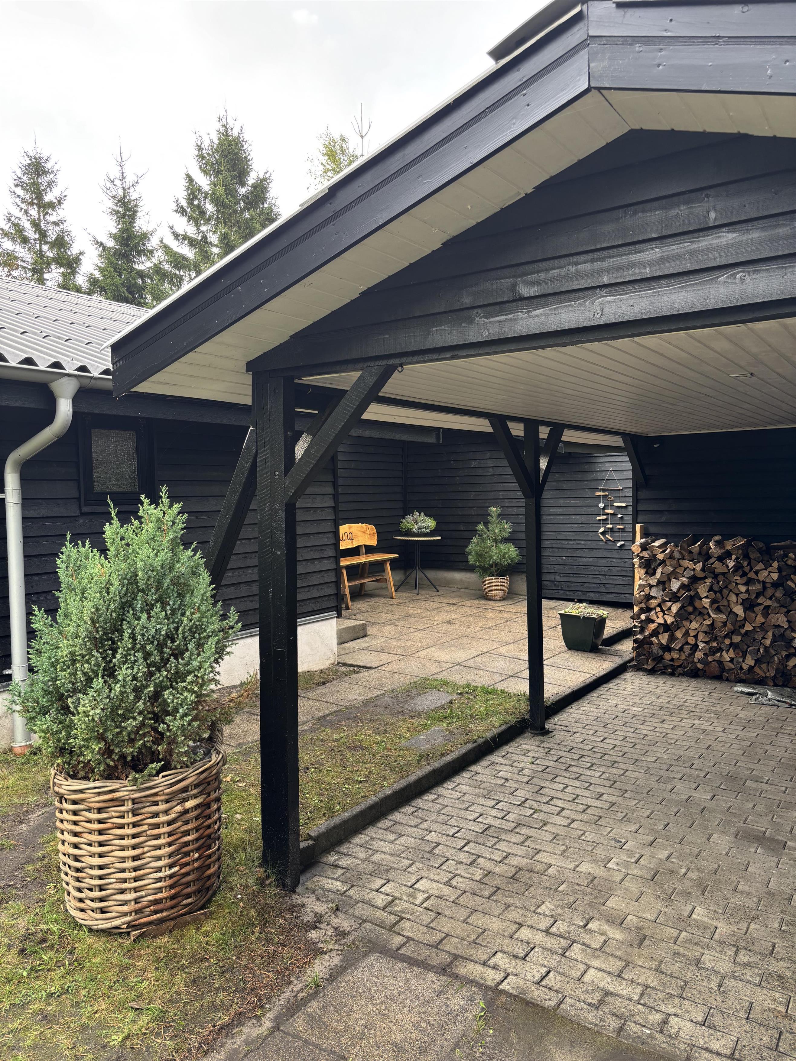 The holiday home has 40 m² of terrace space, plus a 10 m² covered terrace with gas and charcoal grills. There is also a storage shed, a carport, and parking at the property.