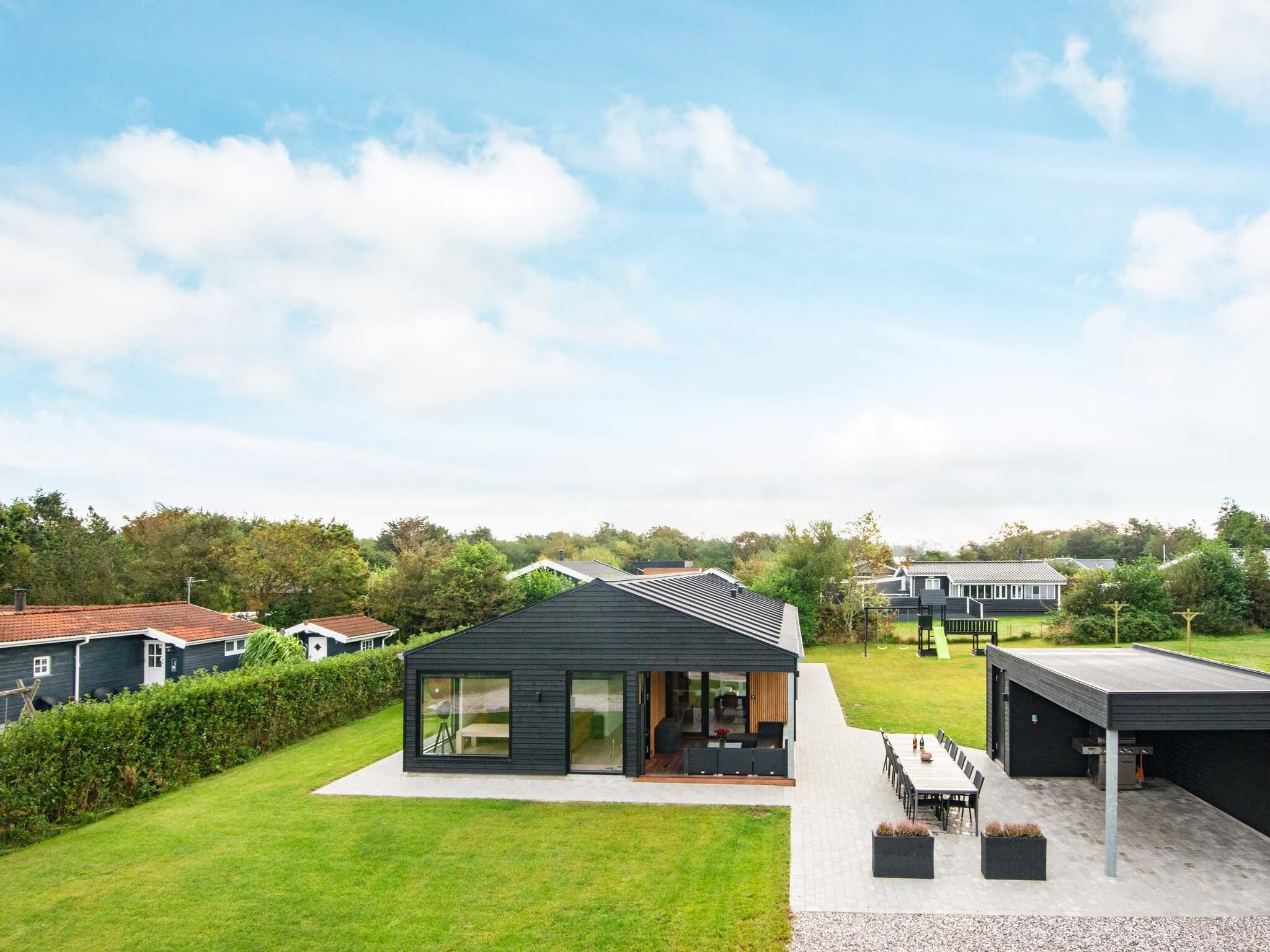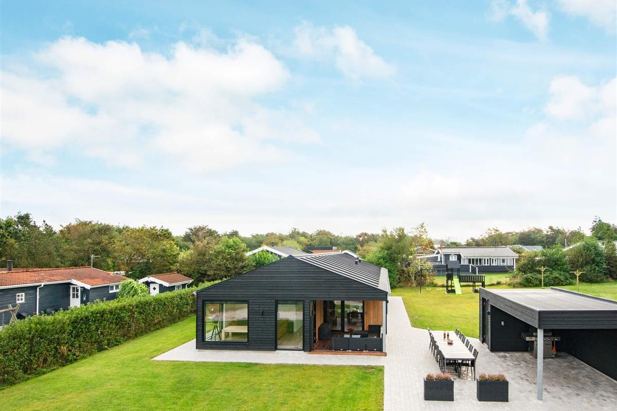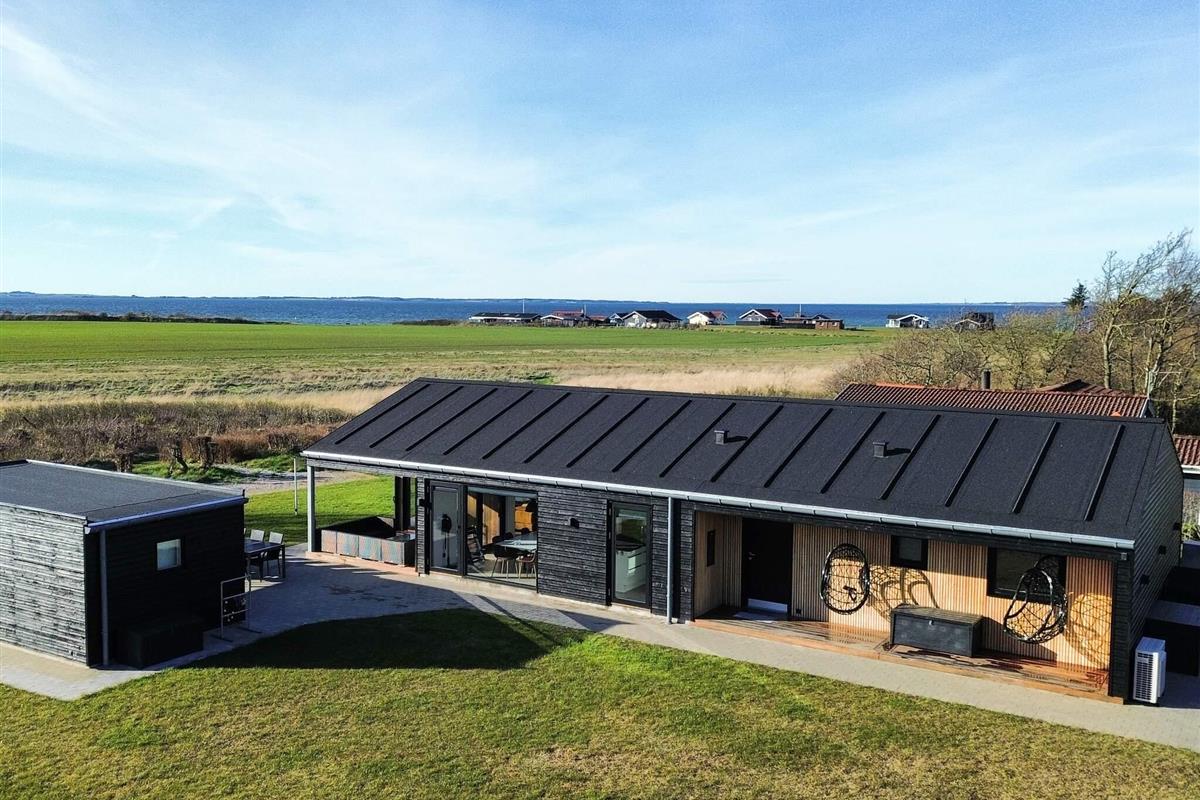 Hoch über dem Limfjord gelegen und mit atemberaubendem Blick auf die Küste ist dieses von einem Architekten entworfene Ferienhaus aus dem Jahr 2021 ein Rückzugsort, wo moderner Komfort auf puren Genuss trifft. Schon beim Betreten wirkt der Raum hell und luftig, mit bis zum Dachfirst offenen Decken, eleganten Möbeln und raumhohen Fenstern, die den sich ständig verändernden Fjord wie ein lebendiges Gemälde einrahmen. Der Morgen beginnt in der offenen Küche und im Essbereich, wo der Kaffee kocht, während das Sonnenlicht über den Tisch fällt, und setzt sich im Wohnzimmer fort, von wo aus Sie auf die überdachte Terrasse mit Windschutz und Terrassenheizer gelangen.