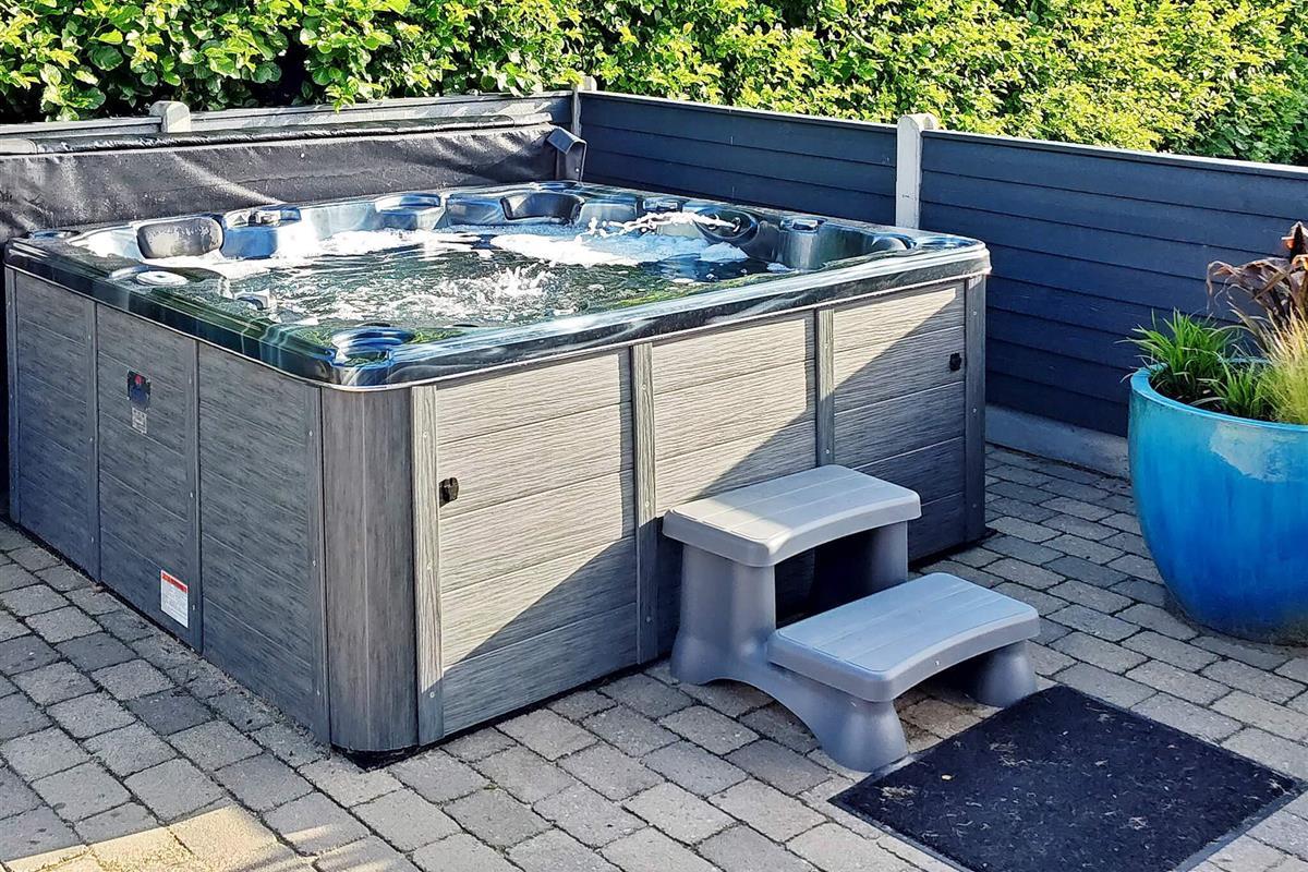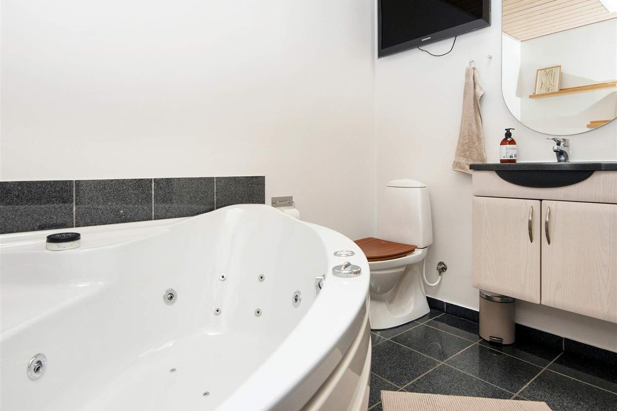 Helles, hochwertiges Badezimmer mit 2-Sitzer-Spa, Badebereich, Toilette und Dusche. Gästebad mit Dusche und Toilette.
