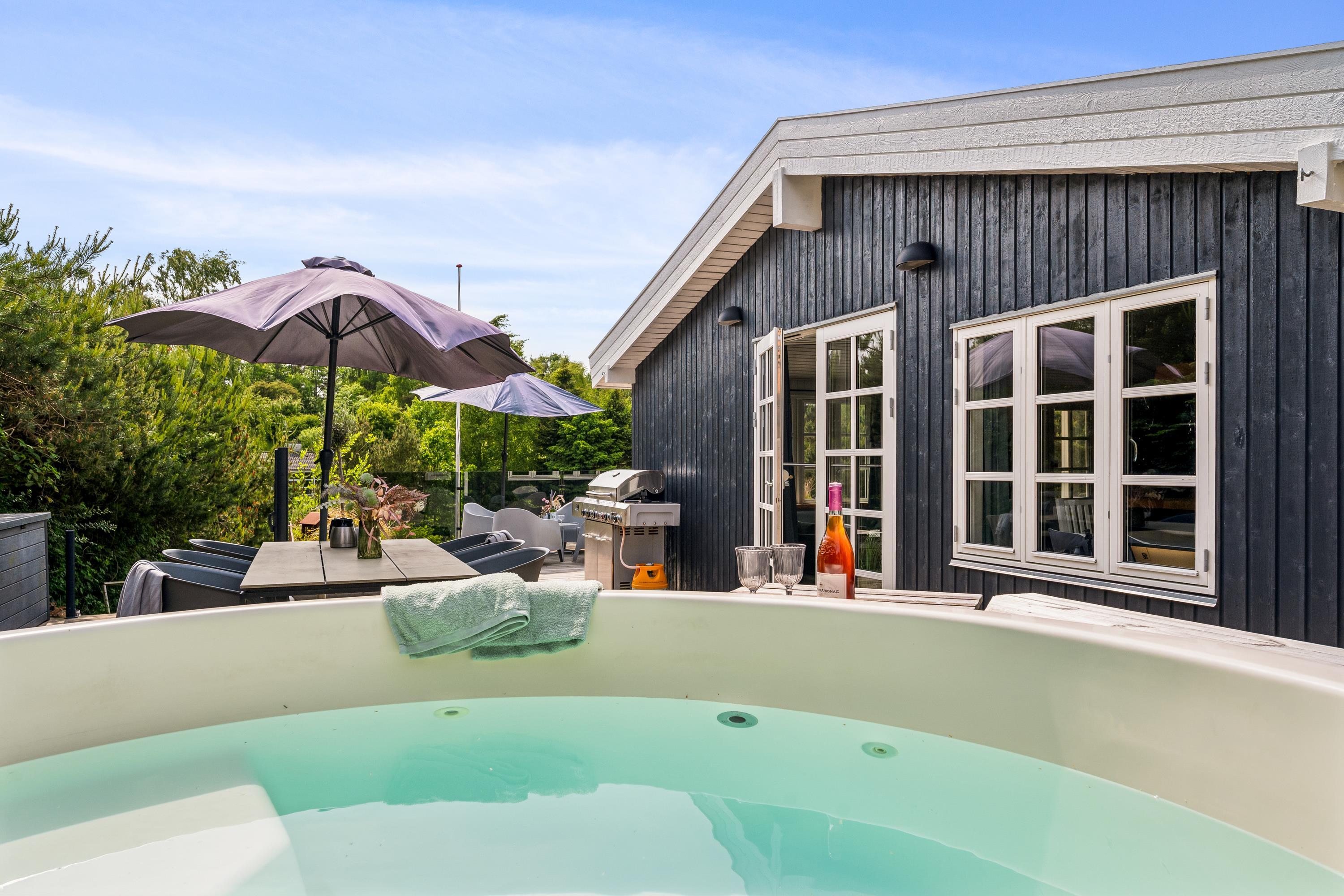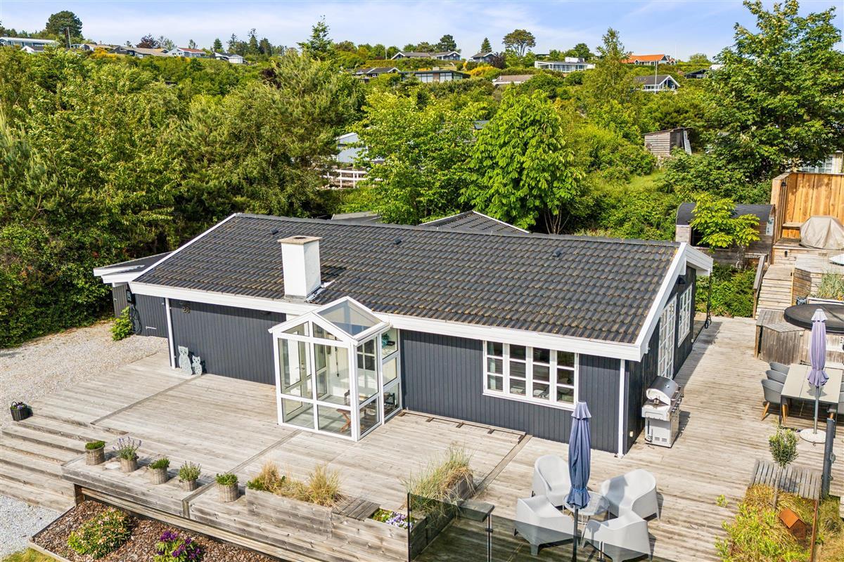 This newly renovated and well-appointed holiday home is located in Handrup Bakker, north of Ebeltoft, within walking distance to a child-friendly sandy beach with a bathing pier extending into Ebeltoft Bay. The house is surrounded by a large, southwest-facing wooden terrace, partially covered, with many lovely cozy corners featuring garden furniture, loungers, an outdoor hot tub, outdoor shower, parasol, and a grill. Additionally, there is an east-facing terrace where you can enjoy your morning coffee while the children swing or jump on the trampoline. If traveling with multiple families, the neighboring house (15826) is also available for rent.
