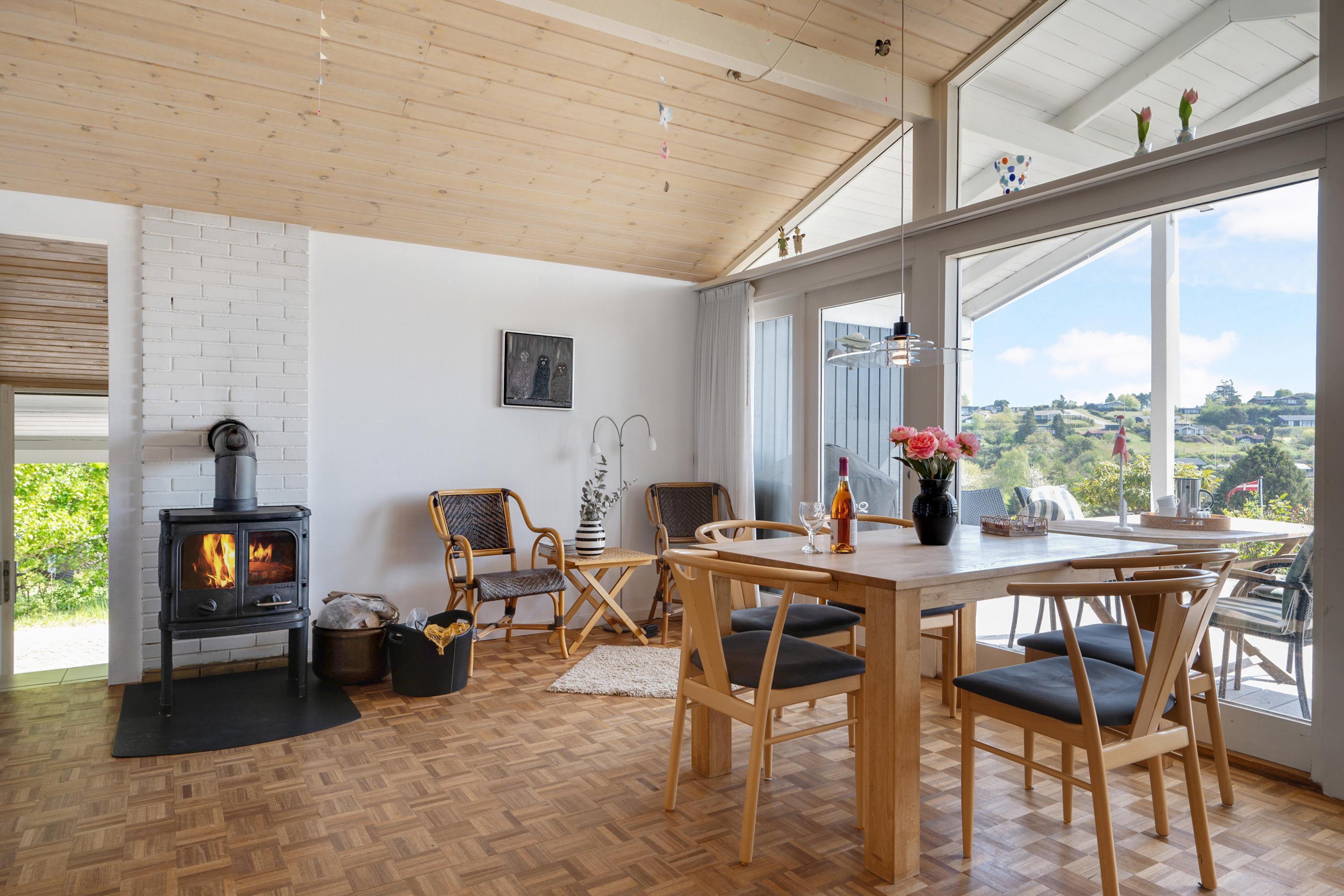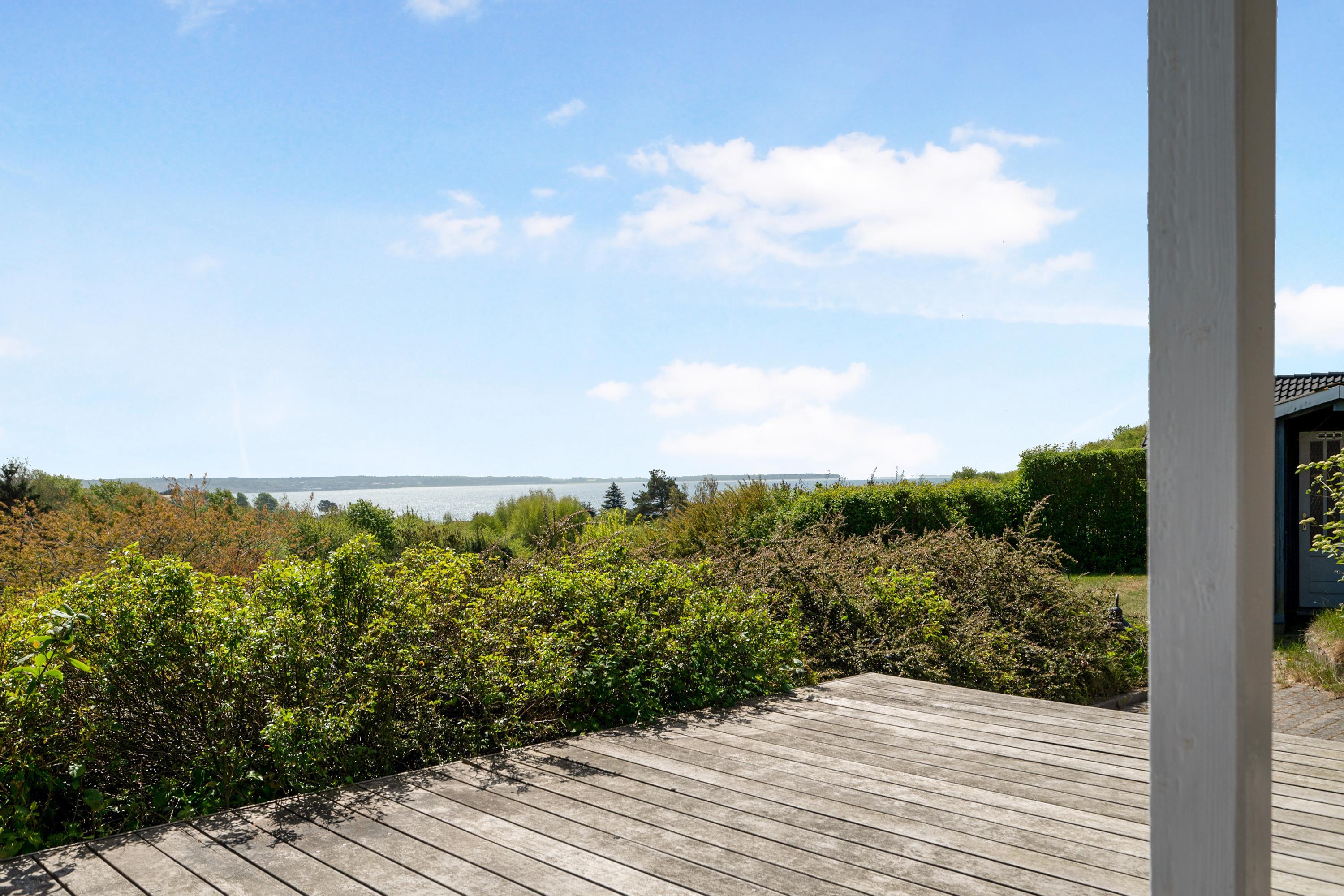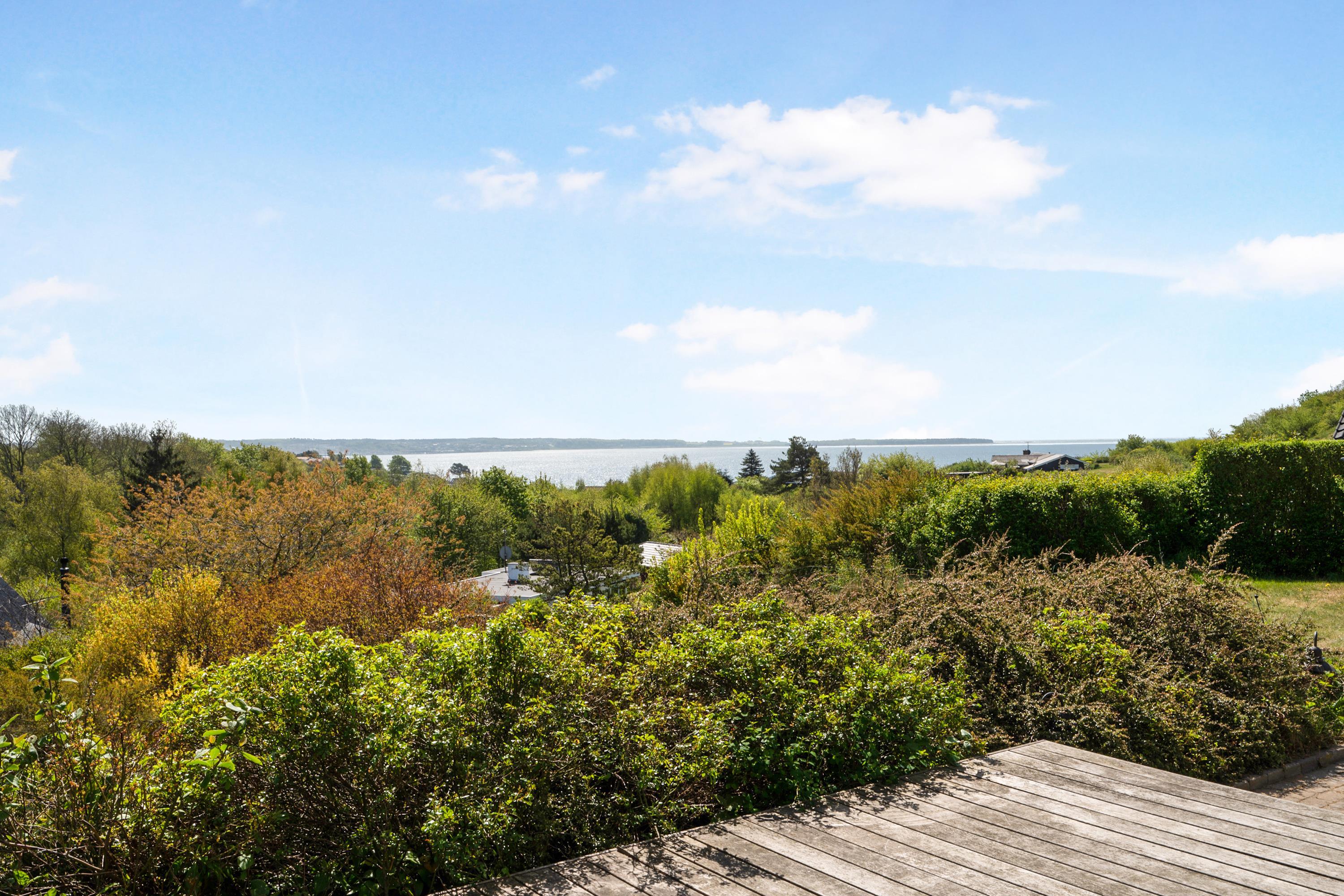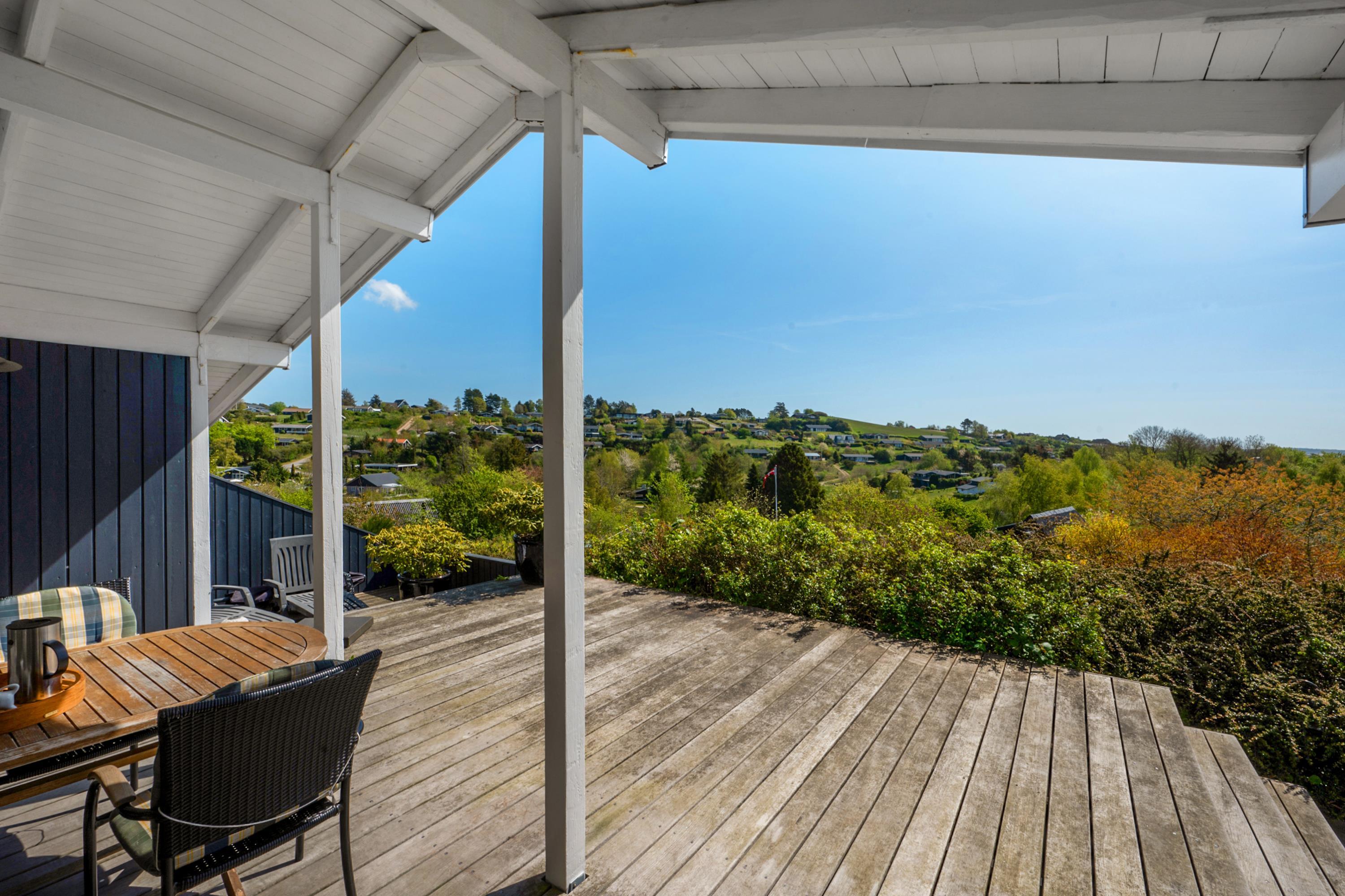 Located on a high, natural plot with the most stunning views over Ebeltoft Bay and Handrup Hills, this lovely, well-maintained older house exudes a cozy and traditional summer house atmosphere. The house is surrounded by beautiful terraces and sunny corners, including a large, south- and west-facing wooden/tiled terrace, partially covered, with comfortable garden furniture, lounge chairs, an umbrella, and a barbecue. A small holiday oasis for one or two couples or a family with children.