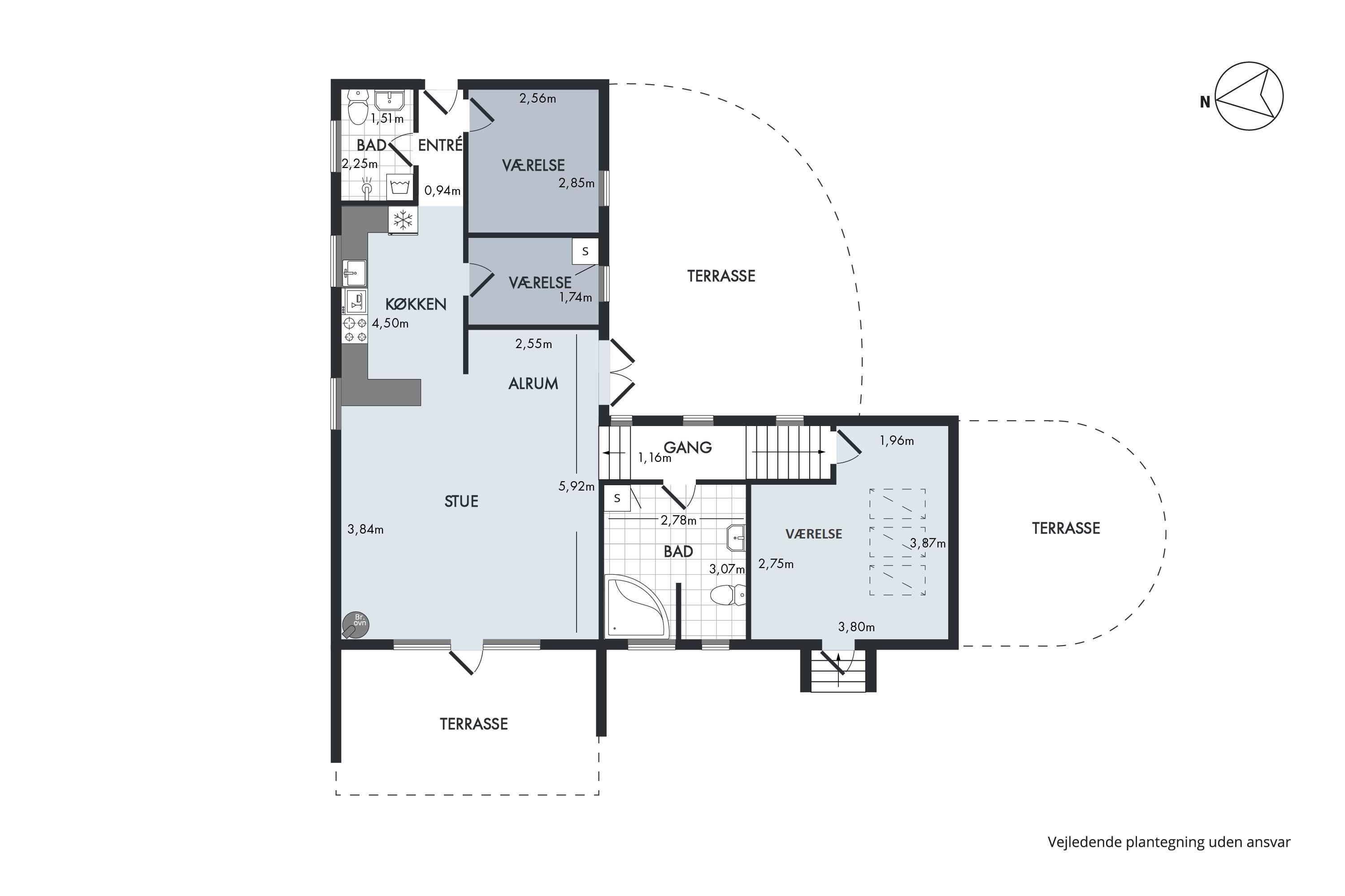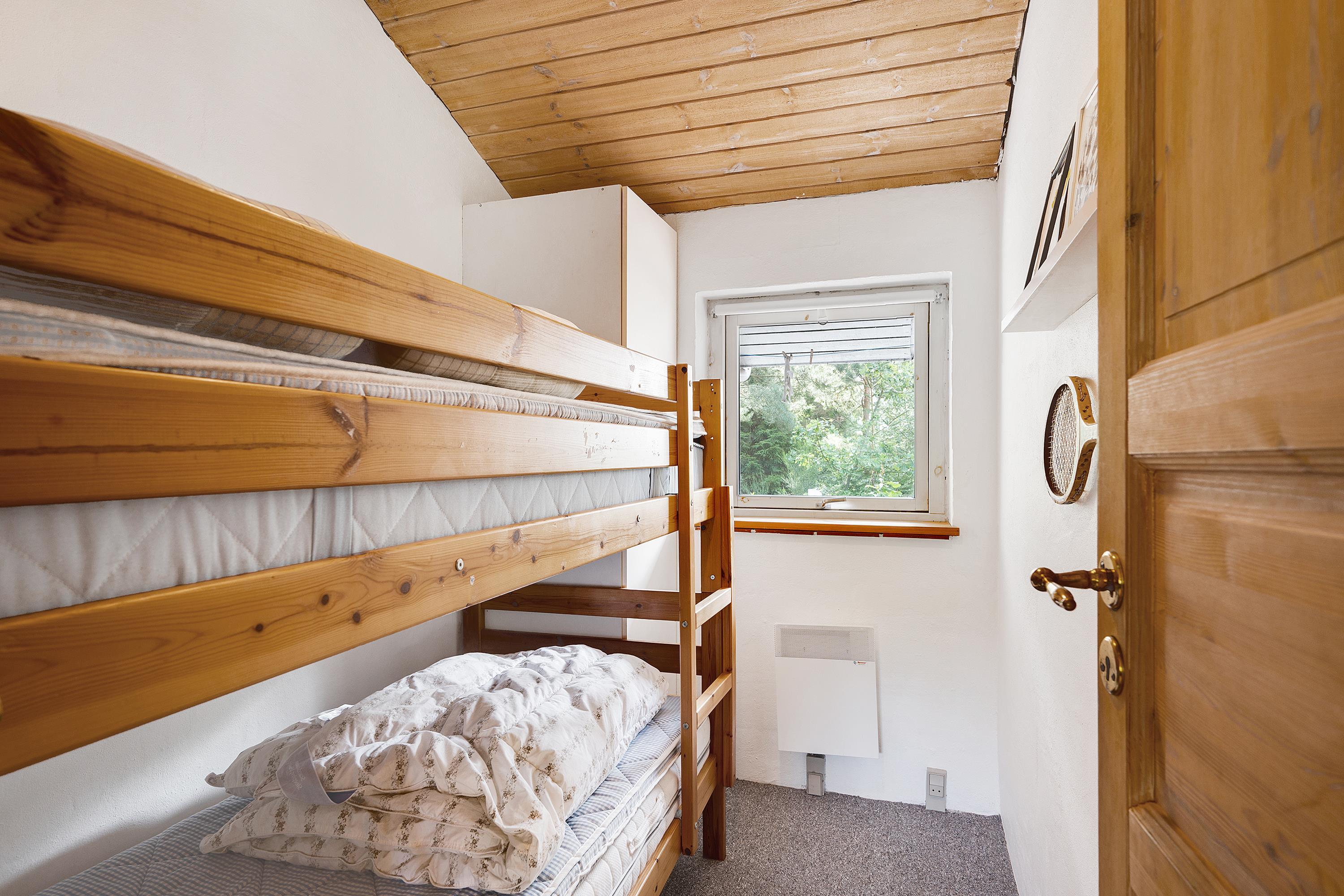 The sleeping arrangements are divided between two bedrooms on the upper level, including one bedroom with a double bed and another with bunk beds. On the lower level, there is a large bedroom with two single beds. The house includes two bathrooms: one with a shower niche on the upper level, and another with a spa bath on the lower level. There is also a washing machine available. For the youngest guests, a high chair and a baby cot are provided. If you are travelling with multiple families, we also rent out the house directly across the street, property number 18902.