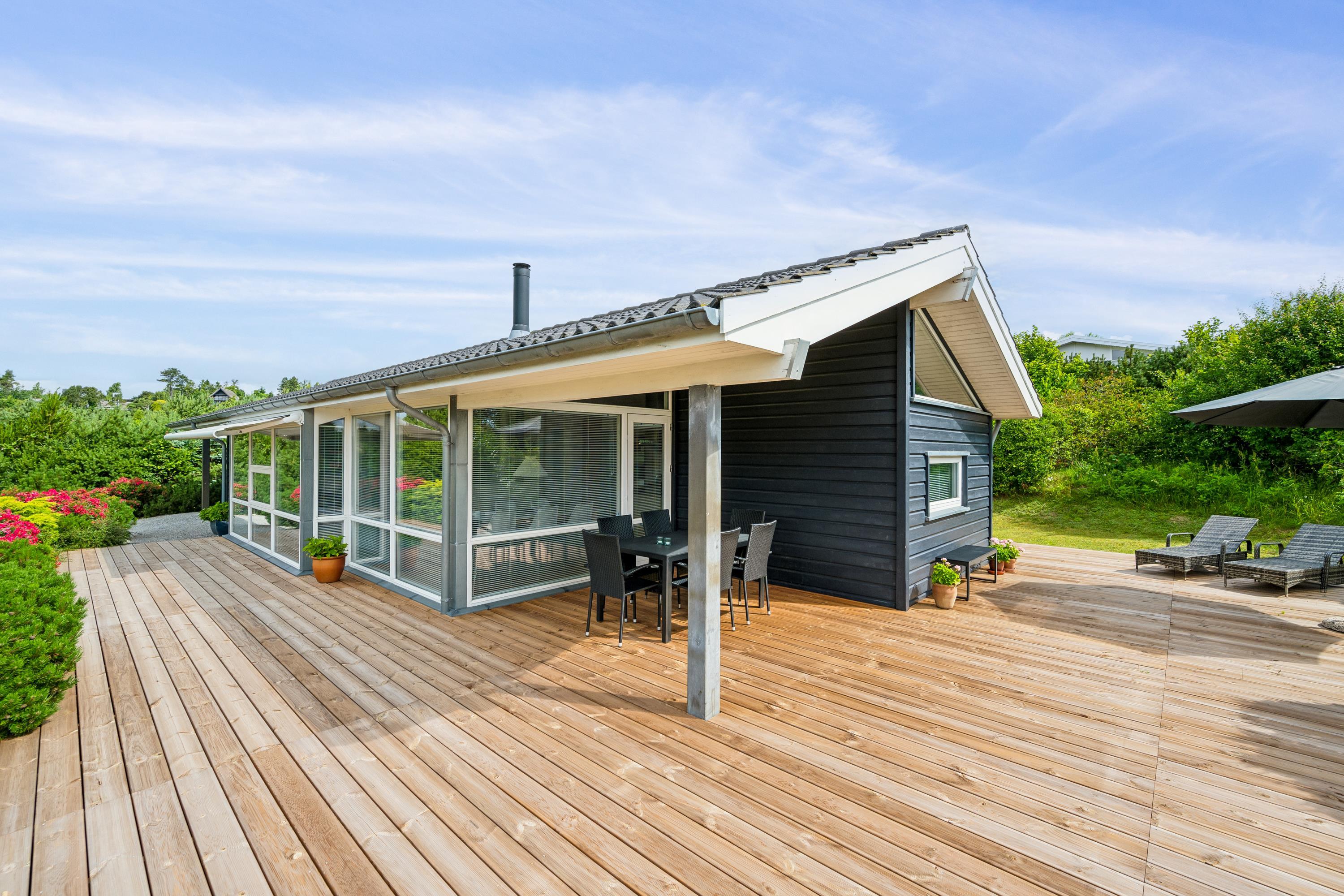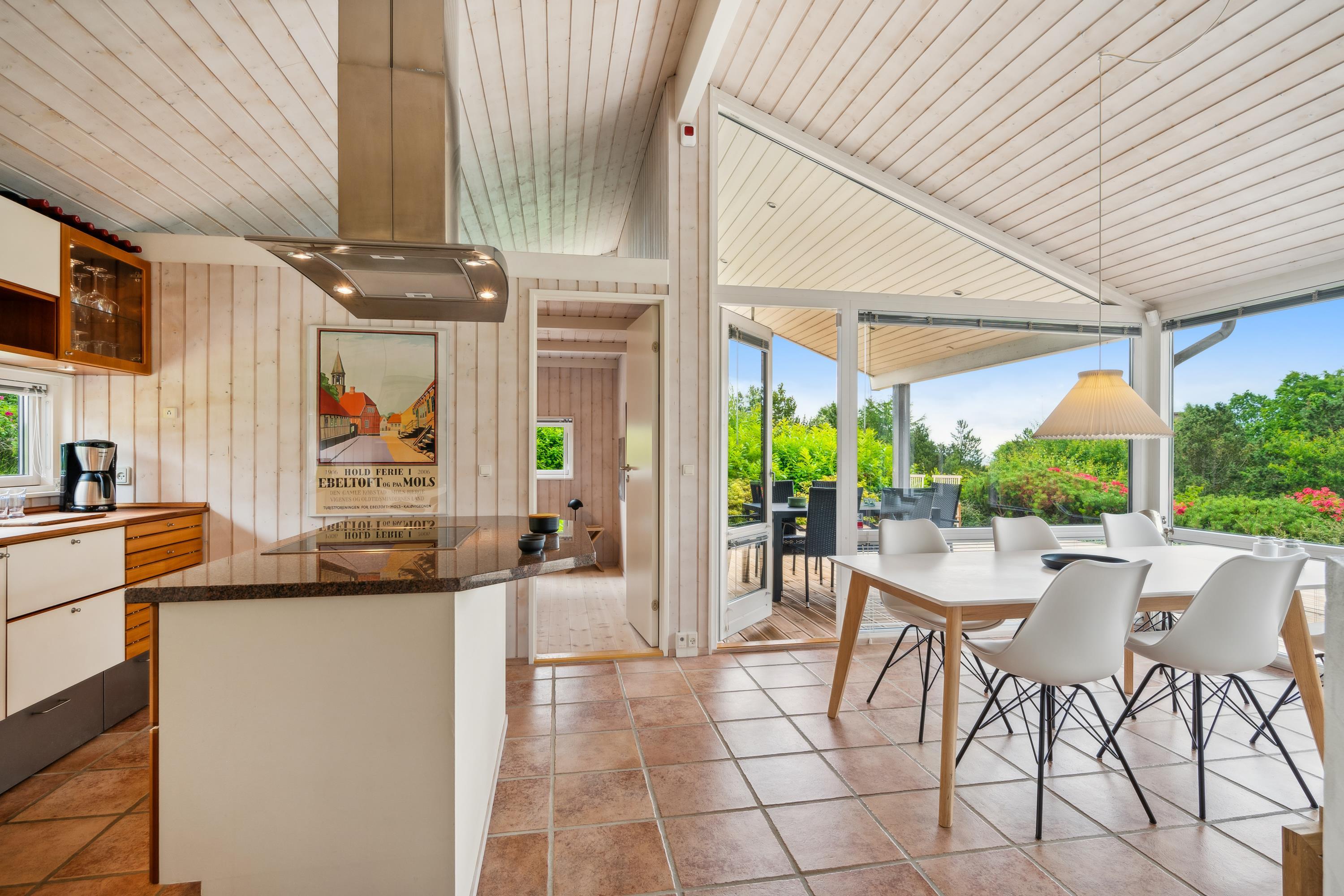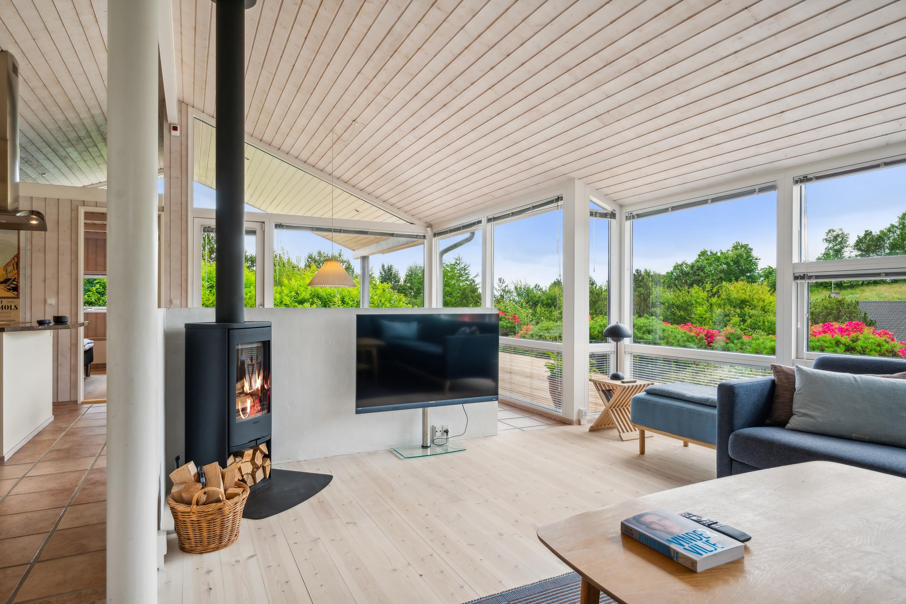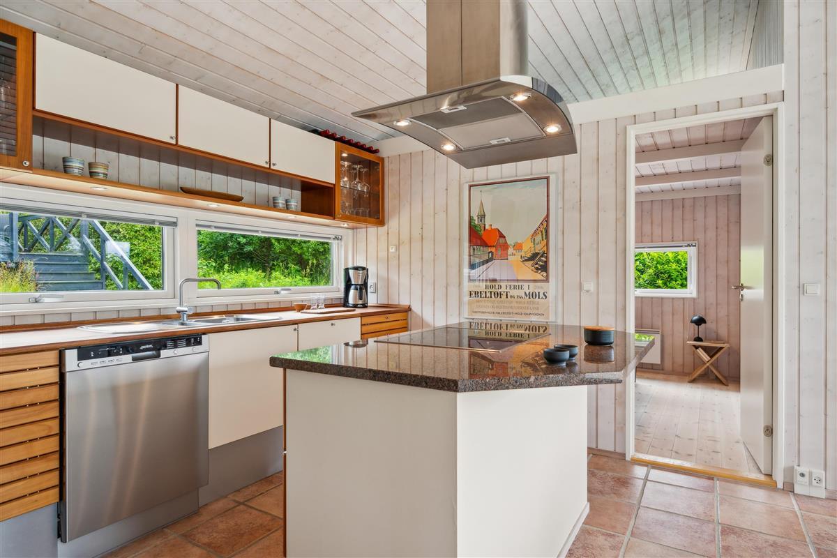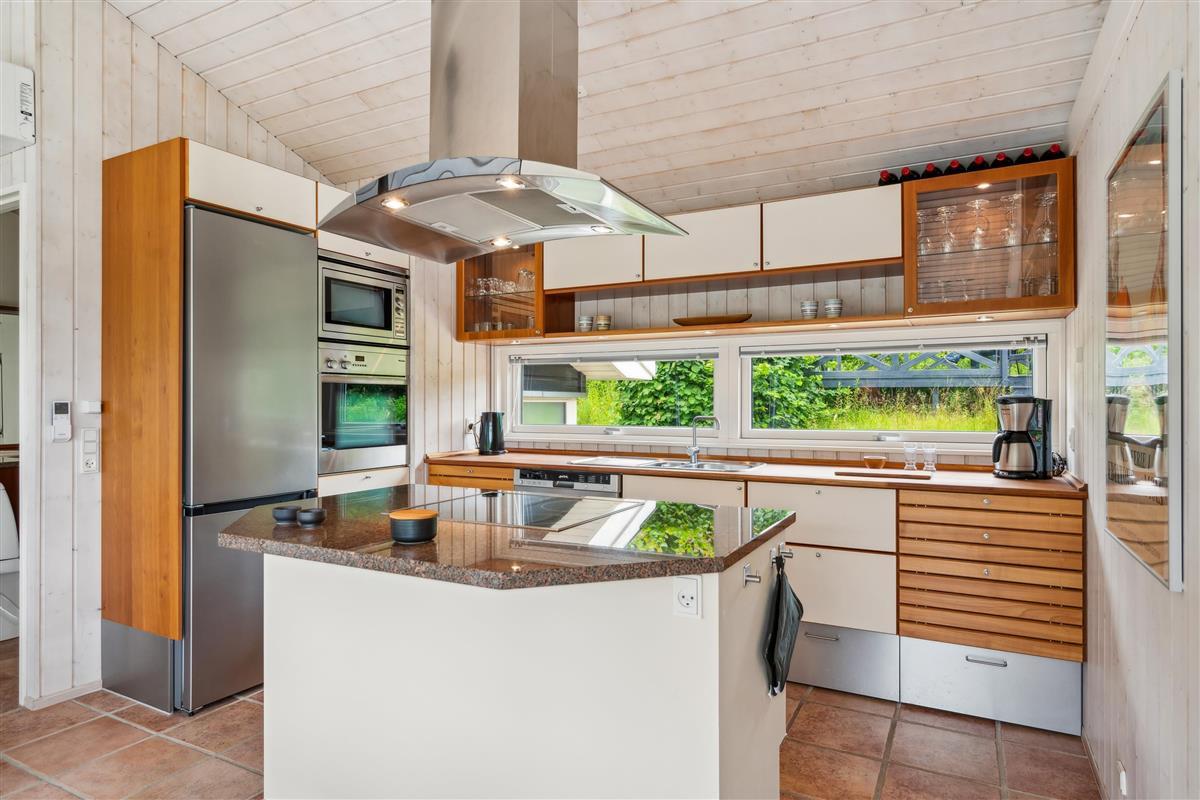 Situated on an elevated plot with a breathtaking view of the surrounding area, this well-maintained and stylish holiday home offers the perfect setting for a relaxing vacation. The bright and cozy living room is tastefully furnished with comfortable seating, a heat pump, and a wood-burning stove. Adjacent to the living room is a charming dining area with direct access to a covered terrace. The modern and well-equipped kitchen, which includes a dishwasher and a kitchen island, is conveniently connected to the dining area.