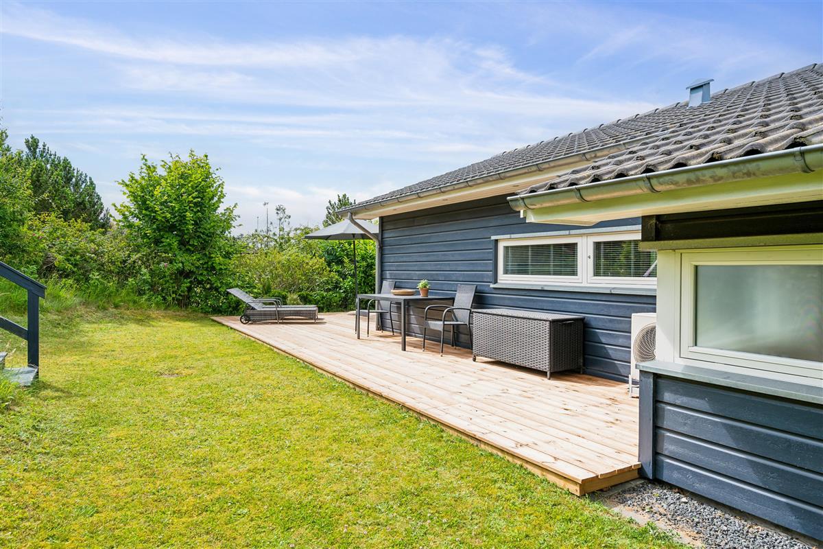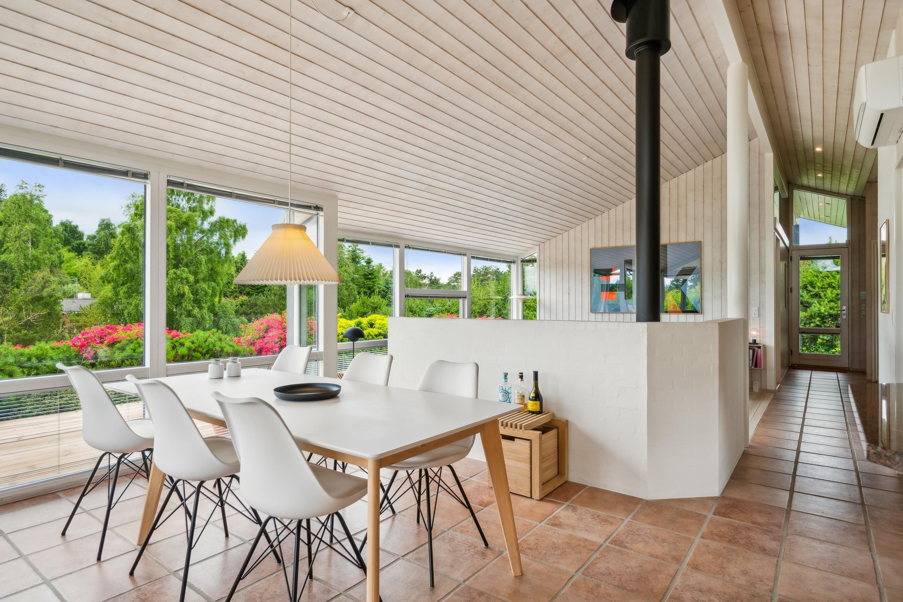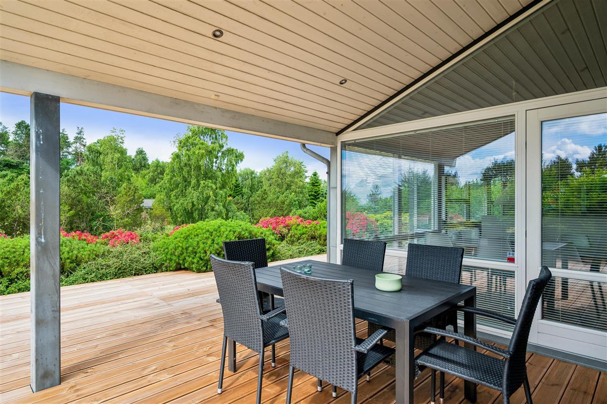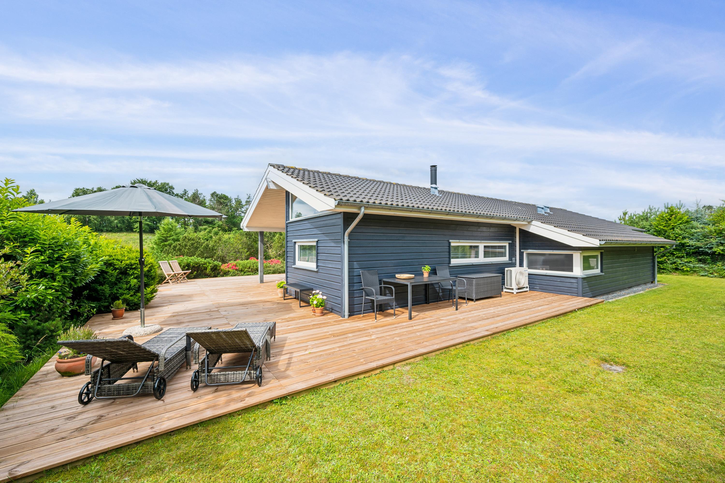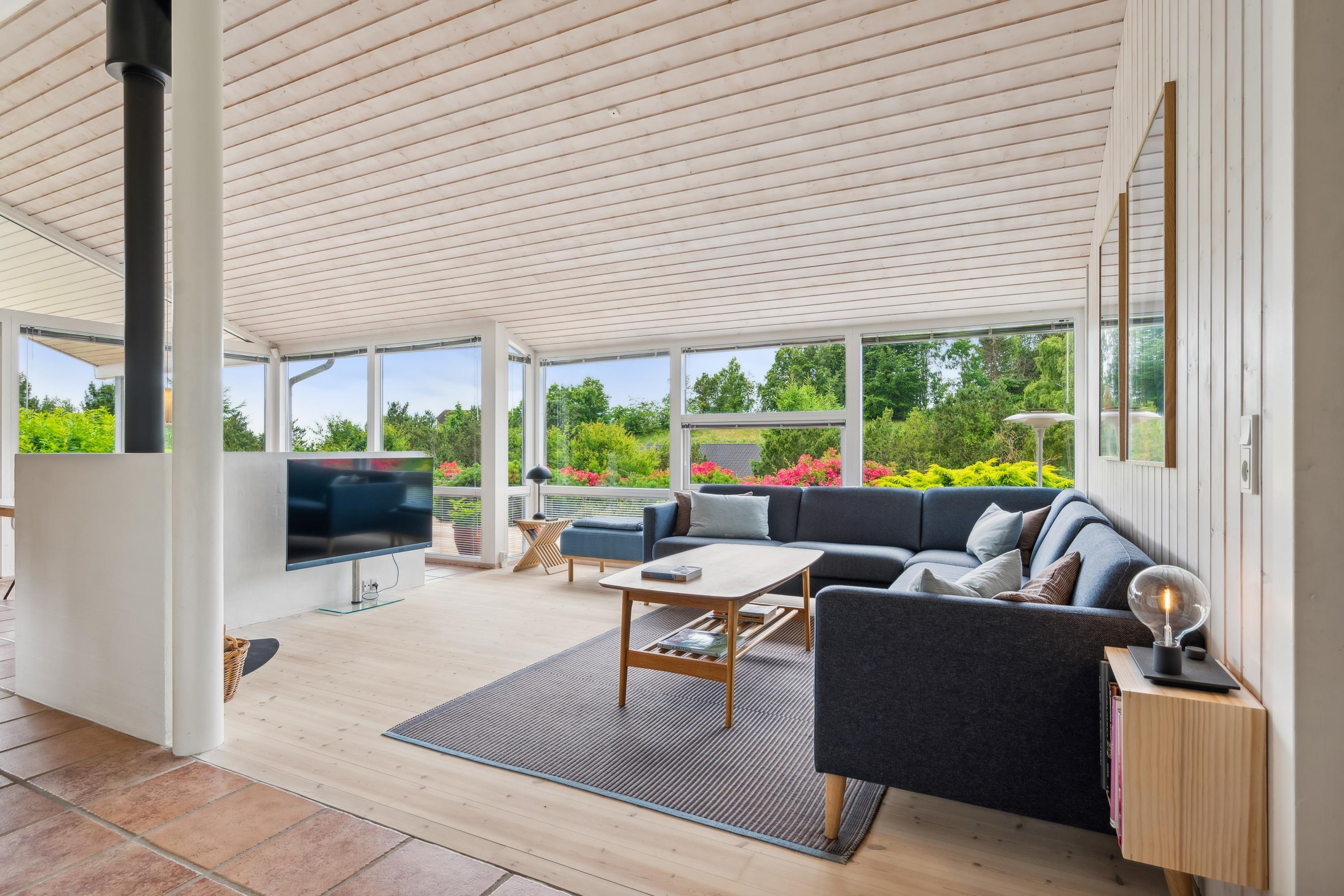 Situated on an elevated plot with a breathtaking view of the surrounding area, this well-maintained and stylish holiday home offers the perfect setting for a relaxing vacation. The bright and cozy living room is tastefully furnished with comfortable seating, a heat pump, and a wood-burning stove. Adjacent to the living room is a charming dining area with direct access to a covered terrace. The modern and well-equipped kitchen, which includes a dishwasher and a kitchen island, is conveniently connected to the dining area.