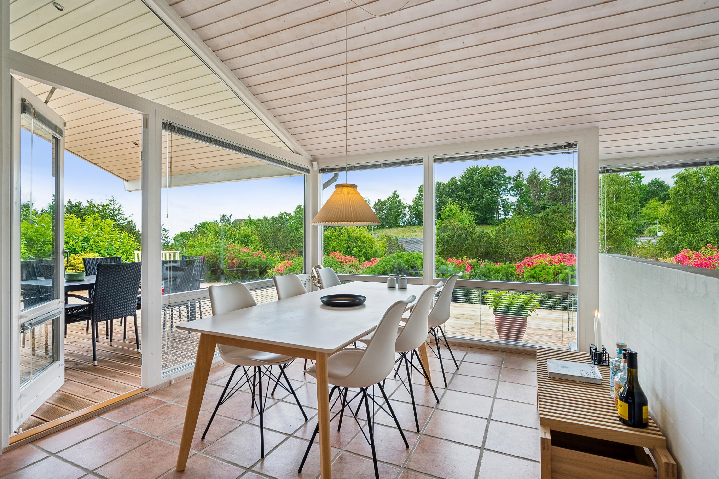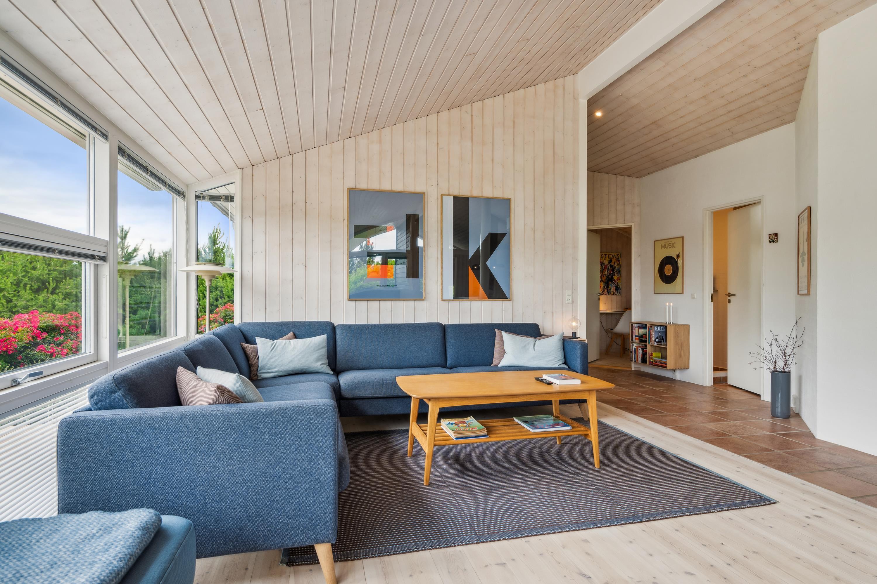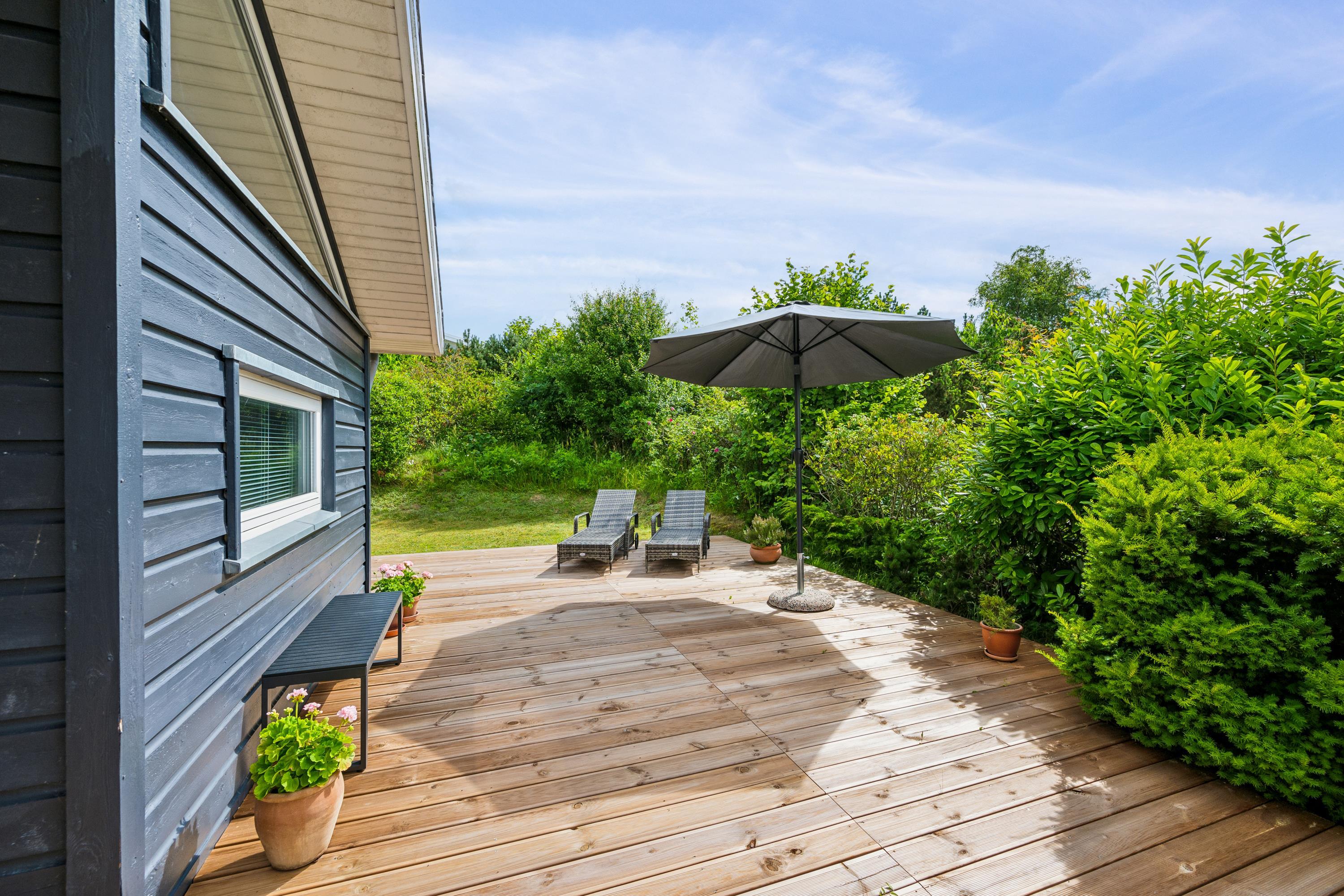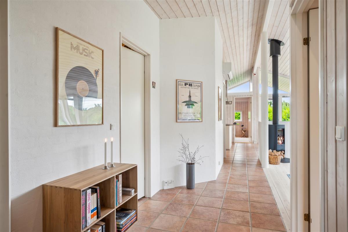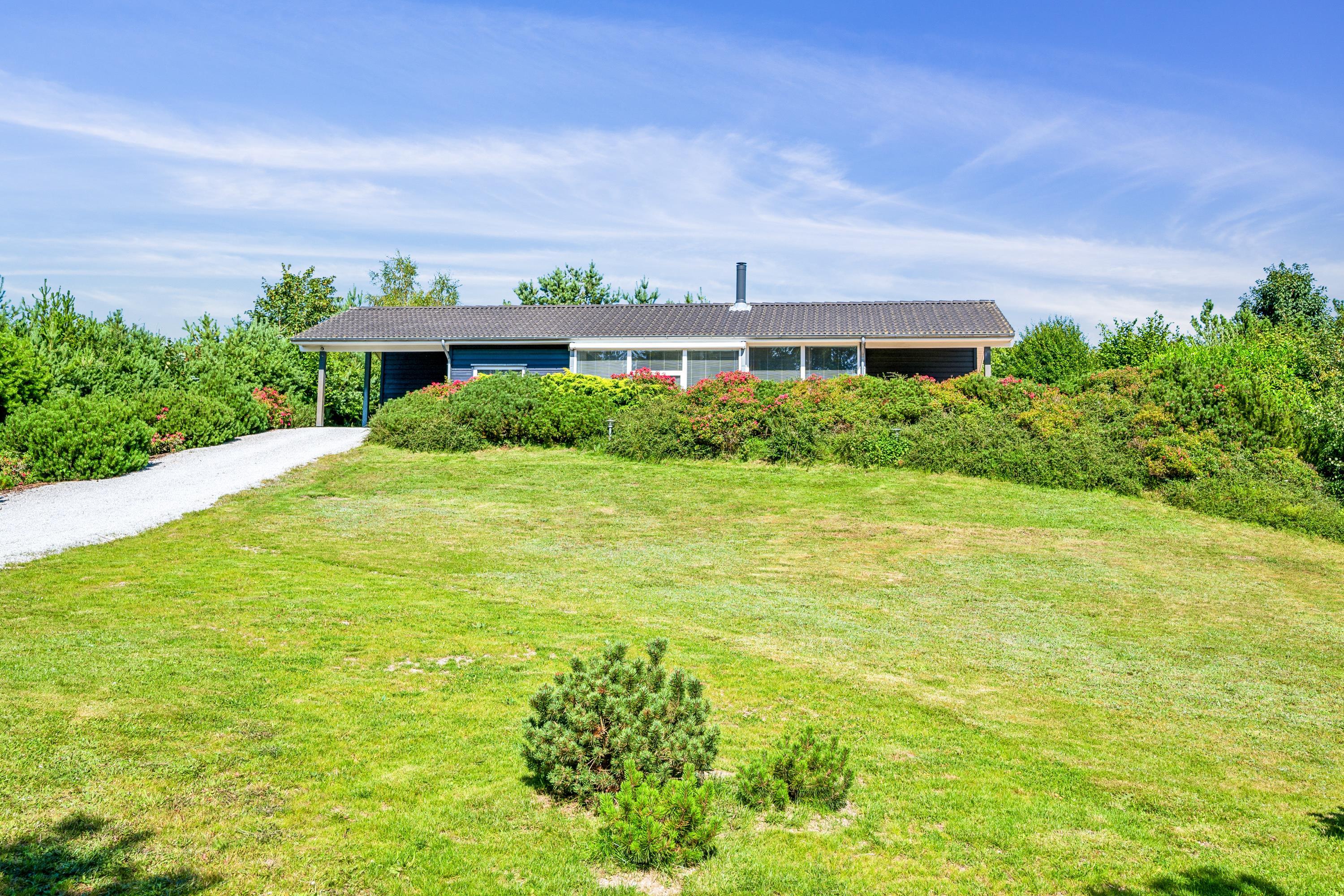 Situated on an elevated plot with a breathtaking view of the surrounding area, this well-maintained and stylish holiday home offers the perfect setting for a relaxing vacation. The bright and cozy living room is tastefully furnished with comfortable seating, a heat pump, and a wood-burning stove. Adjacent to the living room is a charming dining area with direct access to a covered terrace. The modern and well-equipped kitchen, which includes a dishwasher and a kitchen island, is conveniently connected to the dining area.