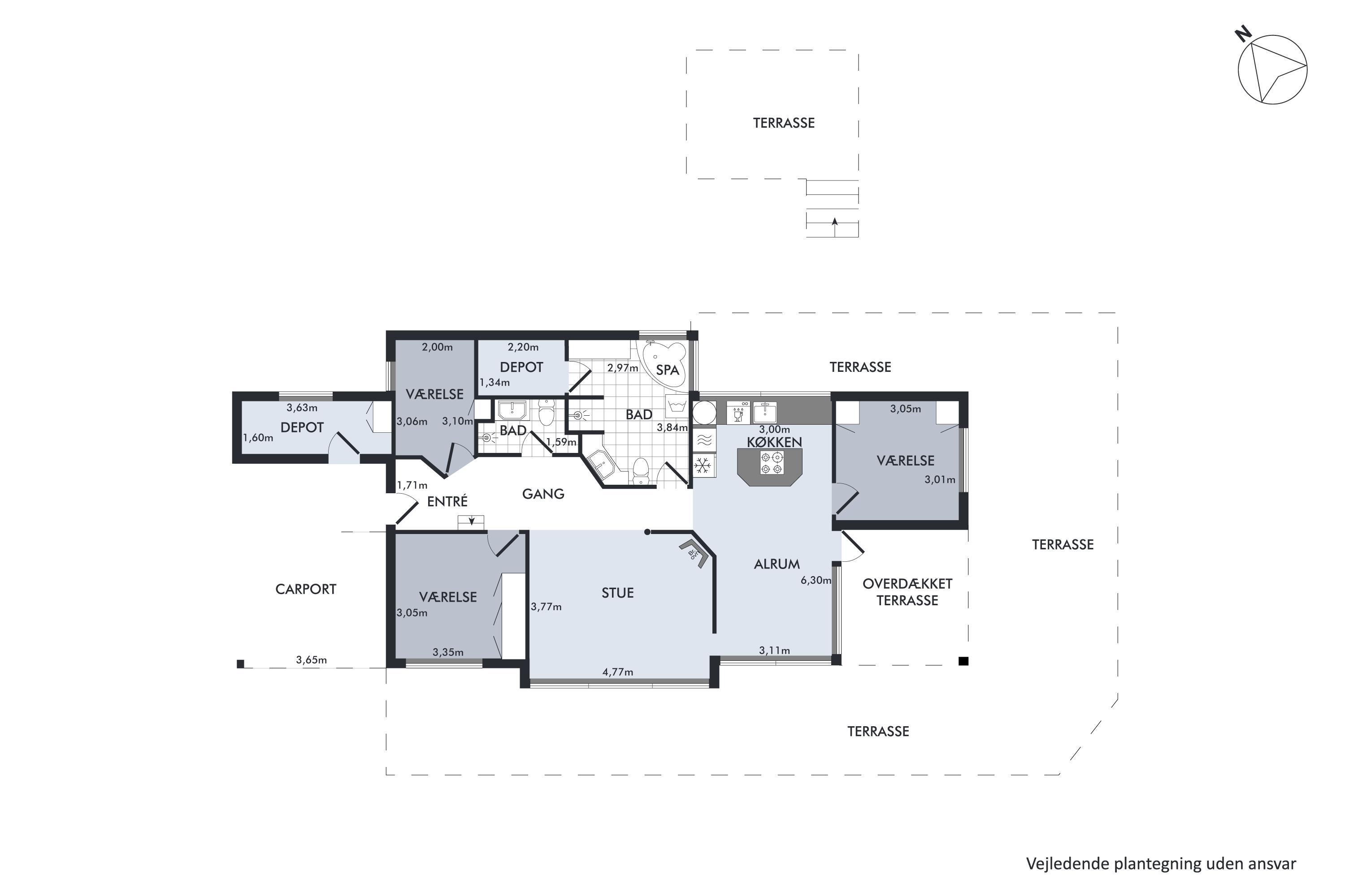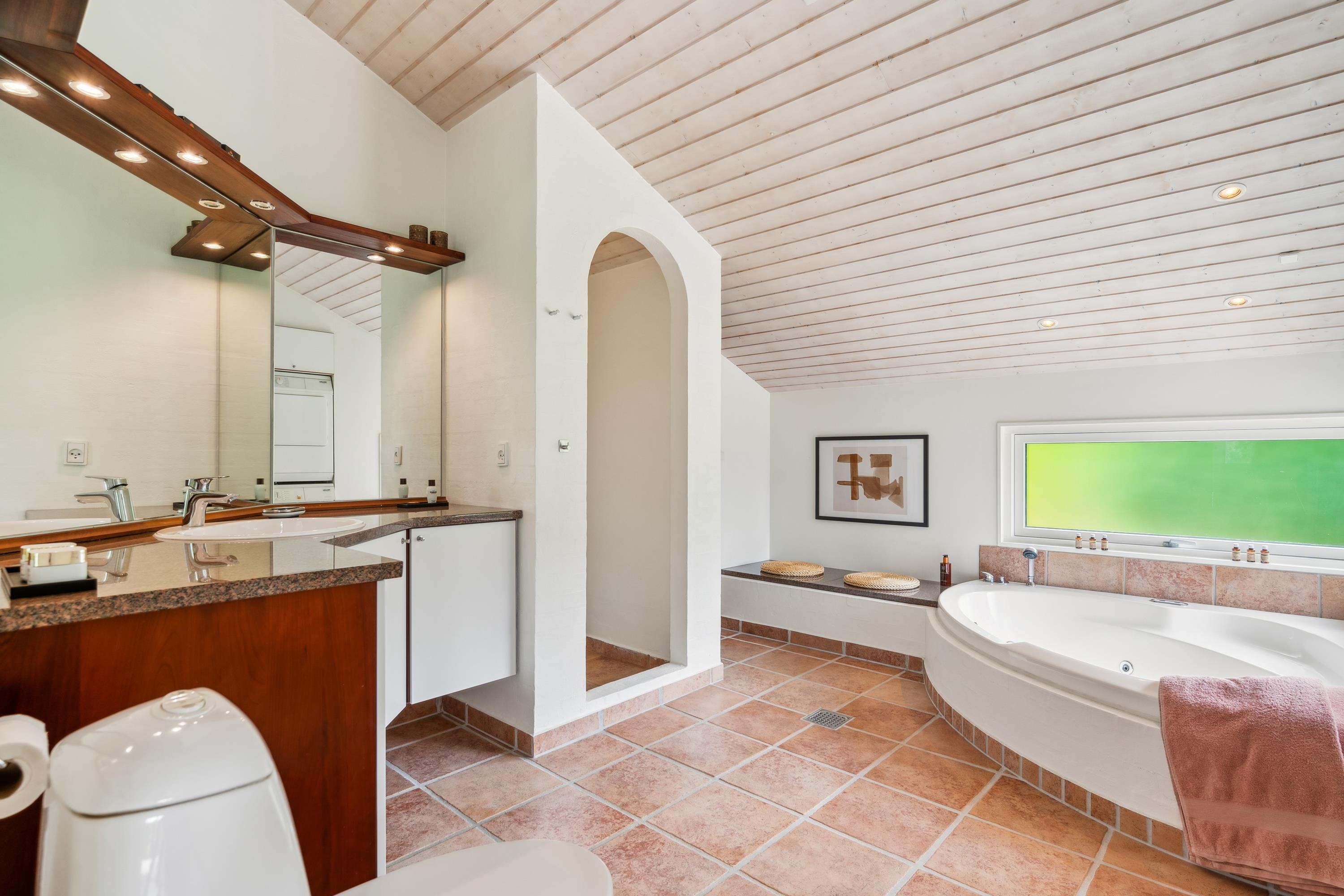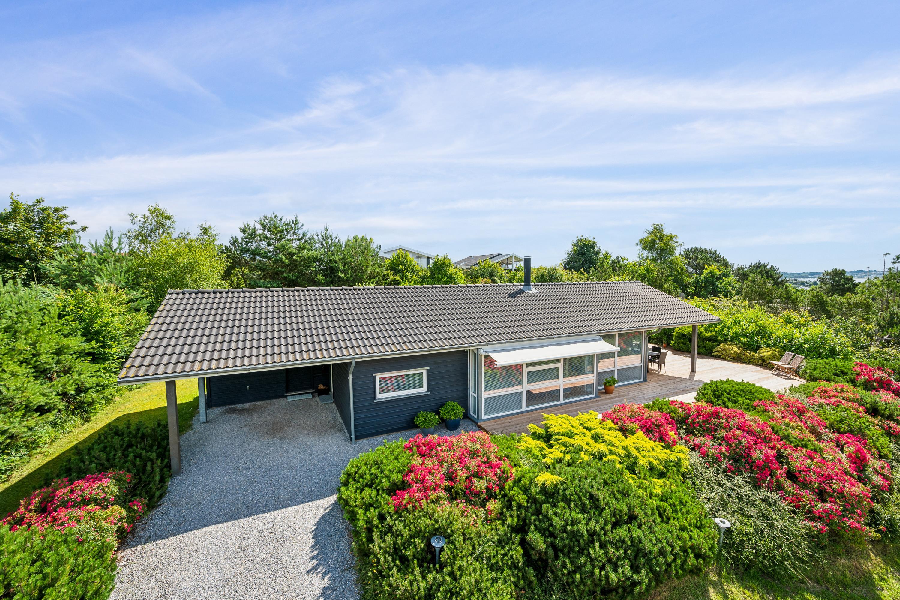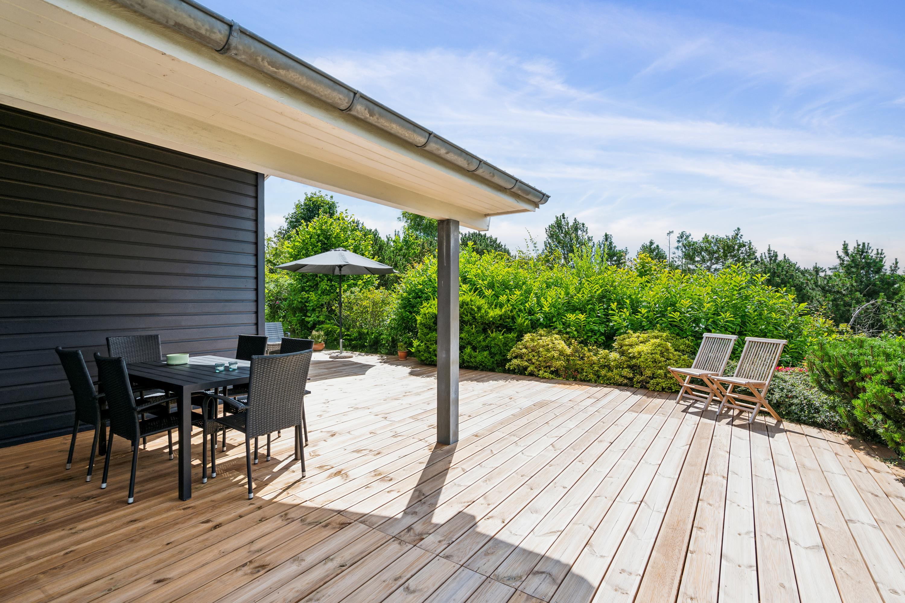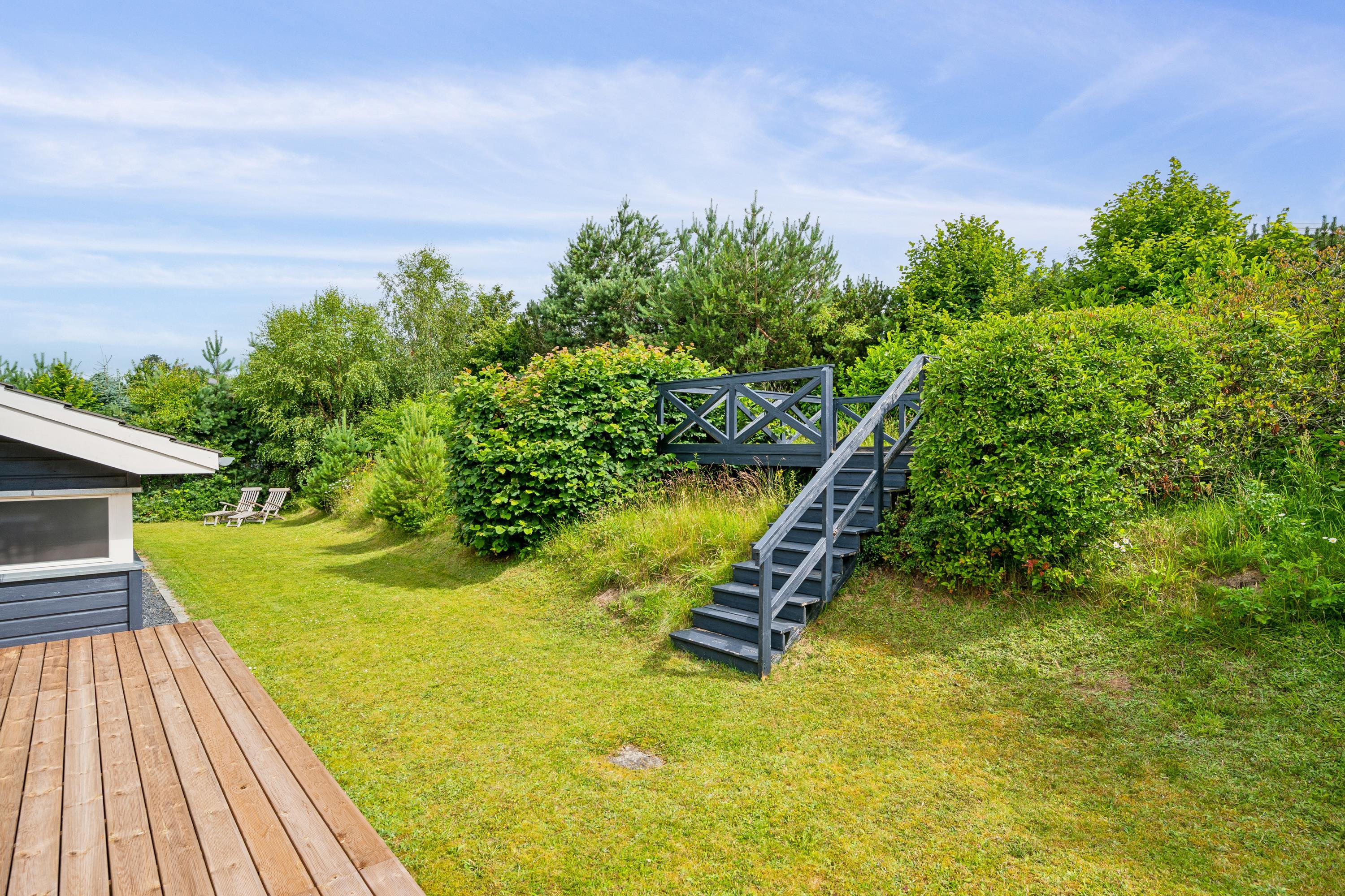Situated on an elevated plot with a breathtaking view of the surrounding area, this well-maintained and stylish holiday home offers the perfect setting for a relaxing vacation. The bright and cozy living room is tastefully furnished with comfortable seating, a heat pump, and a wood-burning stove. Adjacent to the living room is a charming dining area with direct access to a covered terrace. The modern and well-equipped kitchen, which includes a dishwasher and a kitchen island, is conveniently connected to the dining area.